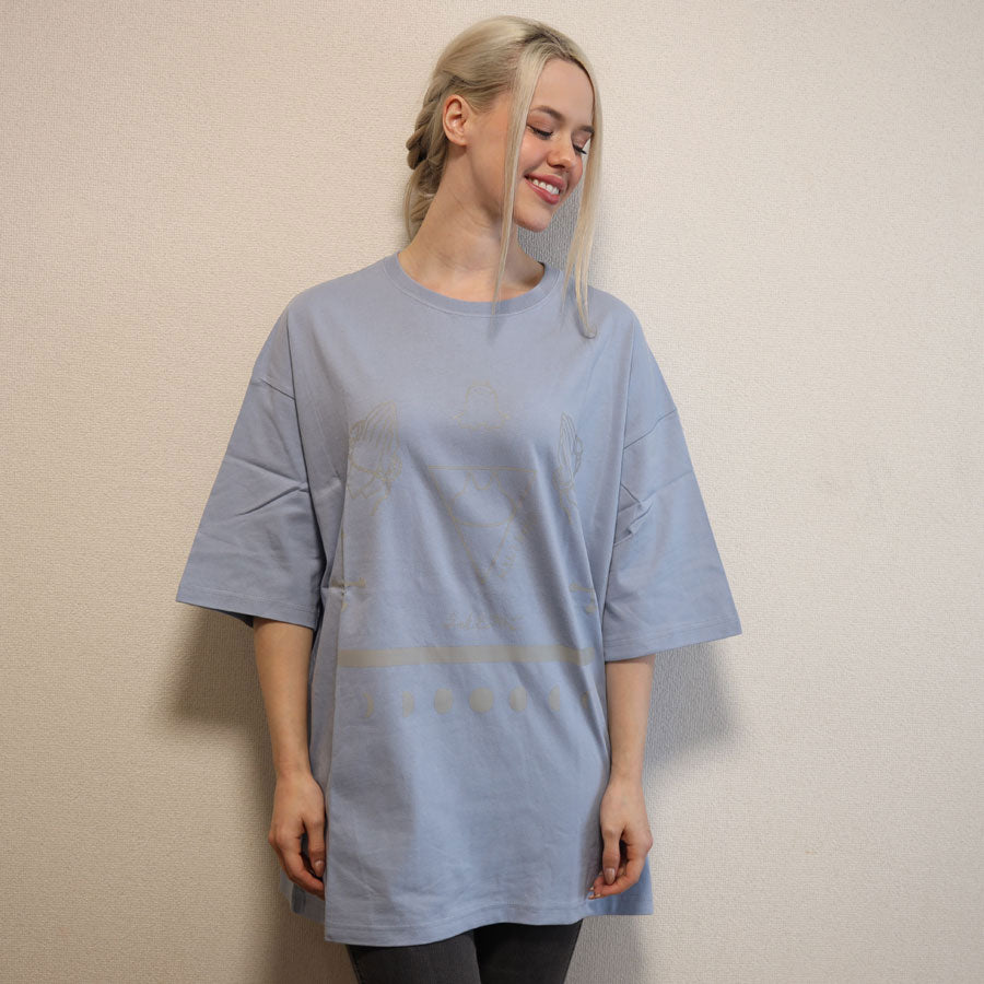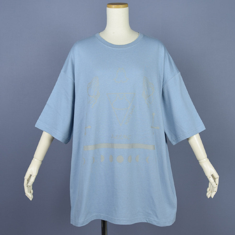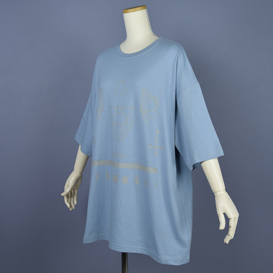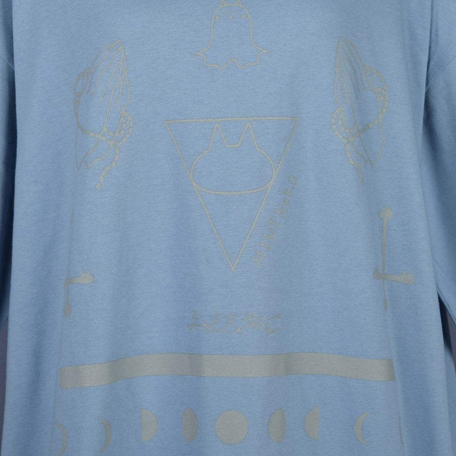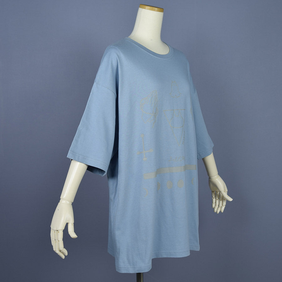 A cut -and -sew featuring graphics that incorporate motifs often used in tattoos, such as prayer hands, ghosts, and moon.