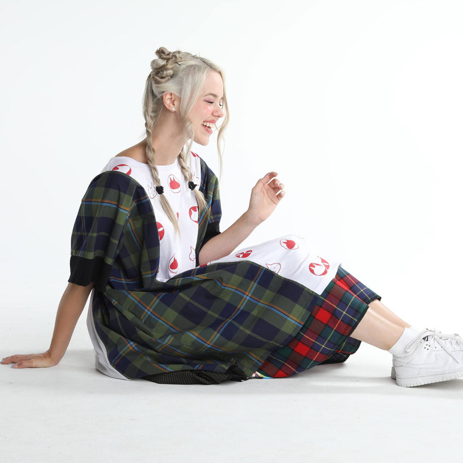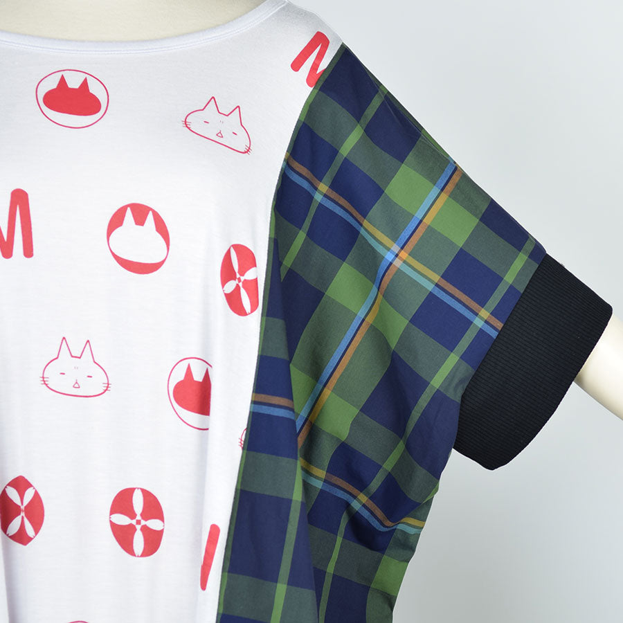 A wide silhouette cut -and -sew that combines the original textile and rib fabric.
