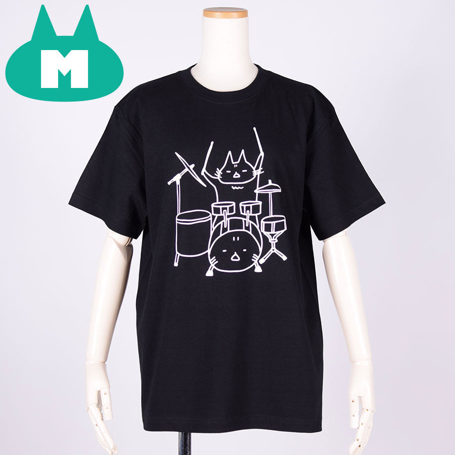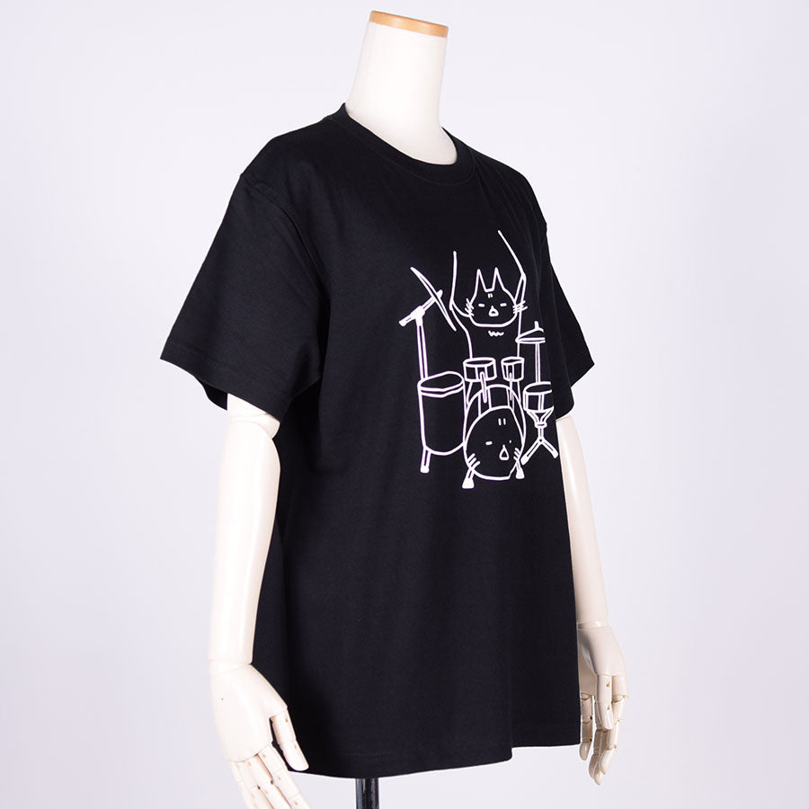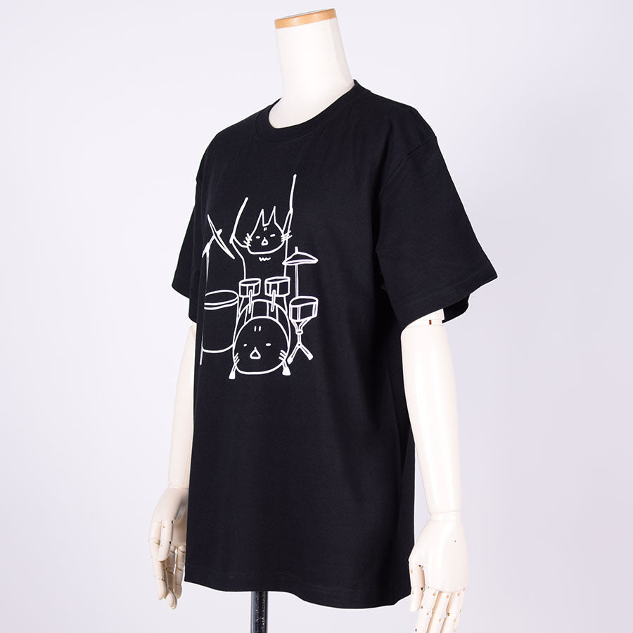 A T -shirt that prints a cat and a cat that pours young energy into a drum.