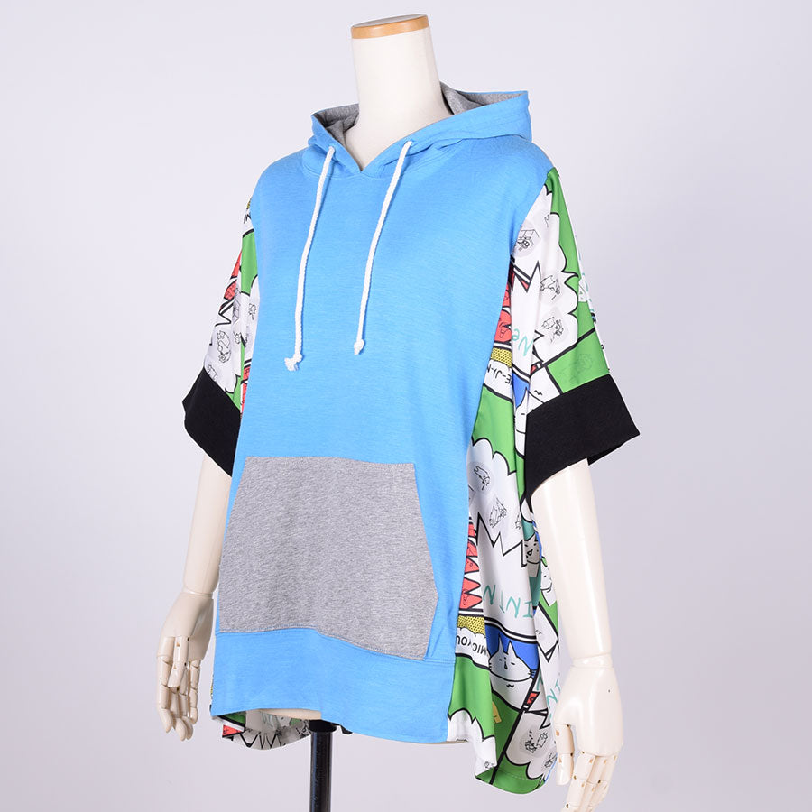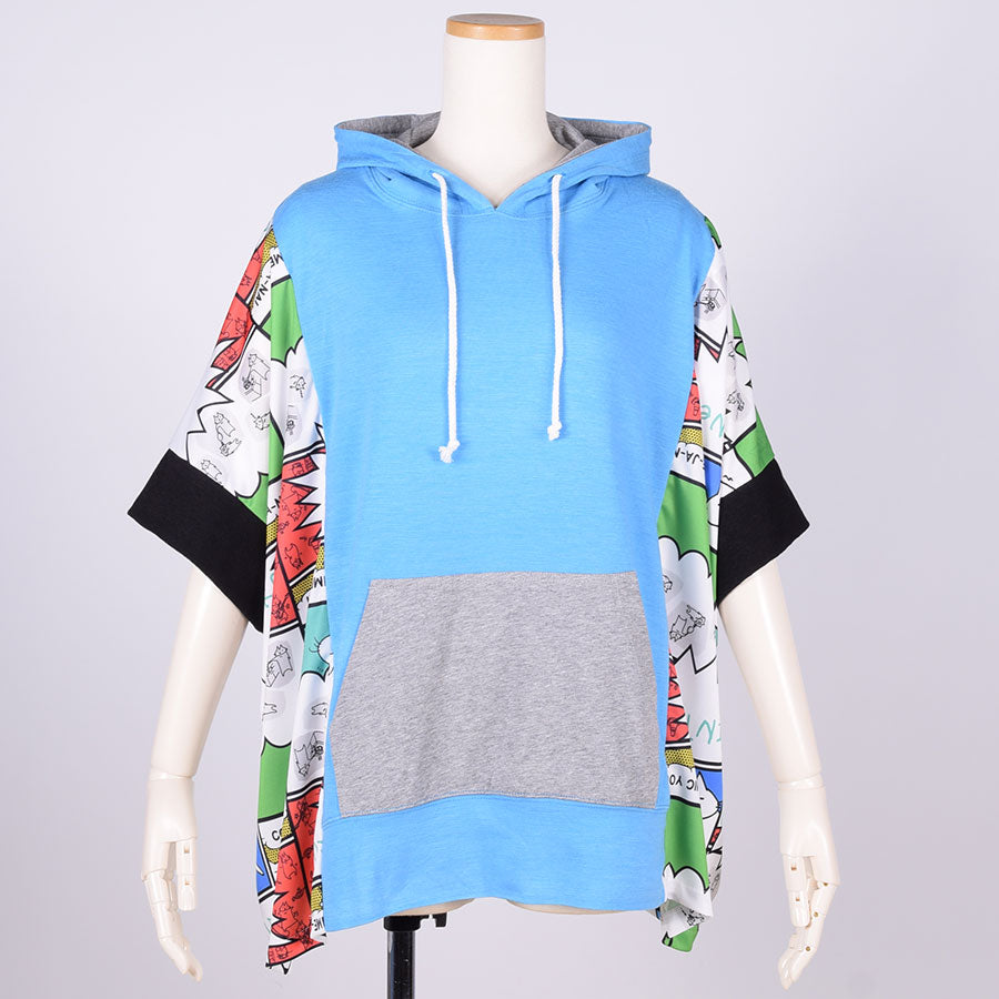 A unique tops made by combining various fabrics with pullover parkers.