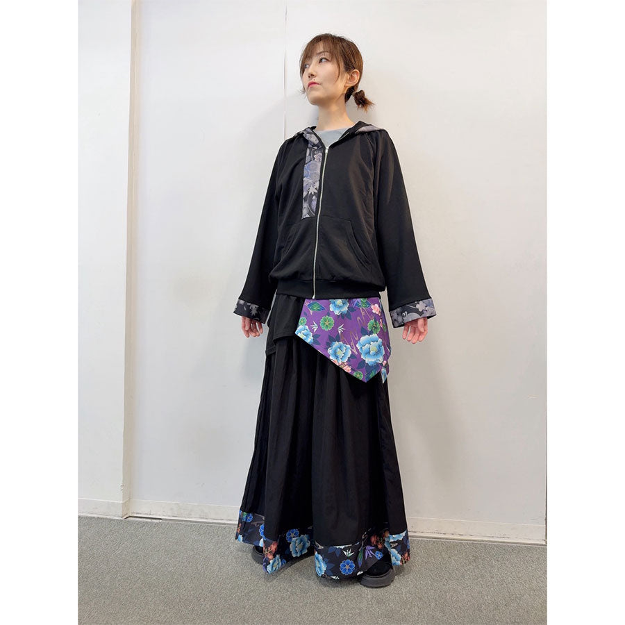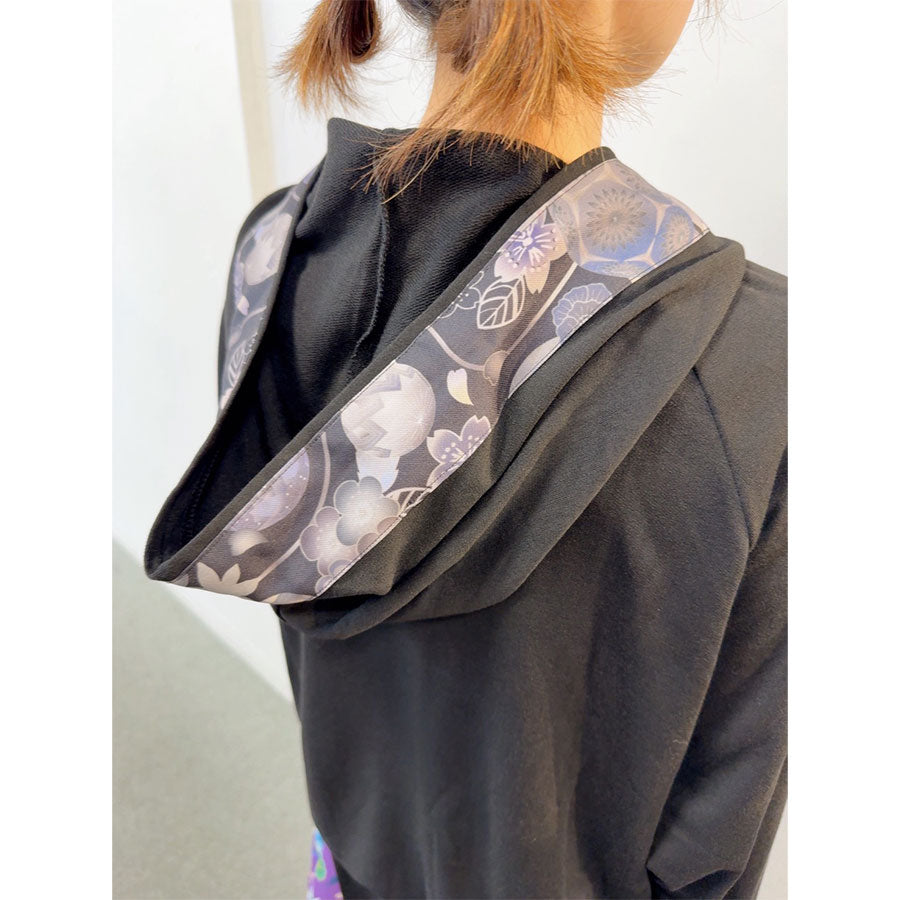 A hoodie with gouk's original Japanese pattern, hanging from the top of the right pocket around the hood and the cuffs.