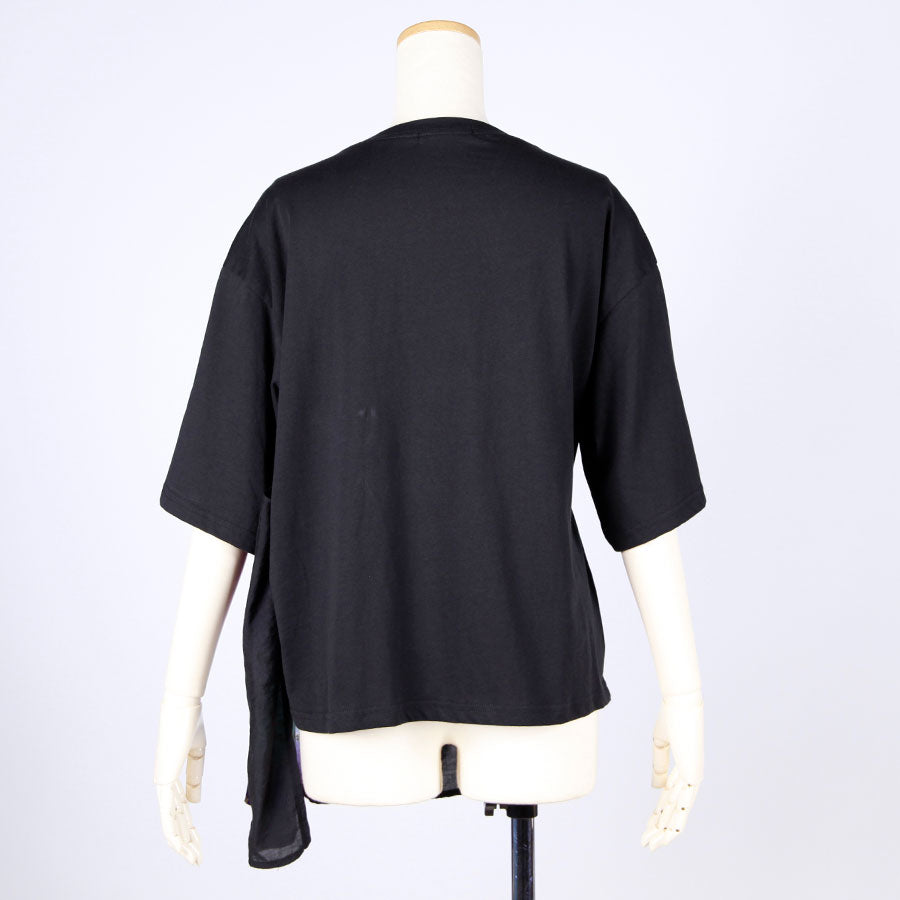 This top is a half-finished look with a front viewing style and another transparent piece of fabric on the left side.