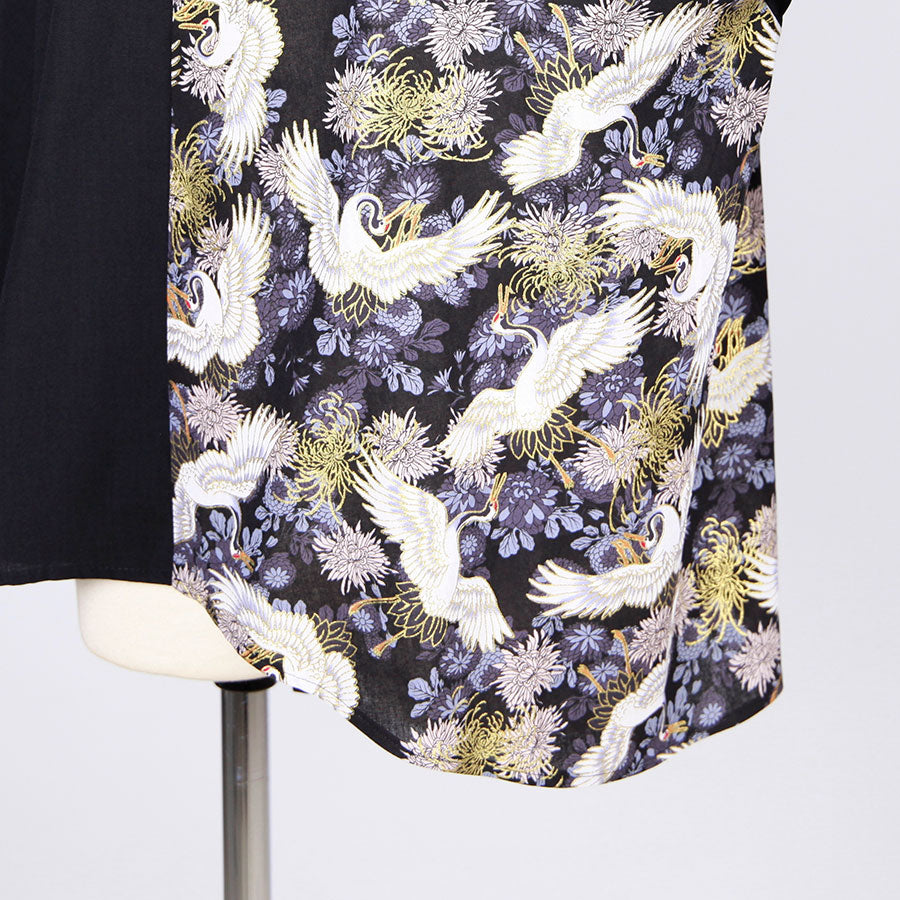 A top with a Japanese crane pattern that looks like it's dancing around the front body, and it's a wide look inside the chrysanthemums.。