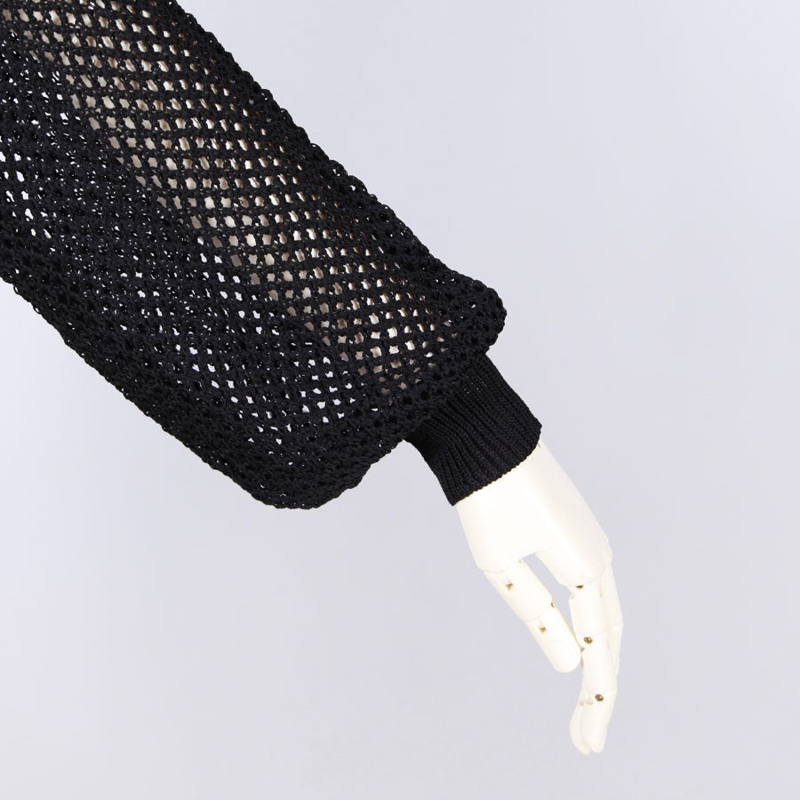 A cardigan that is loosely knitted and transparent.