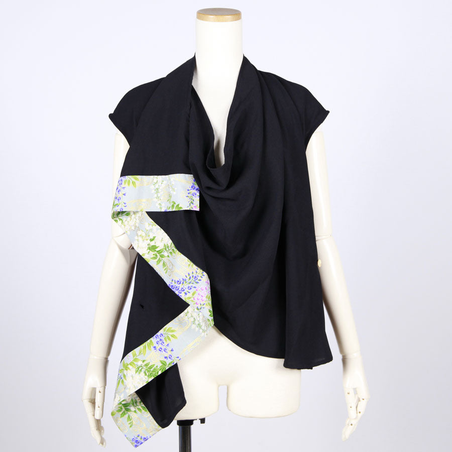 A sleeveless top with a Japanese pattern on the right front edge that has a celadon-color base and white, purple, and pink wisteria drawn on a wave pattern.