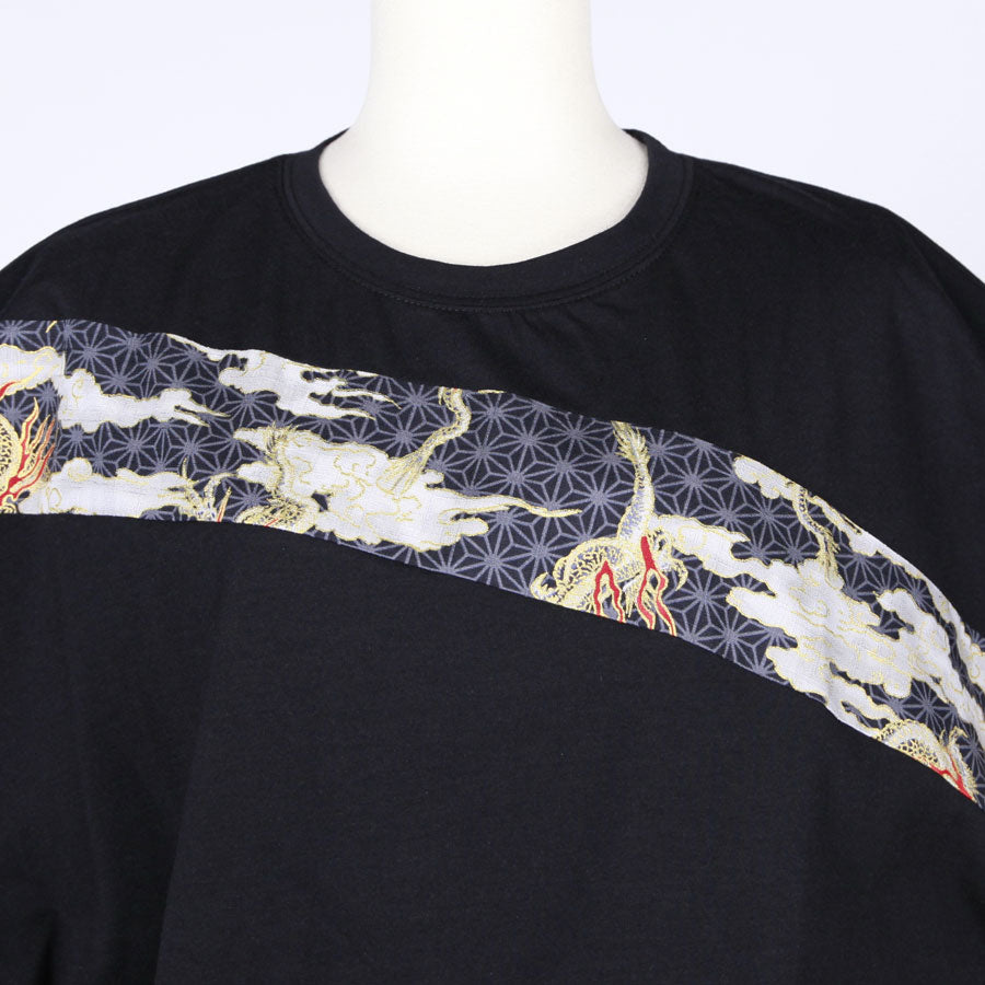 This top has a men's-like image with a Japanese pattern depicting a golden dragon flying like a guardian angel with clouds on a hemp leaf in the dark, which has been changed from sleeve to sleeve.