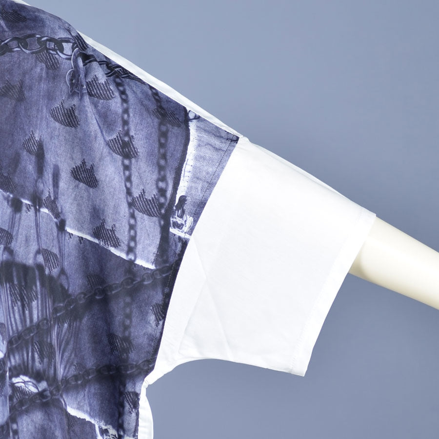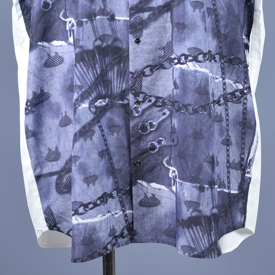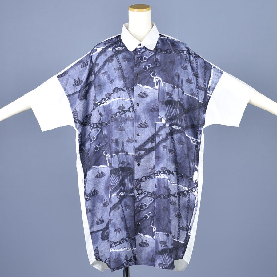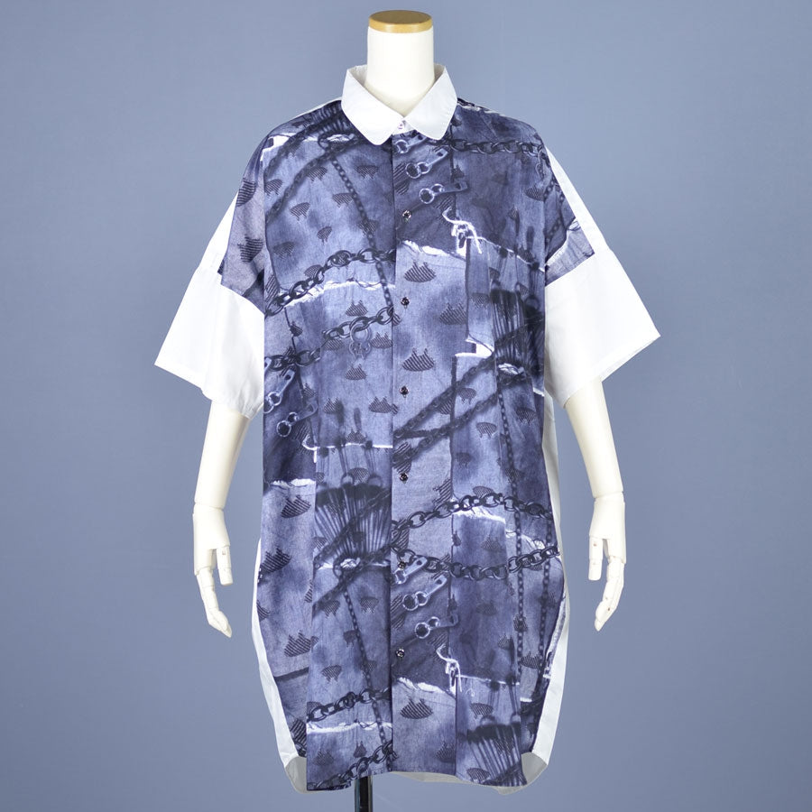生地の端切れやチェーンをデジタルコラージュしたパンクテイストなオリジナルテキスタイルを使用した半袖ロングシャツ。