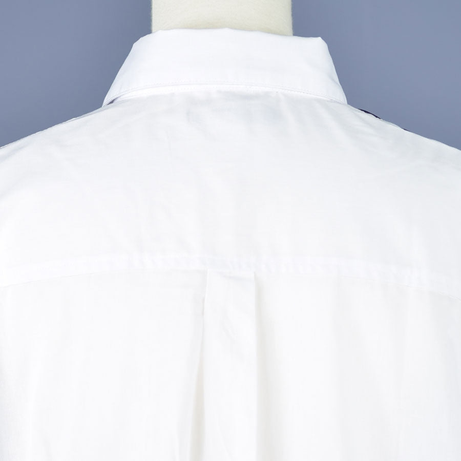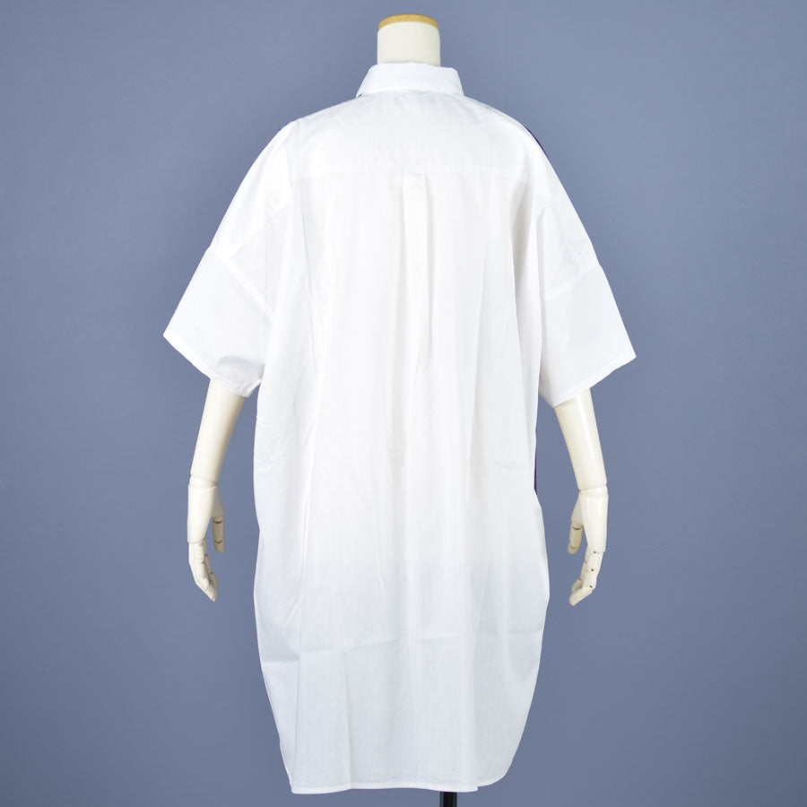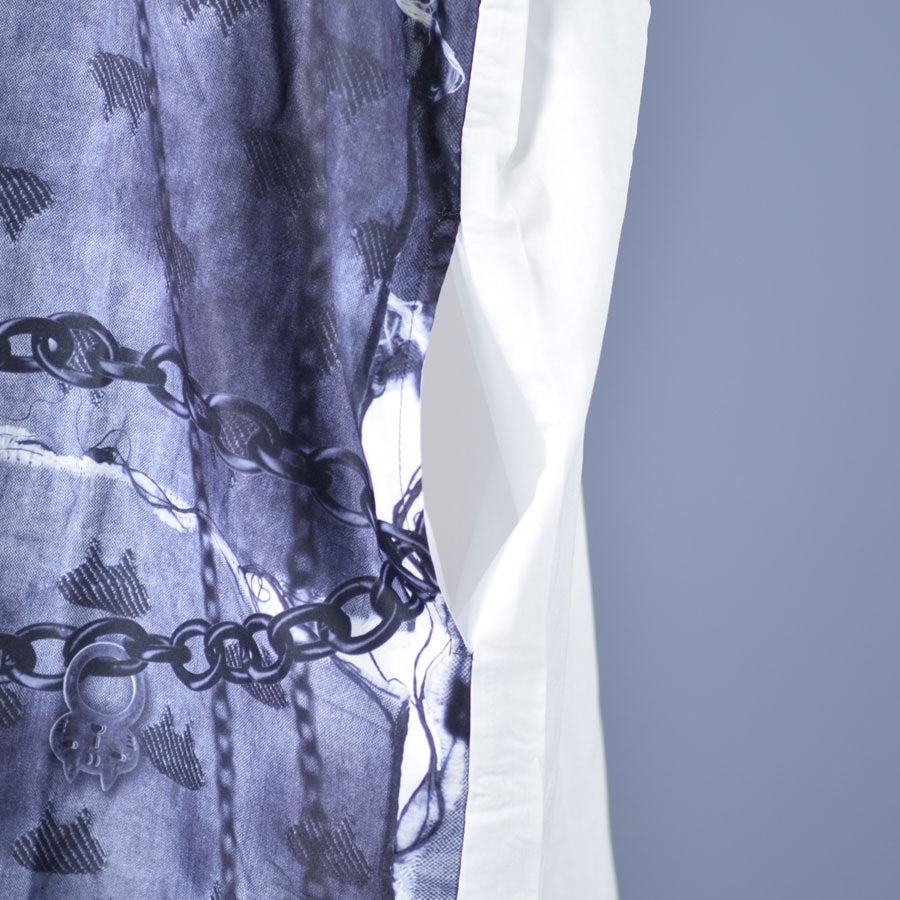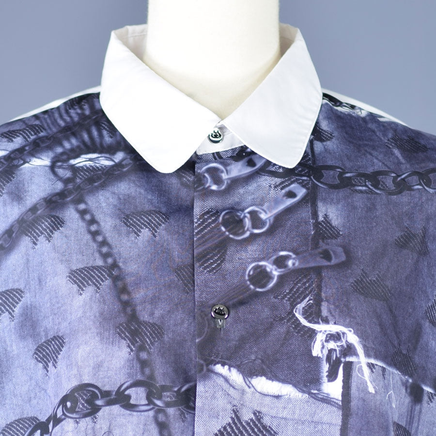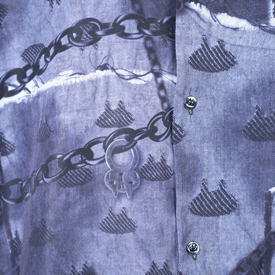 生地の端切れやチェーンをデジタルコラージュしたパンクテイストなオリジナルテキスタイルを使用した半袖ロングシャツ。
