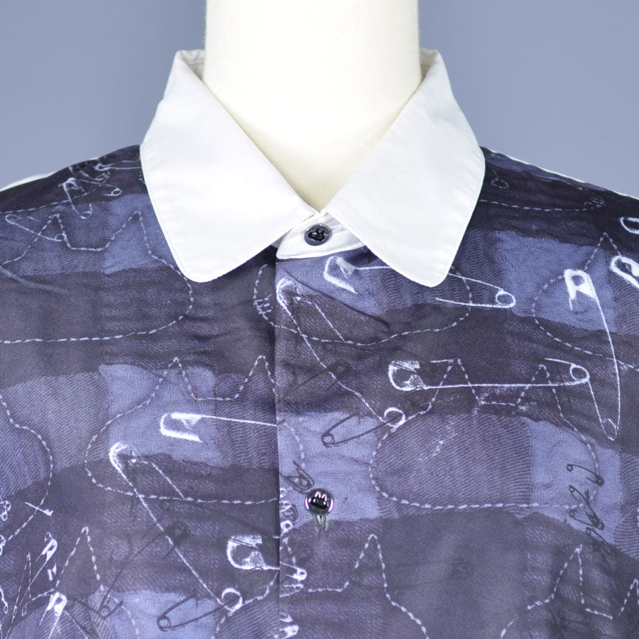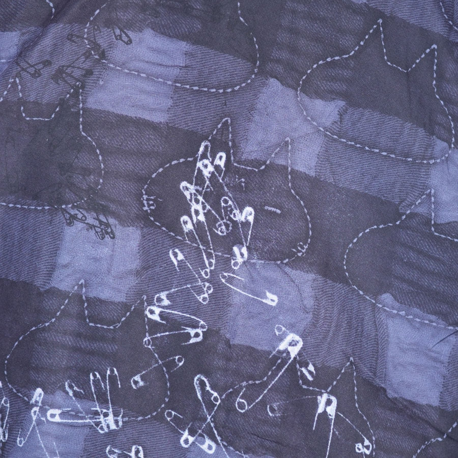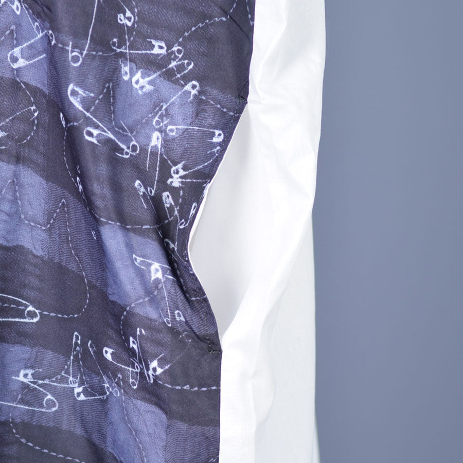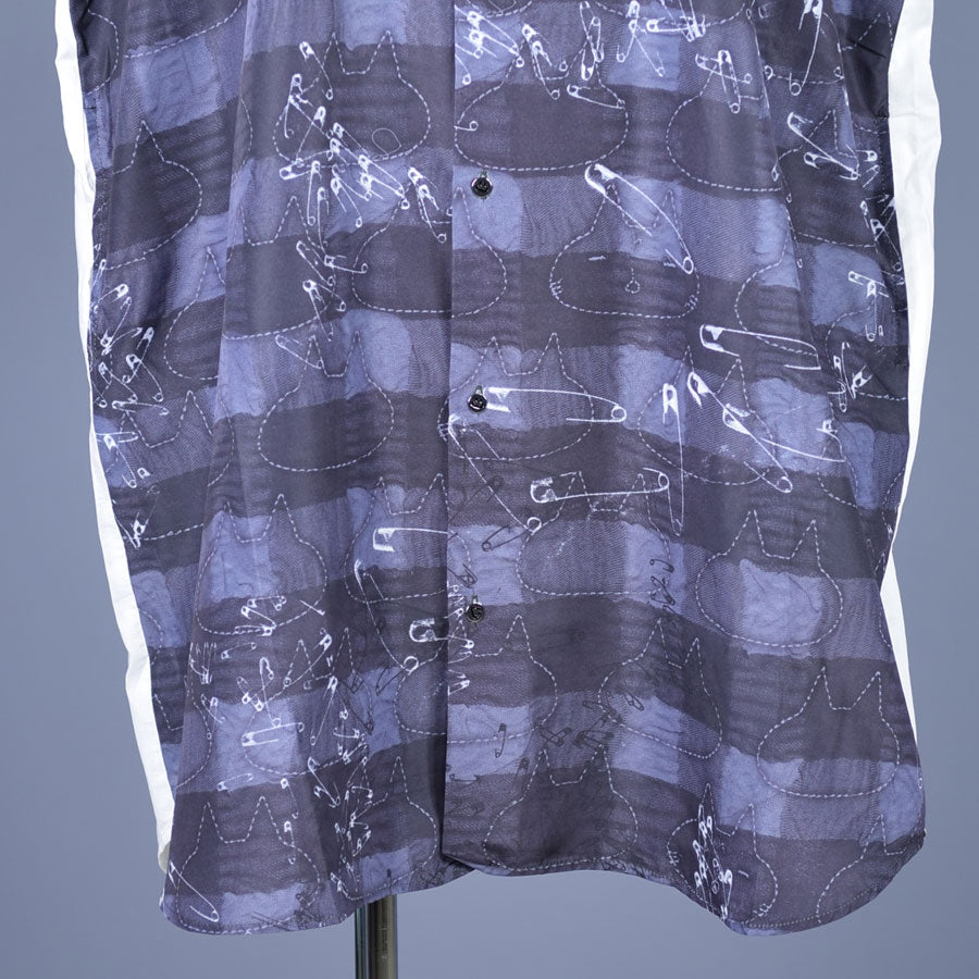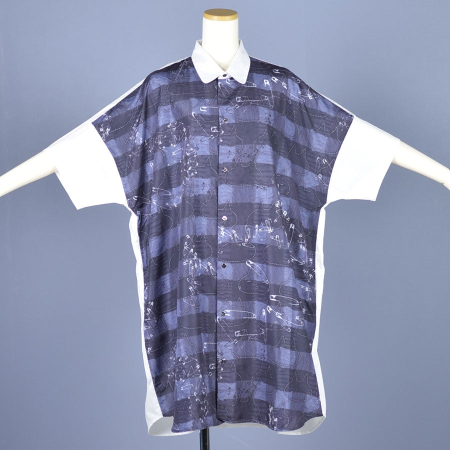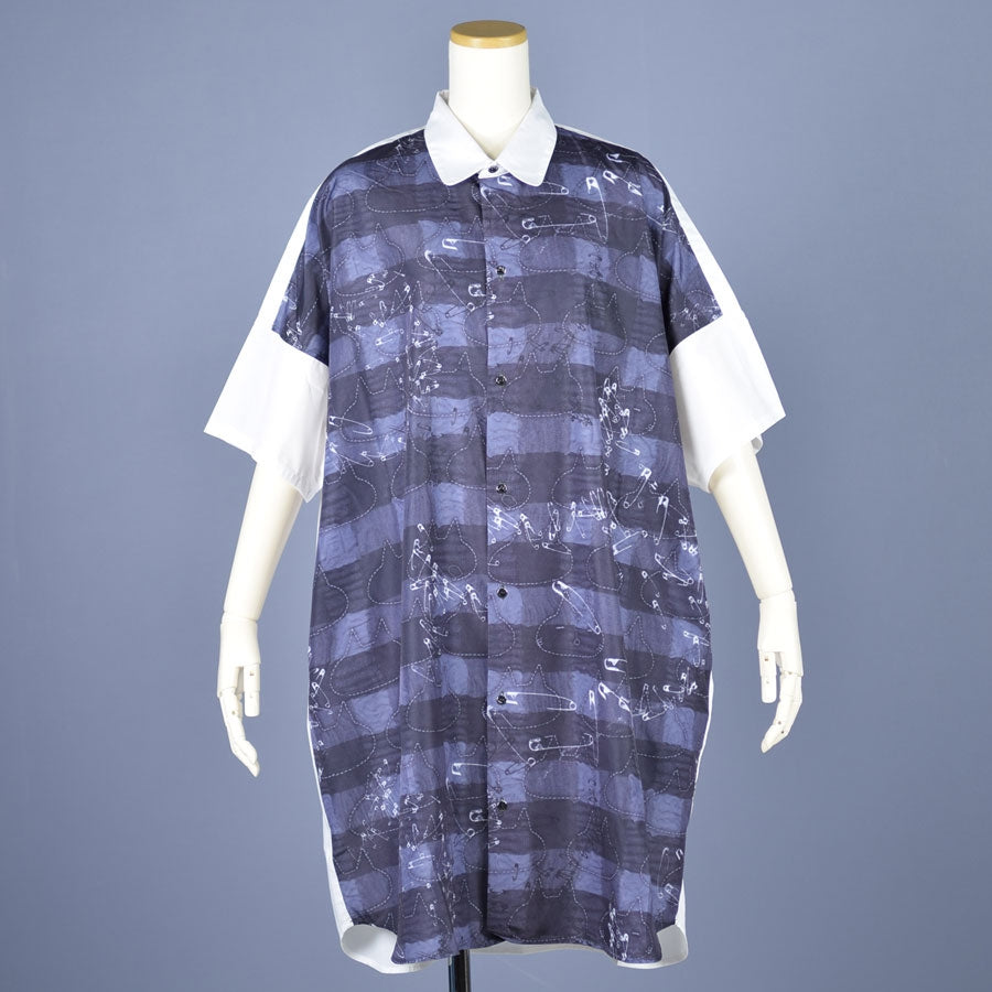 チェック生地の上に安全ピンをデジタルコラージュしたパンクテイストなオリジナルテキスタイルを使用した半袖ロングシャツ。
