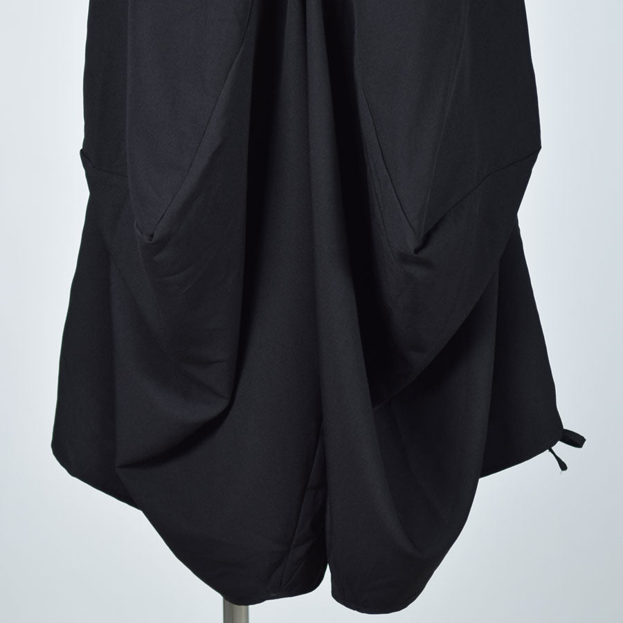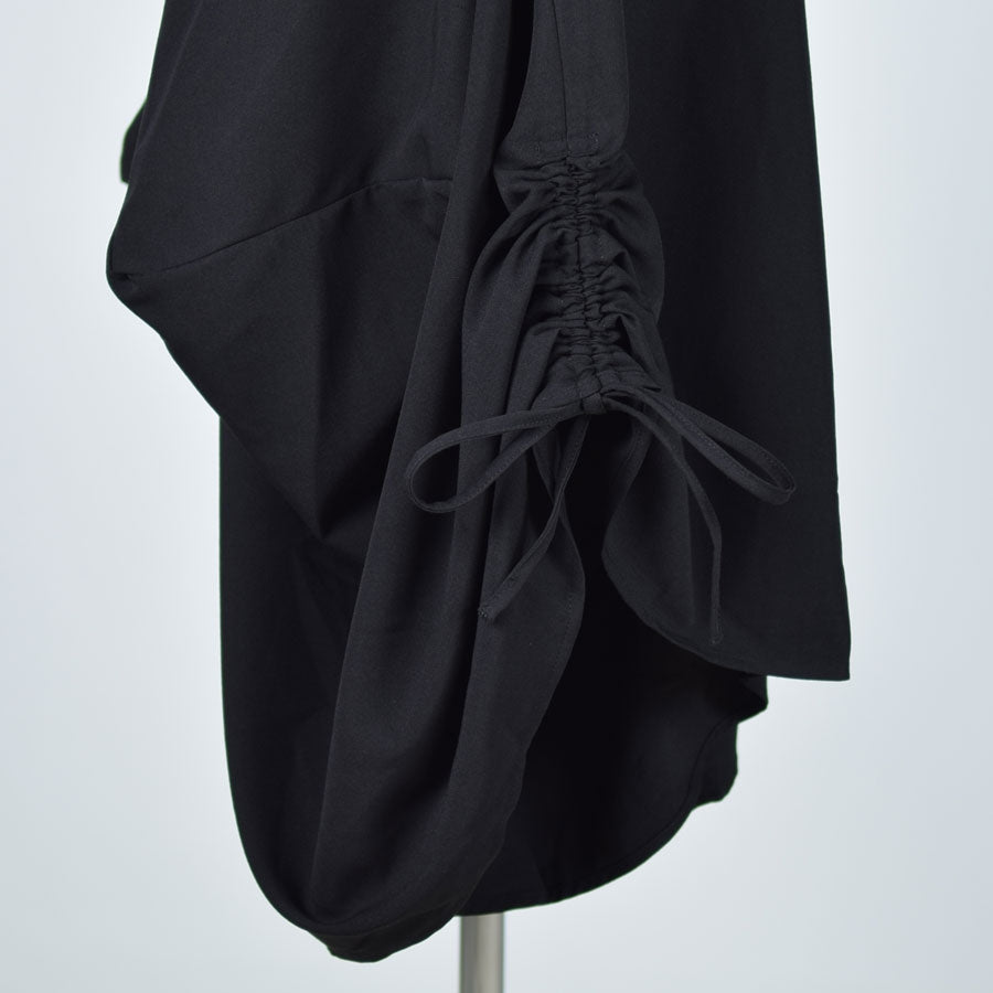 両脇に付いた紐を絞る事で着丈とシルエットが調節できます。
