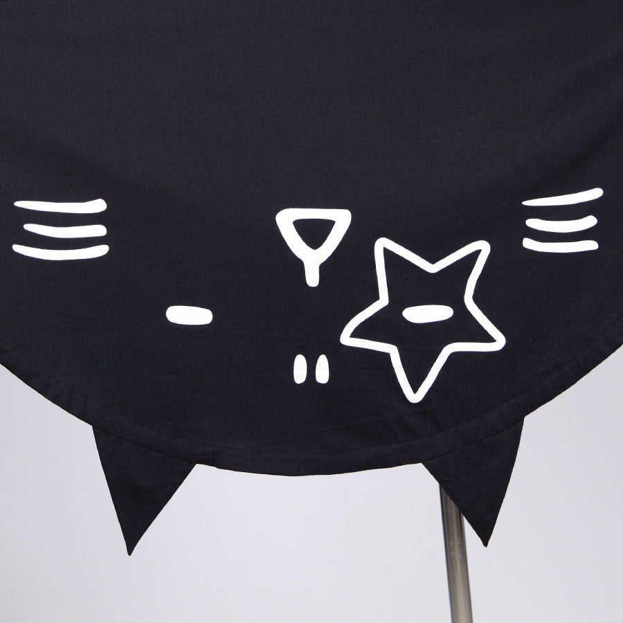 背中の裾には、星形のメイクとネコ耳がトレードマークのキャラクター「ポール」が大胆にプリントされ、ネコのシルエットを表現しています。