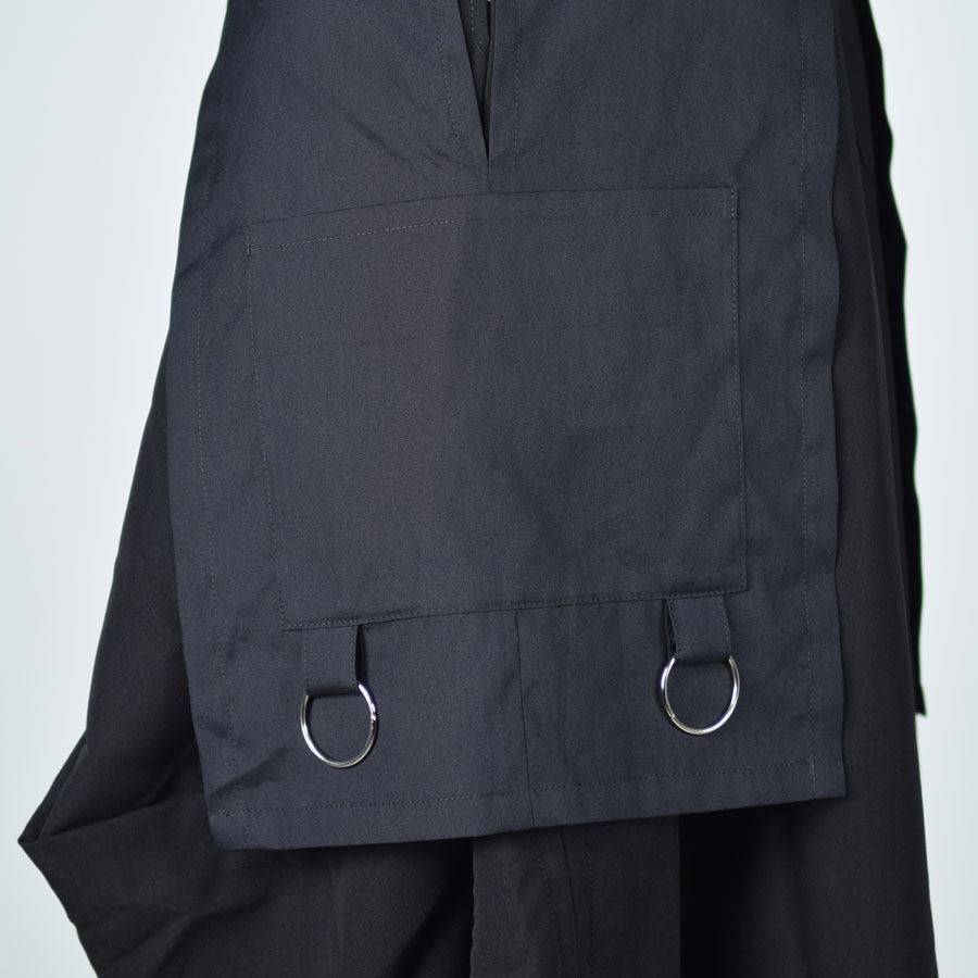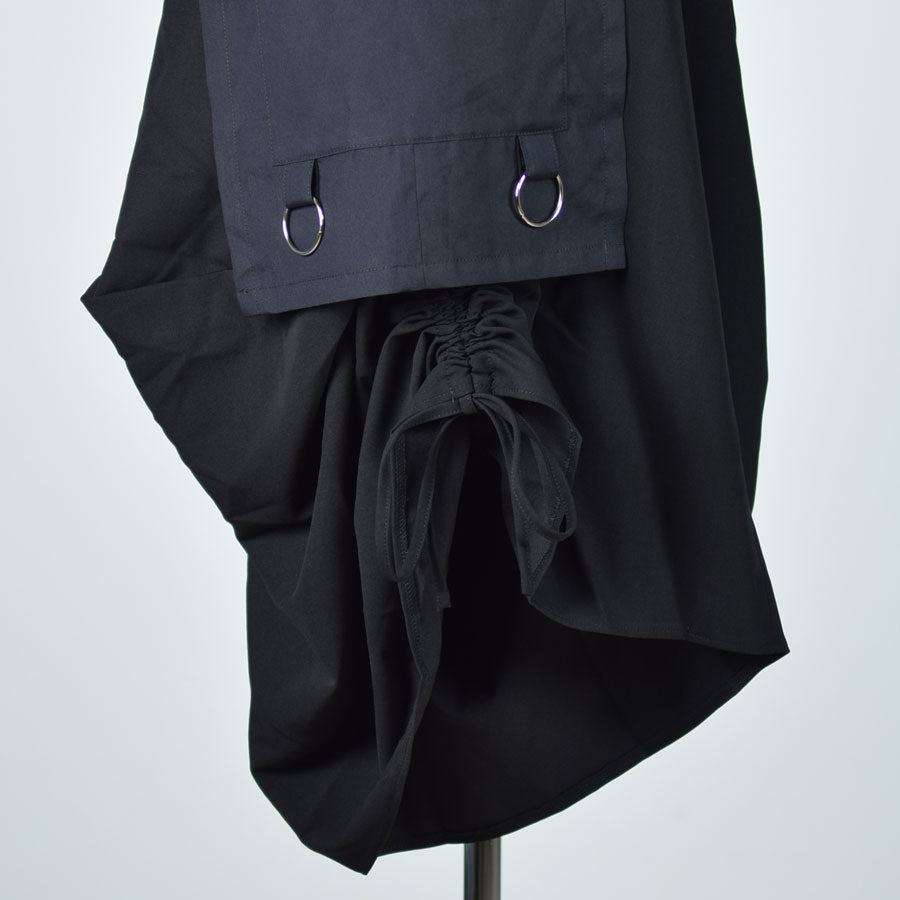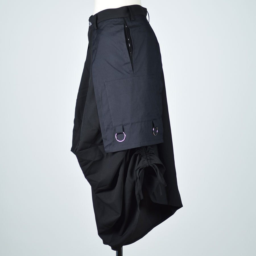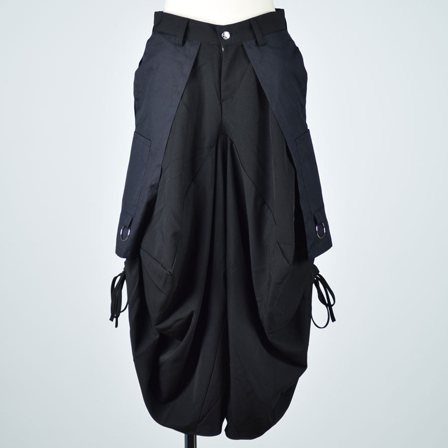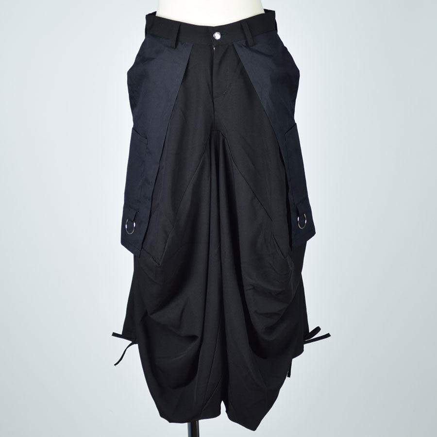 個性的なシルエットのサルエルパンツにエプロン状のパーツを重ね、ボリューム感たっぷりに仕上げました。