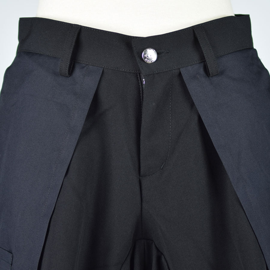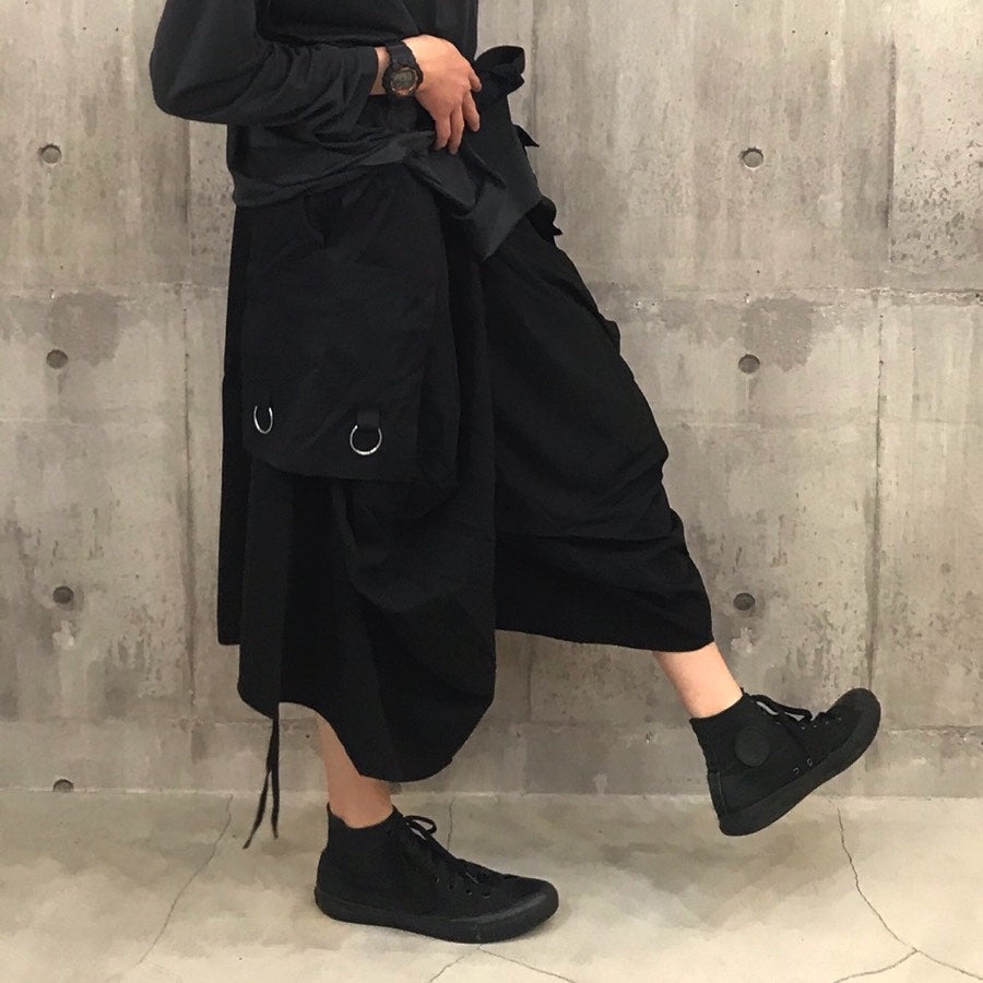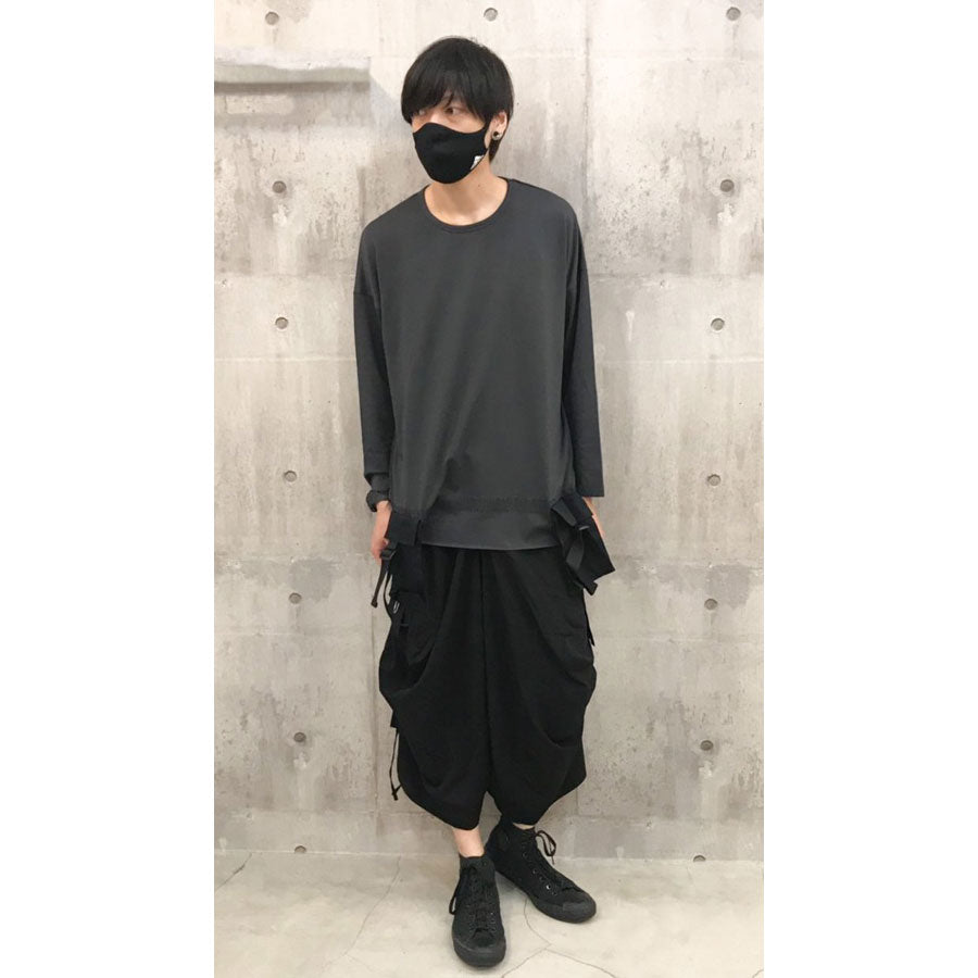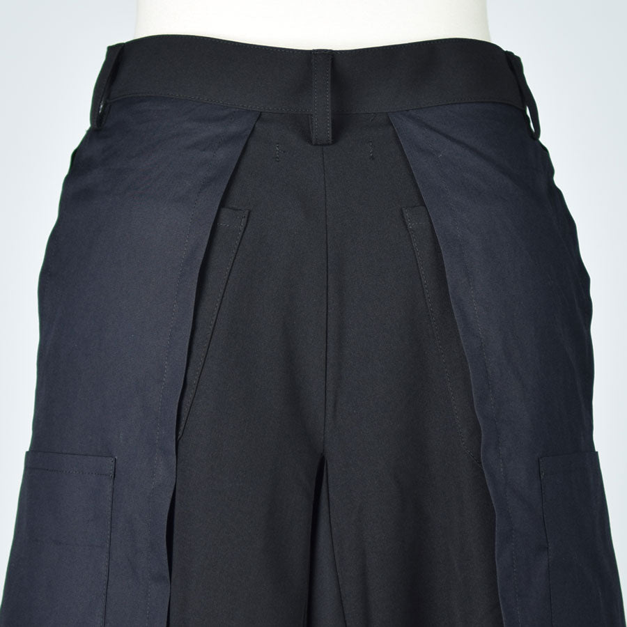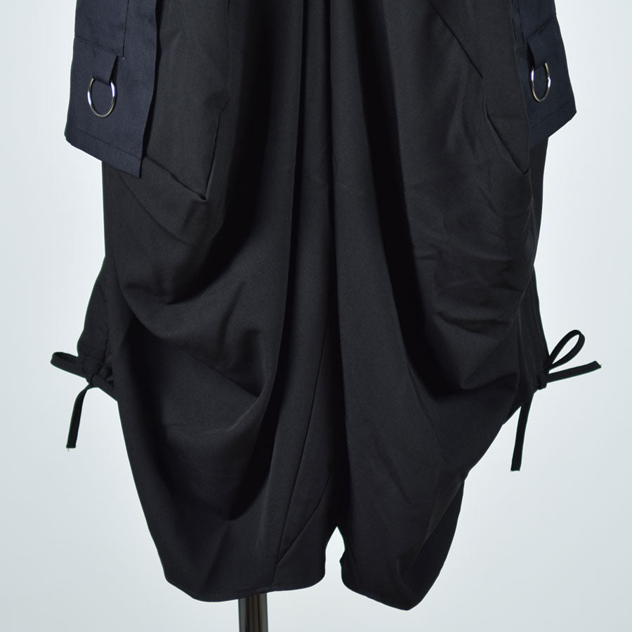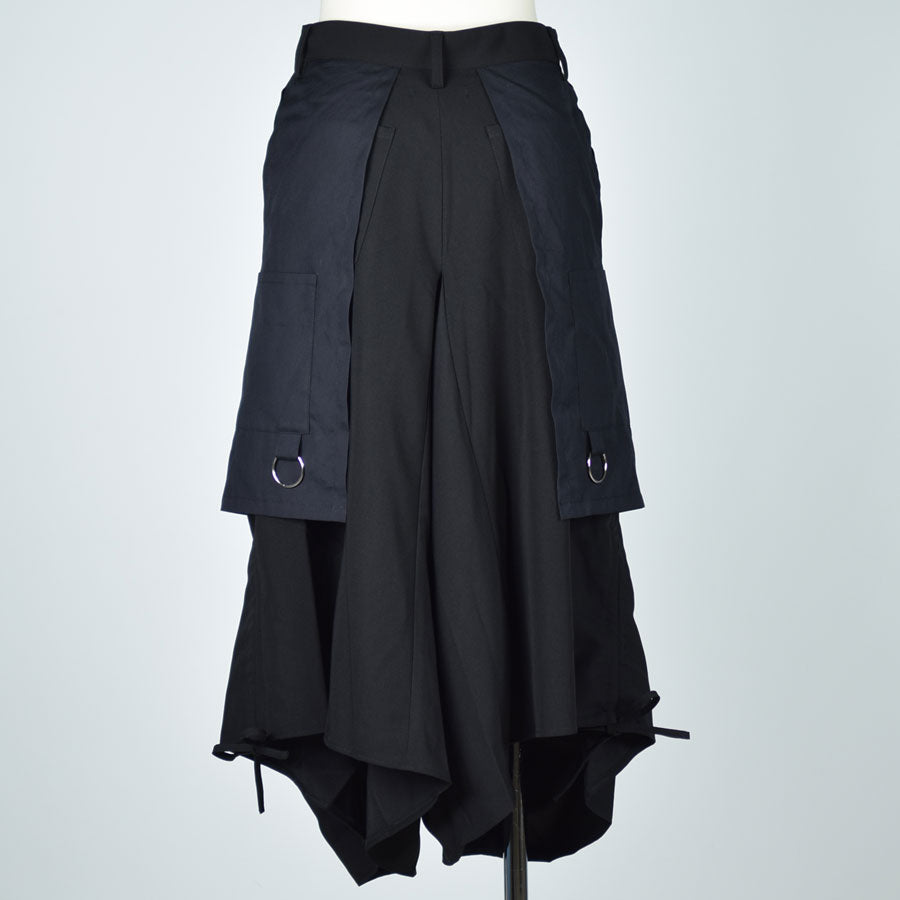 個性的なシルエットのサルエルパンツにエプロン状のパーツを重ね、ボリューム感たっぷりに仕上げました。