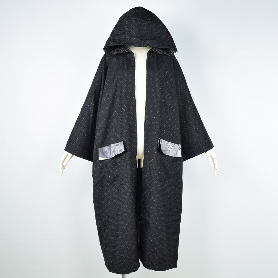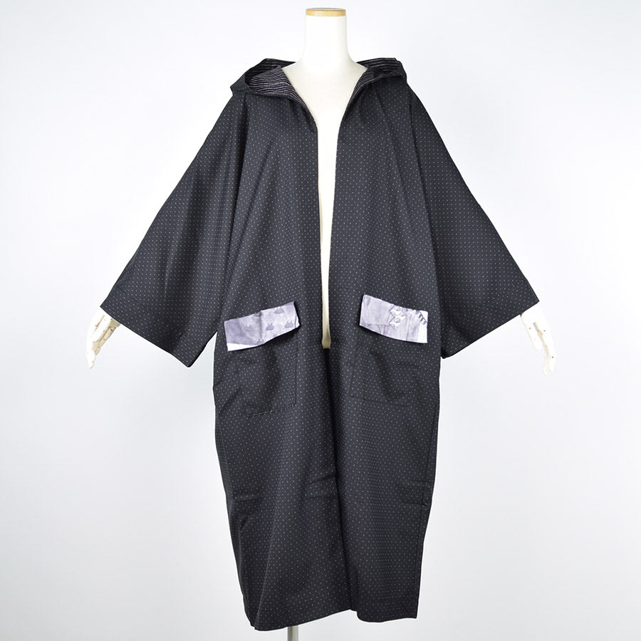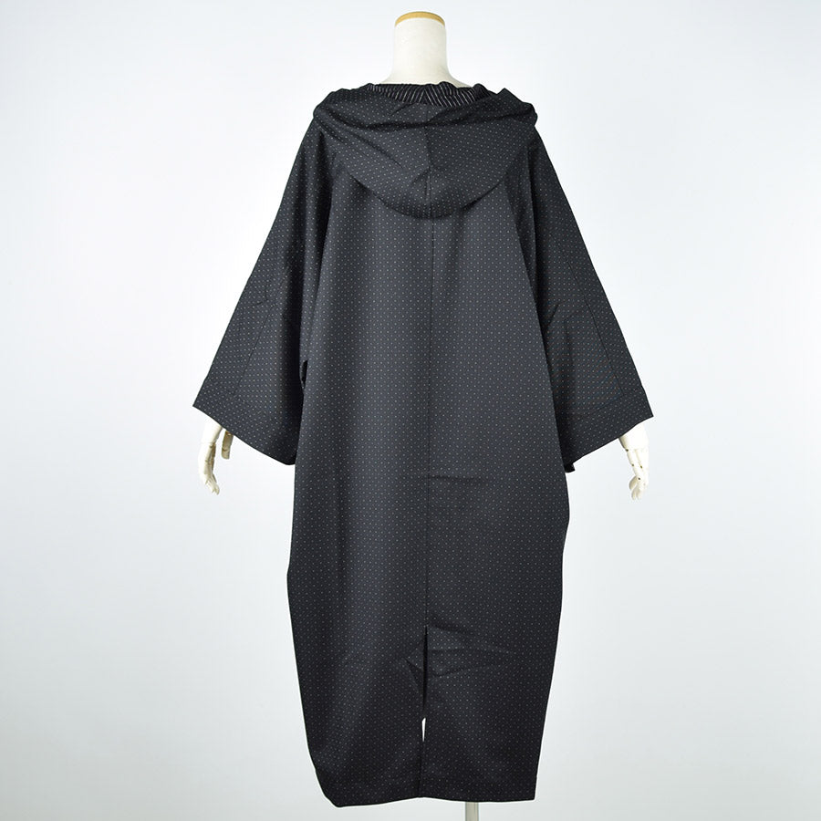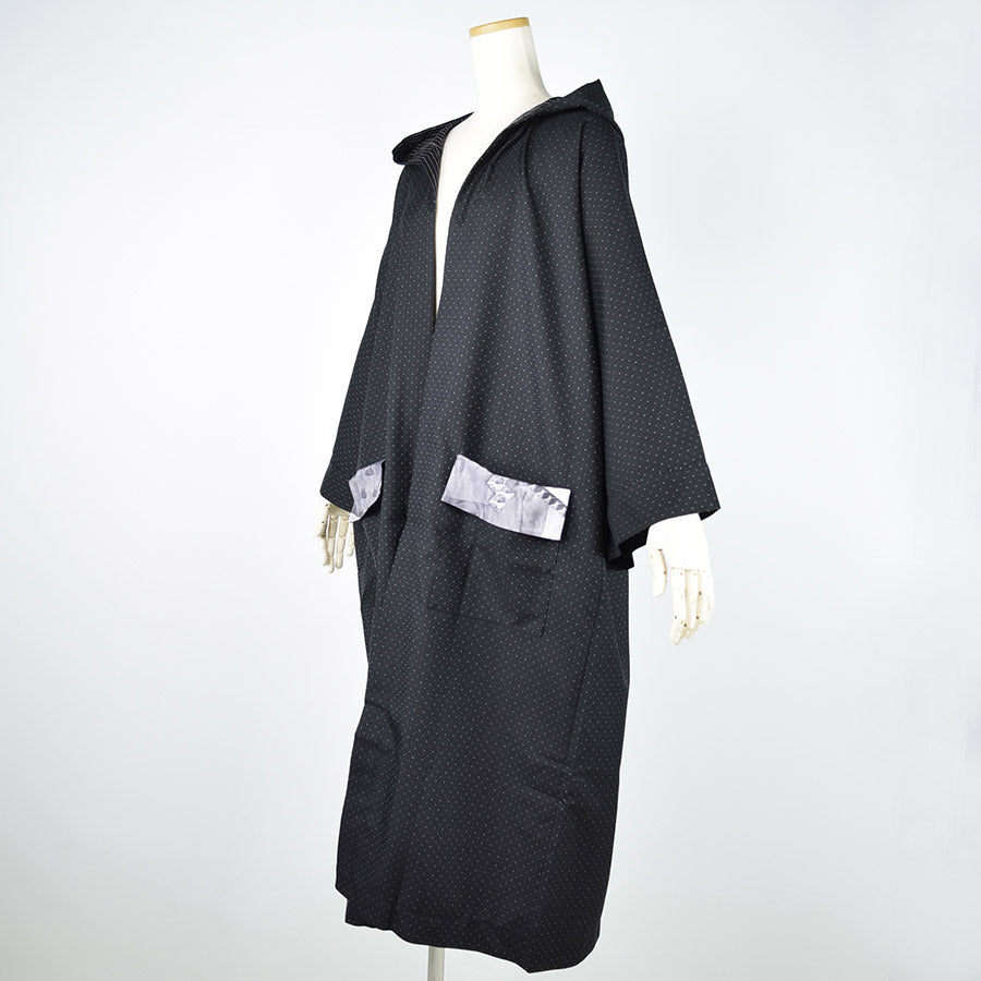 七分丈のドルマンスリーブに直線的なシルエットとキモノのようなニュアンスを取り入れたロングジャケット。
