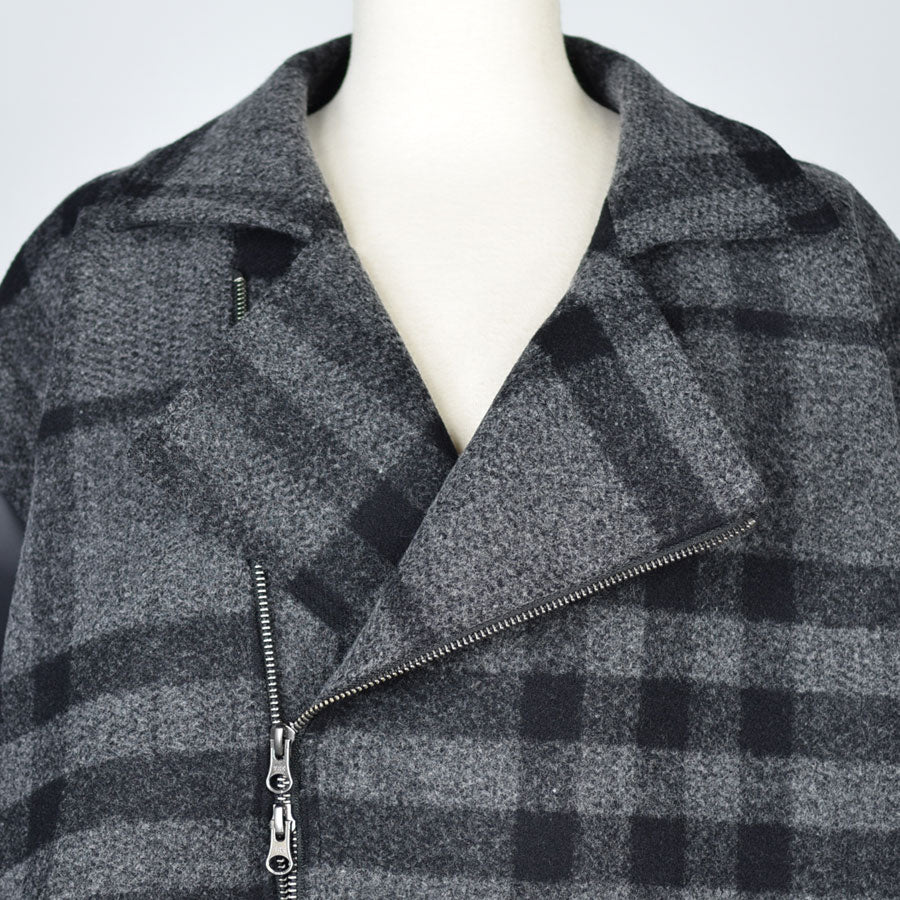 衿にライダースのディテールを取り入れつつ身頃に大胆なドレープを入れる事でオリジナリティを出したアイテムです。
