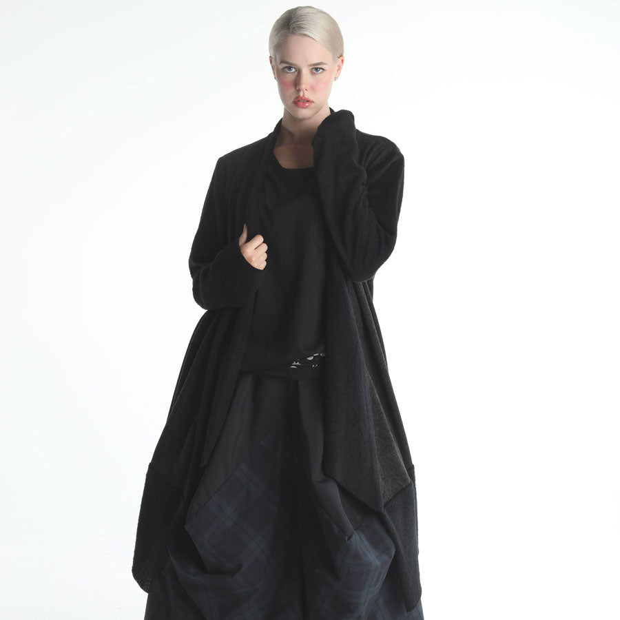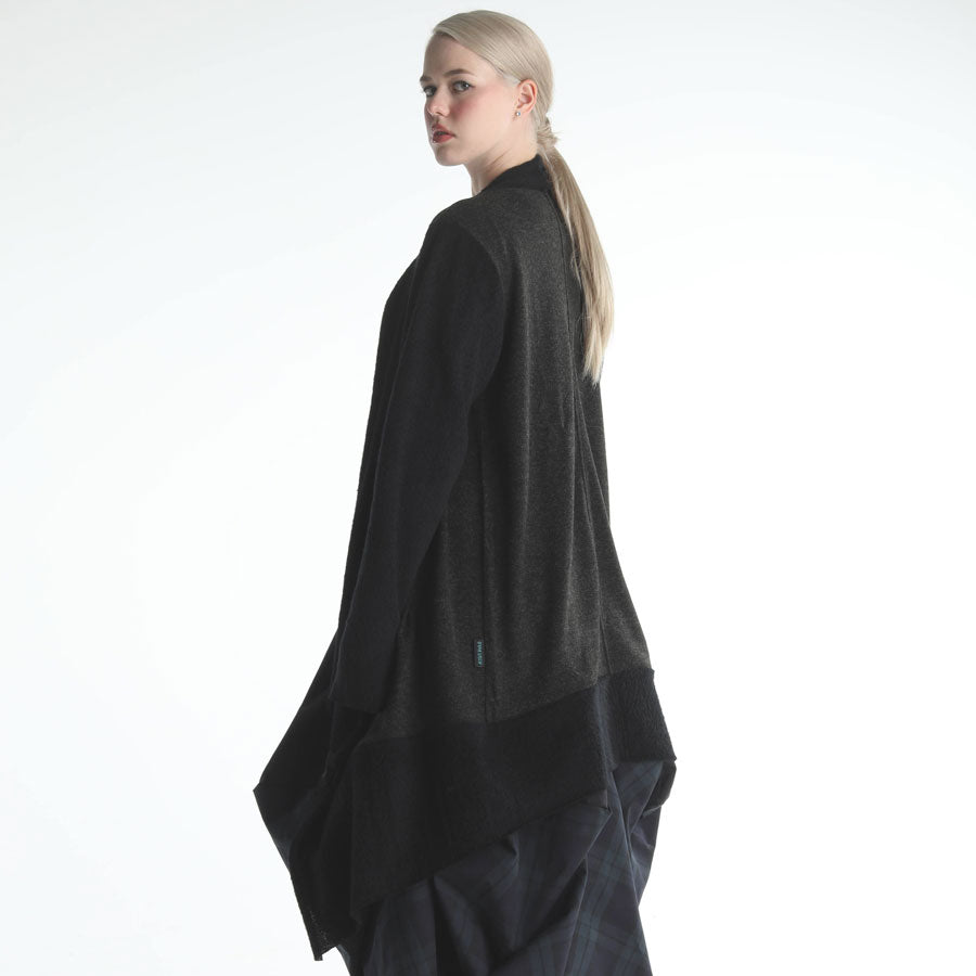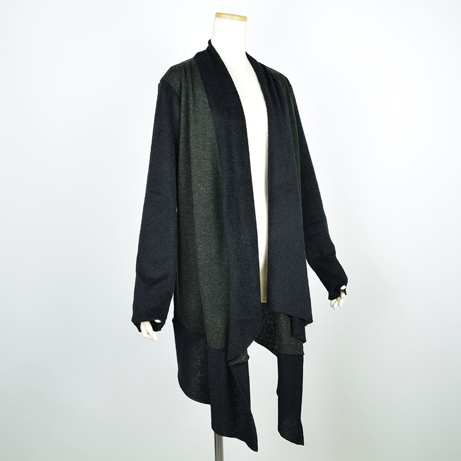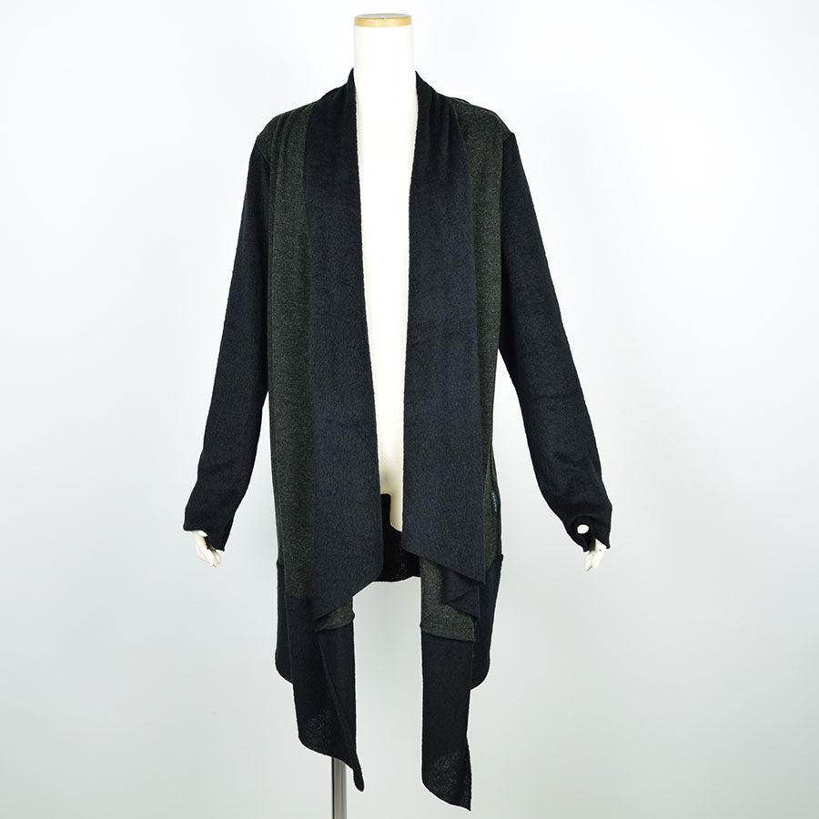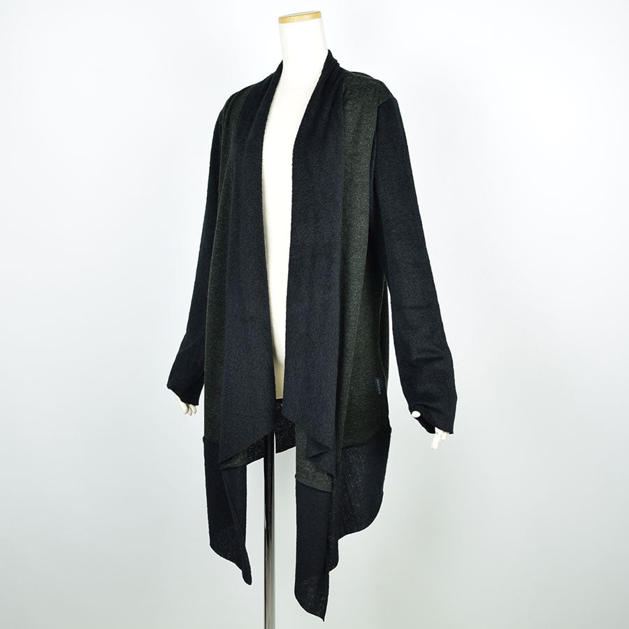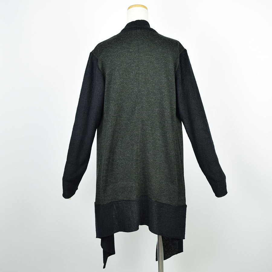 裾や袖口などを断ち切りにすることでラフなイメージを与えるとともに軽く仕上げたカーディガン。