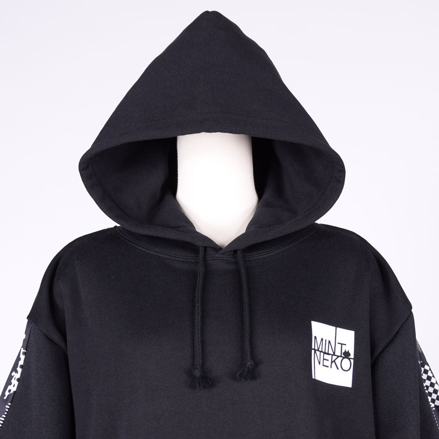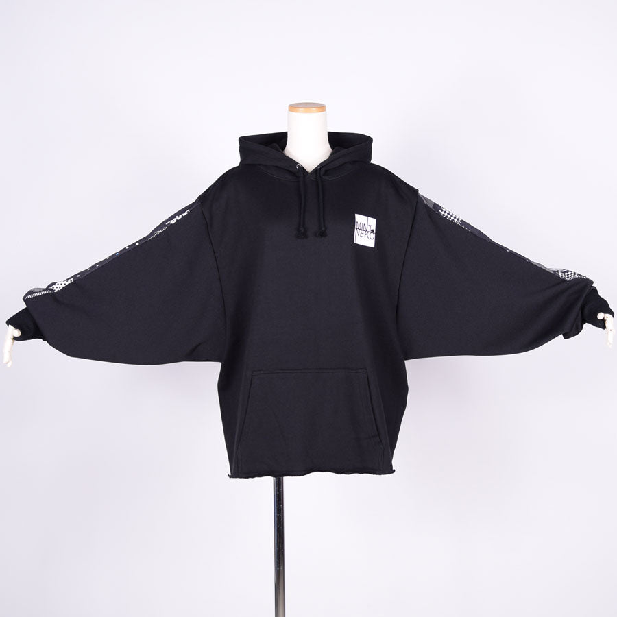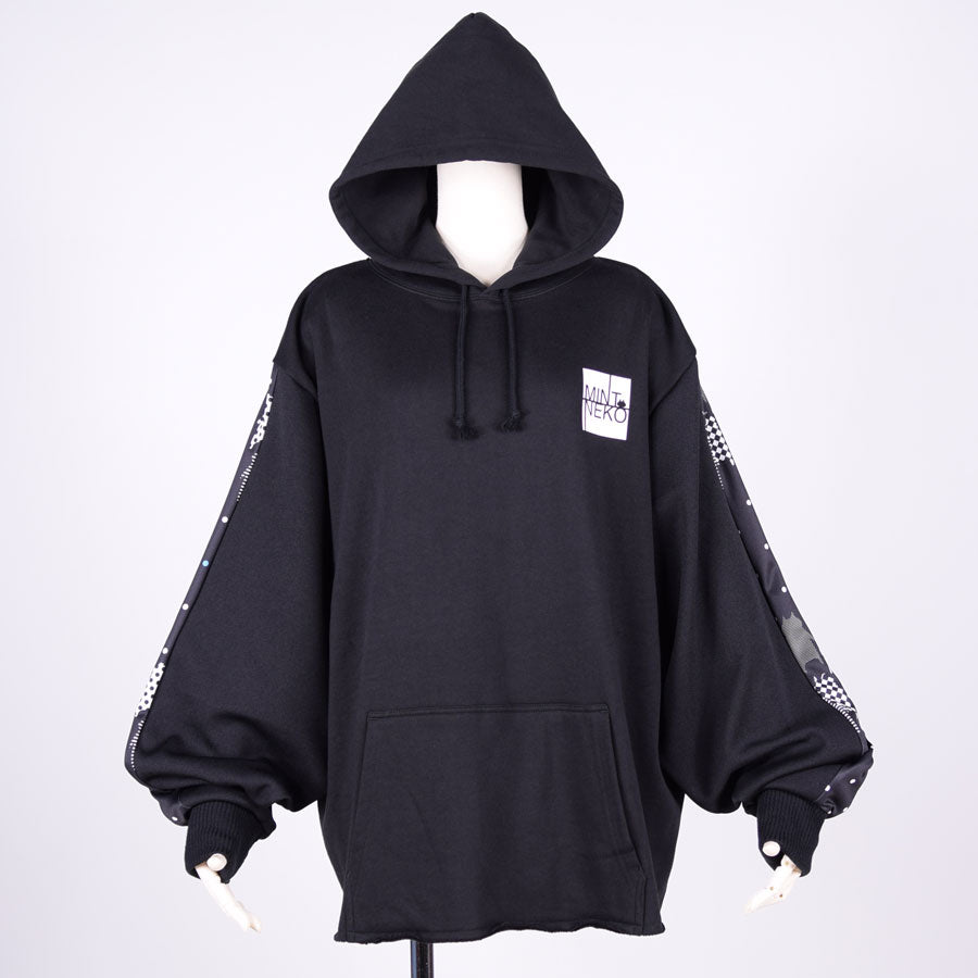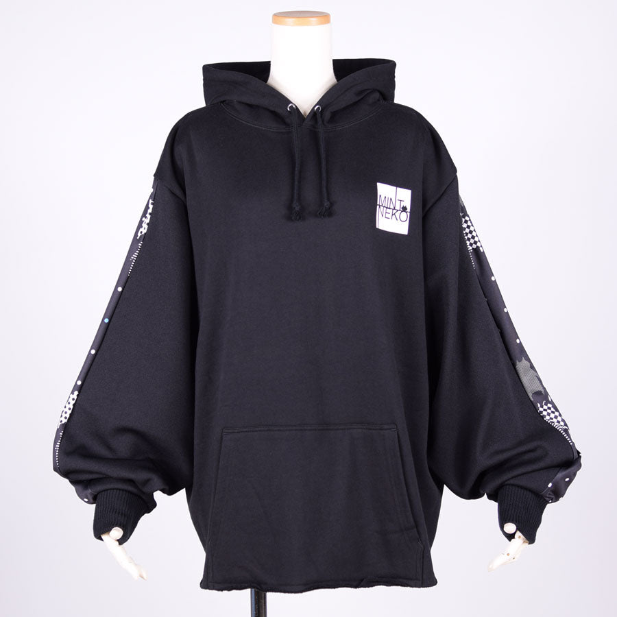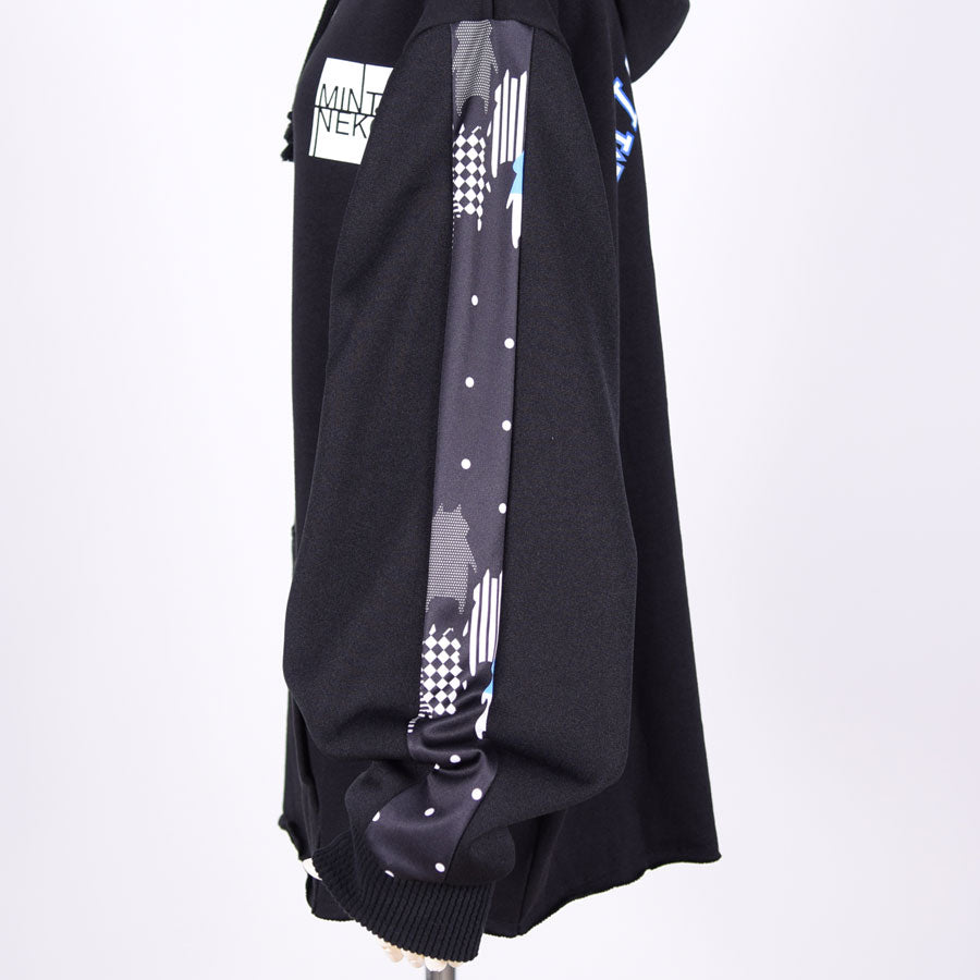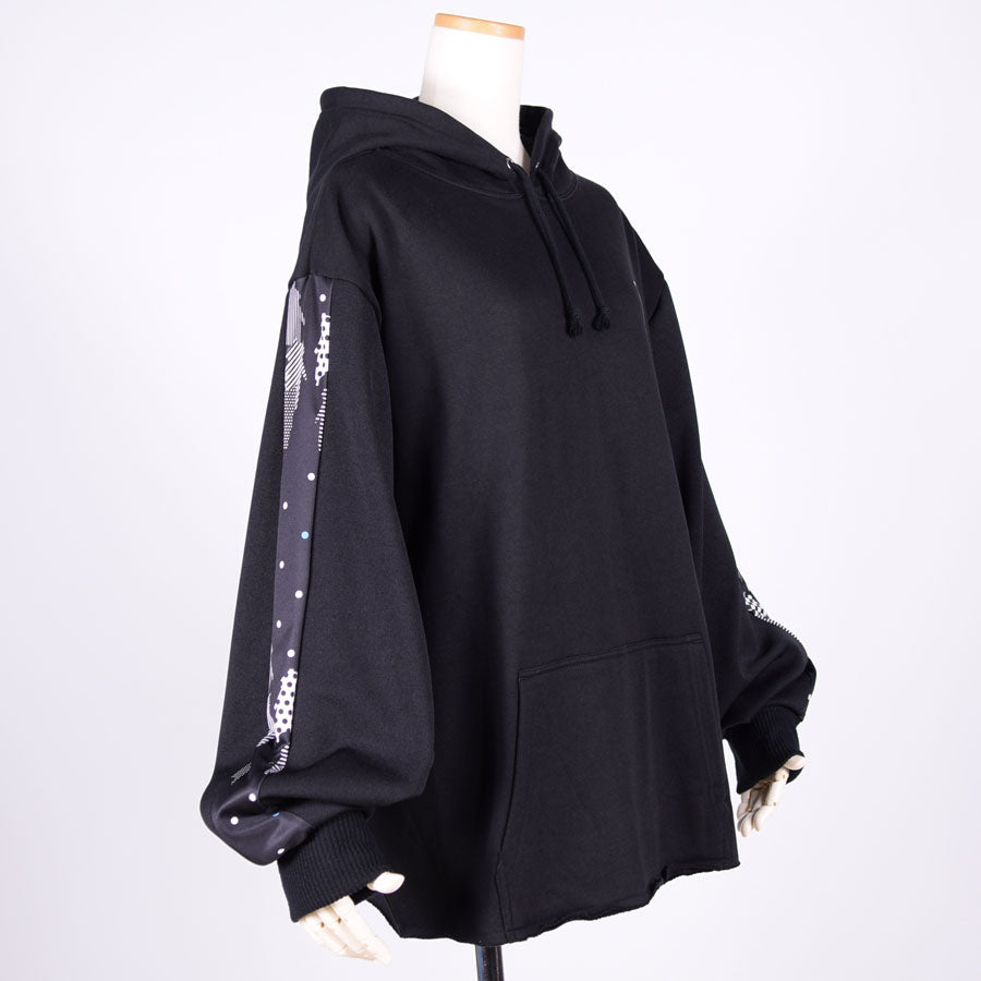 袖はジャージ、身頃はスウェットを使用して仕立てたフーディー。
