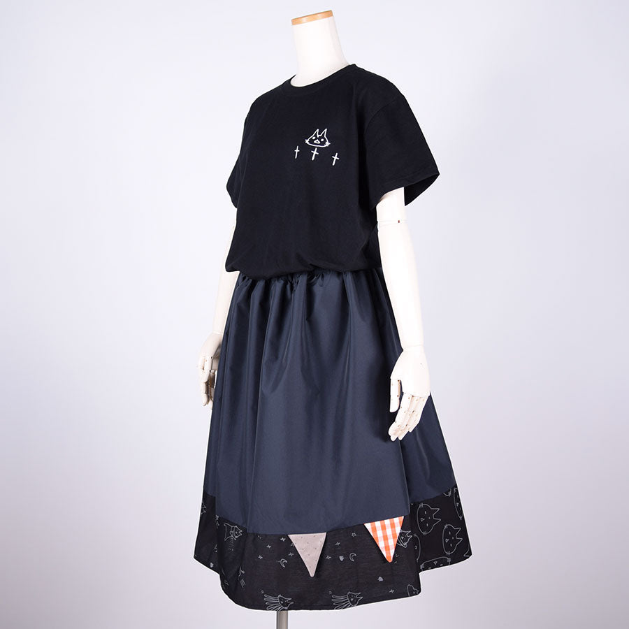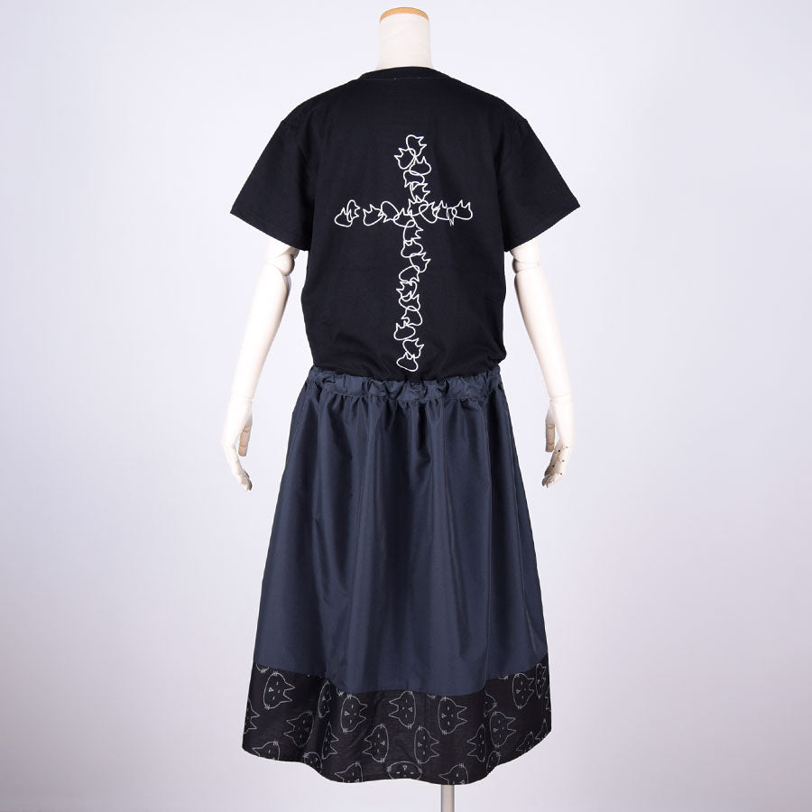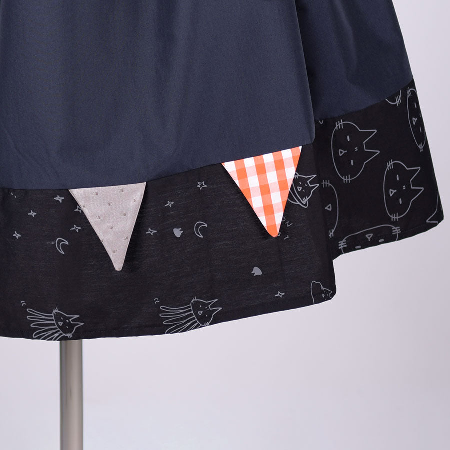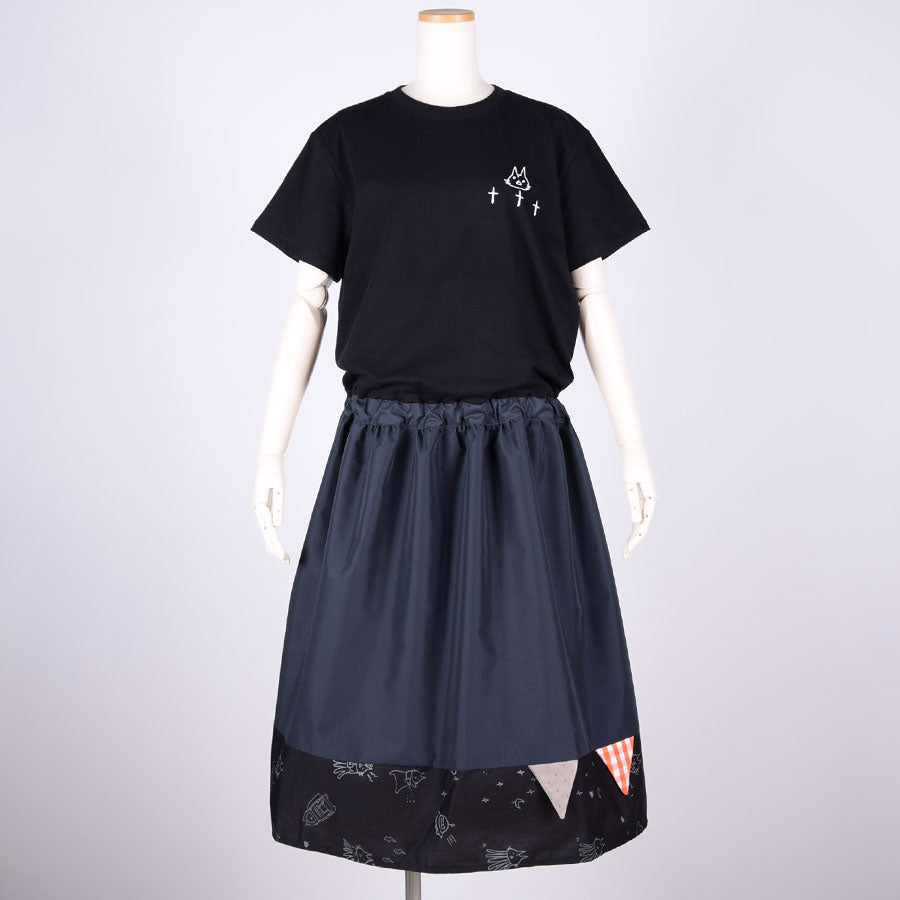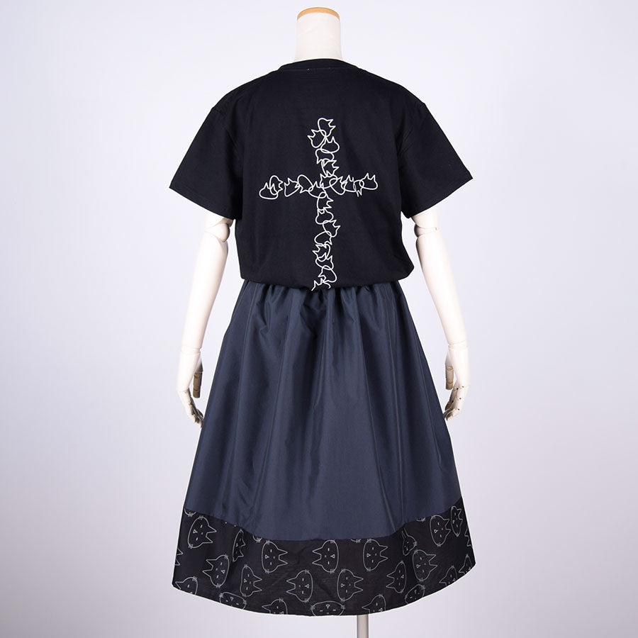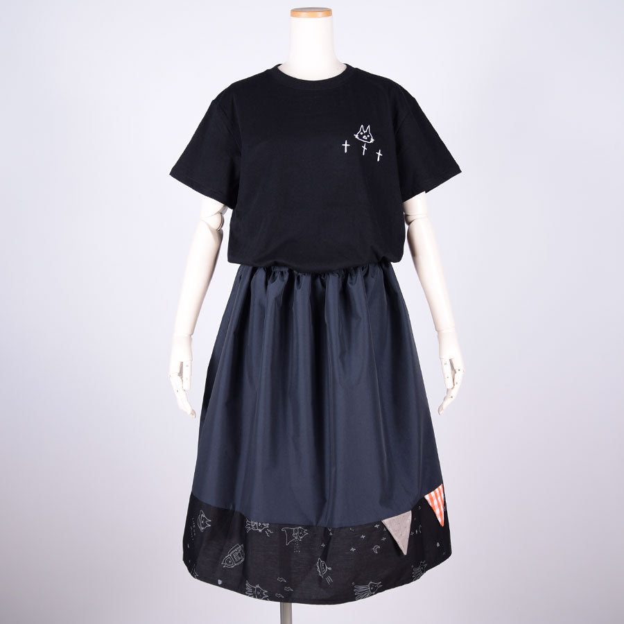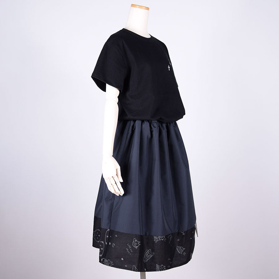 Tシャツ生地や布帛、プリント生地など様々な素材を組み合わせて仕立てたワンピースです。