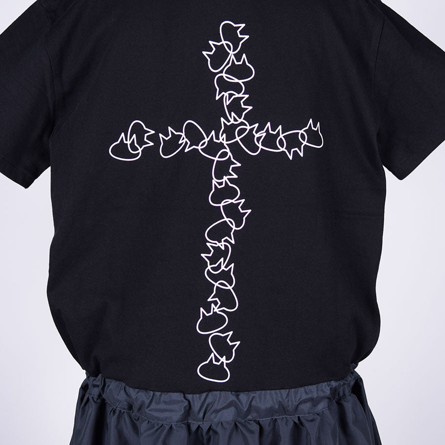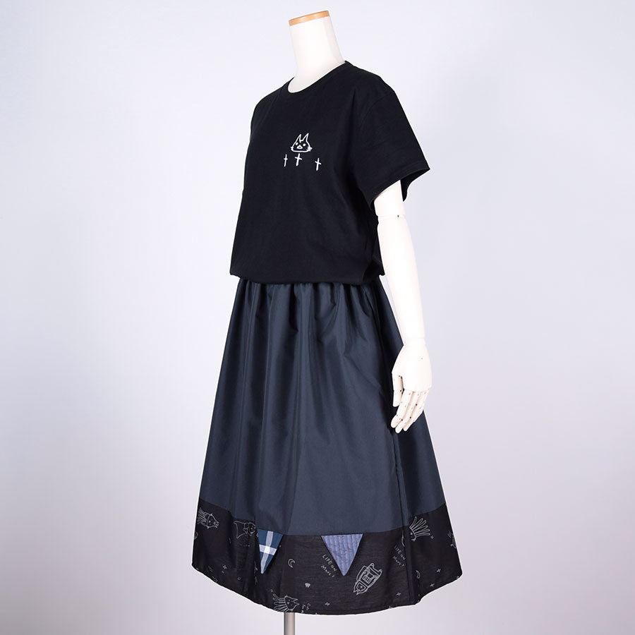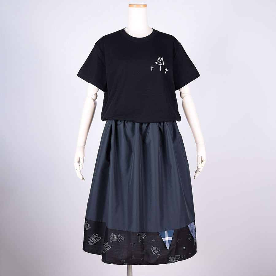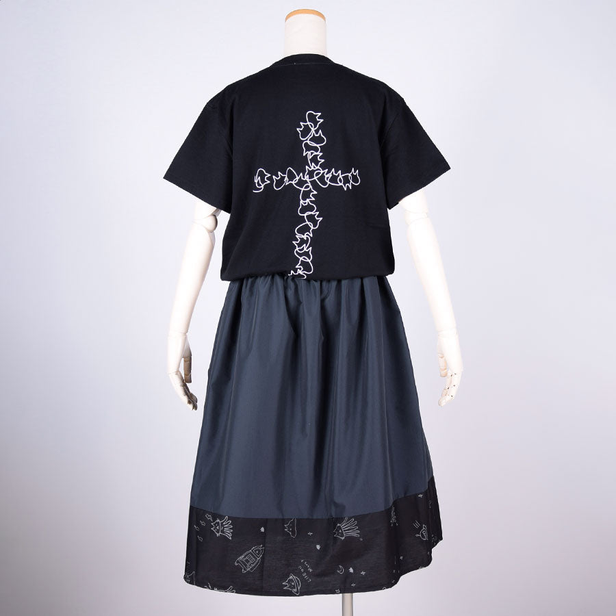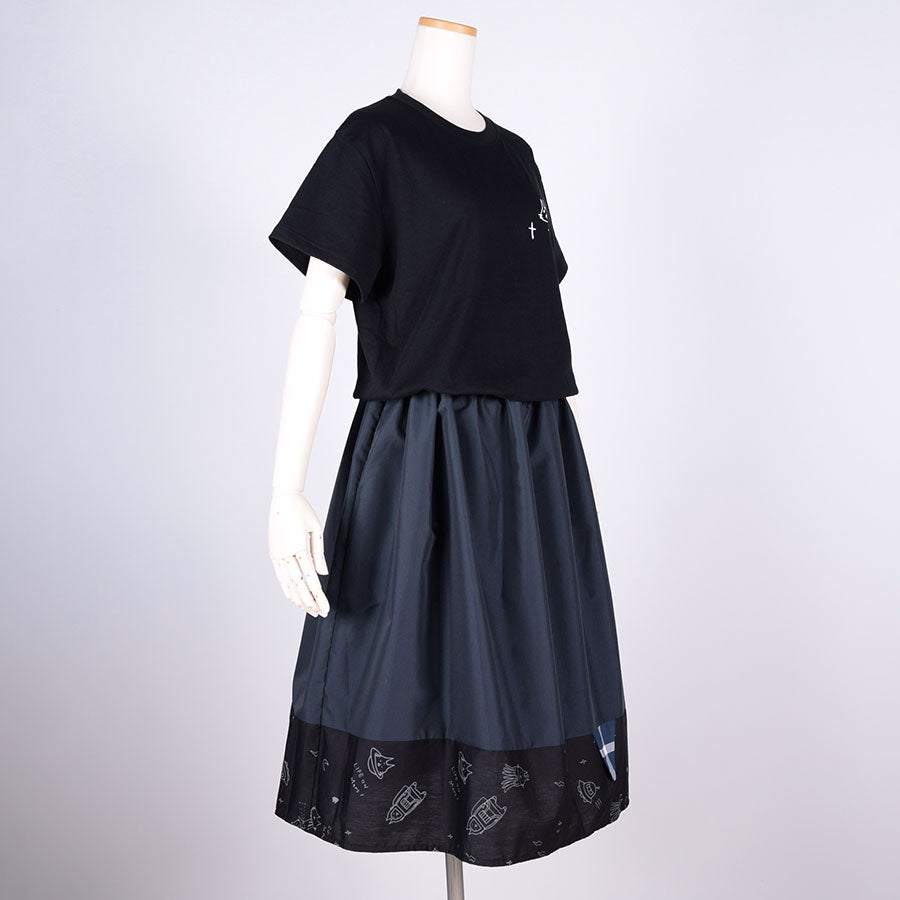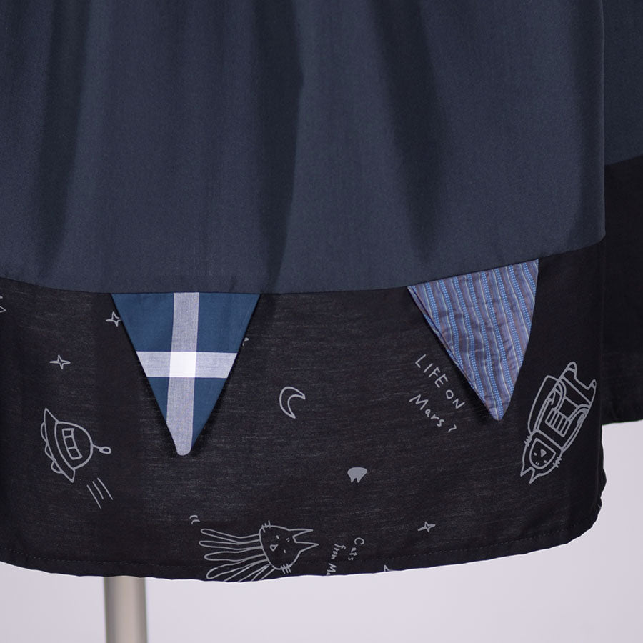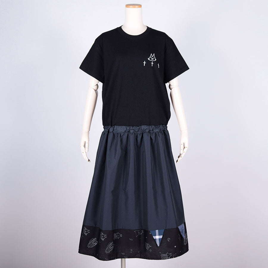 Tシャツ生地や布帛、プリント生地など様々な素材を組み合わせて仕立てたワンピースです。