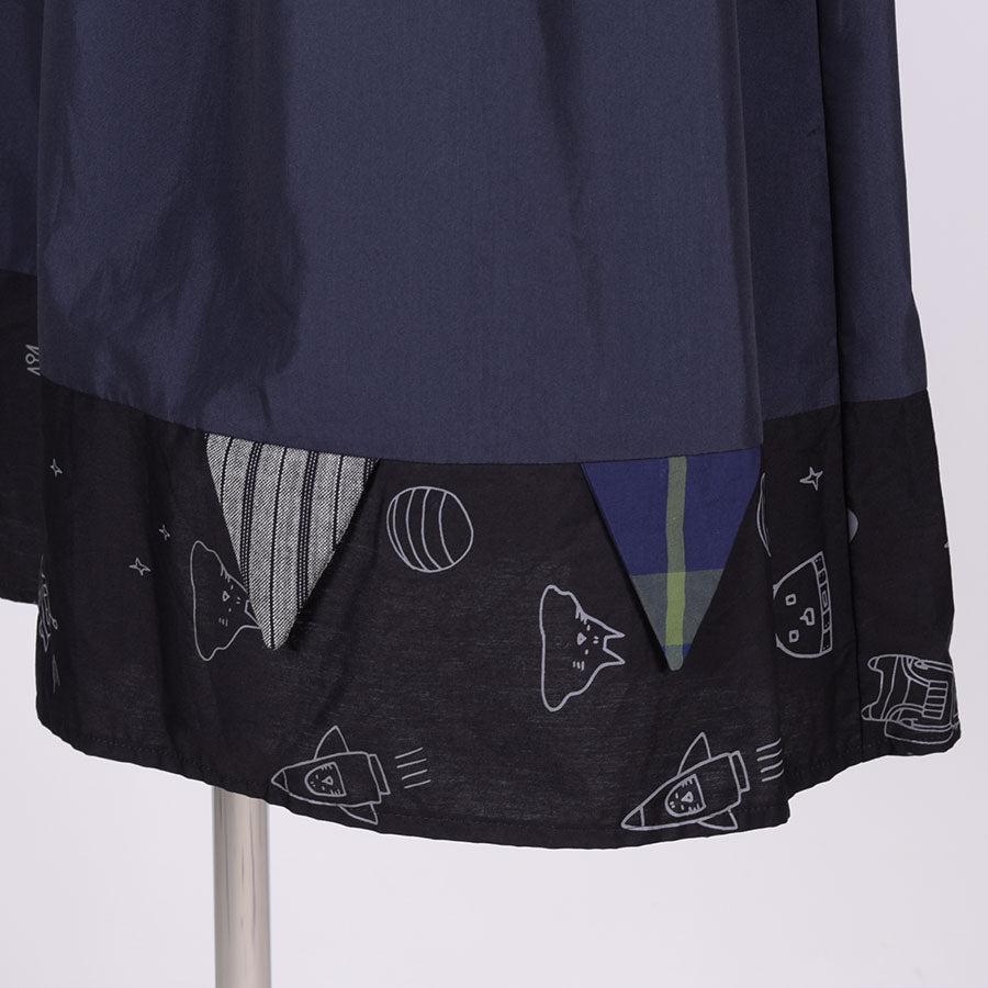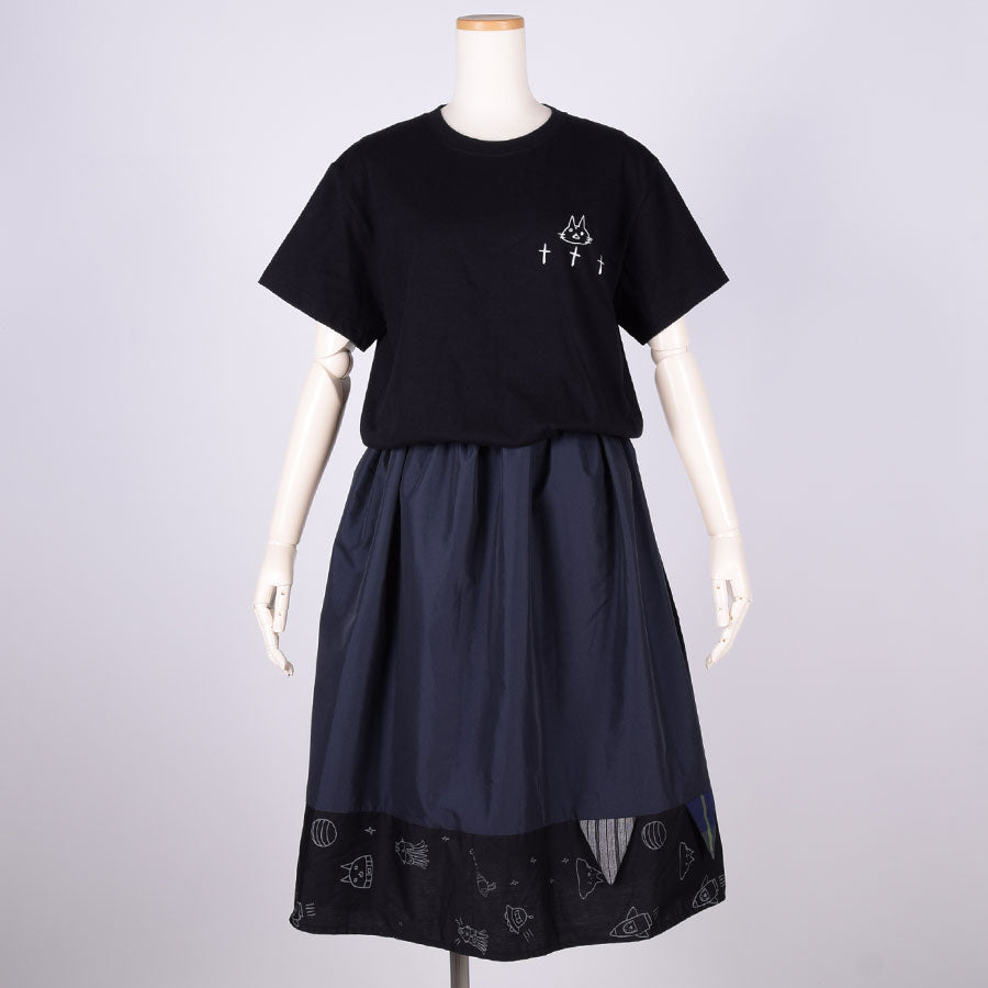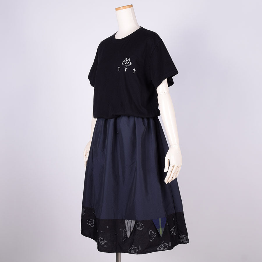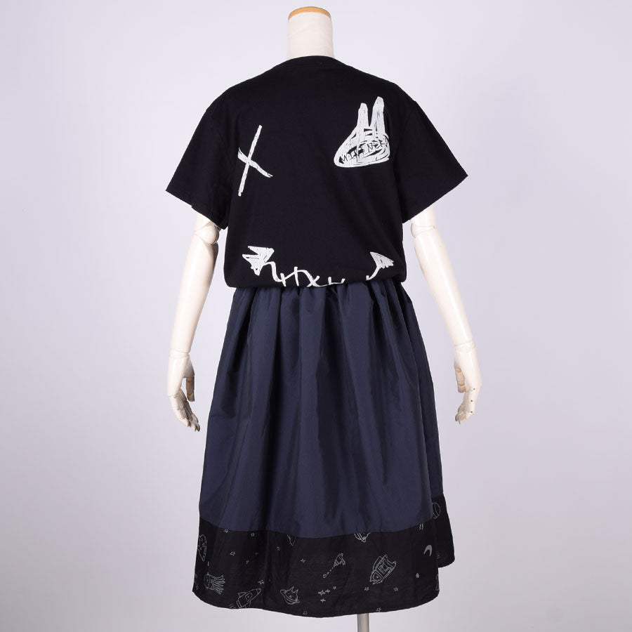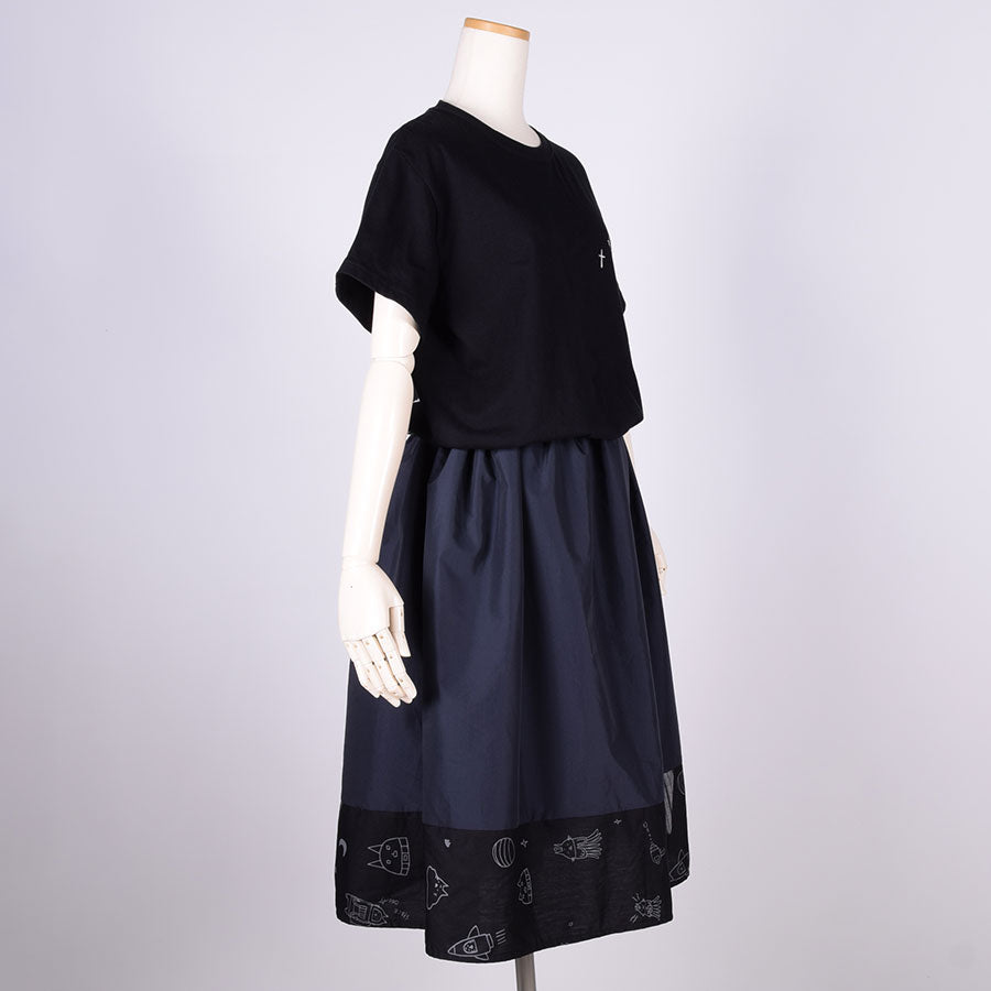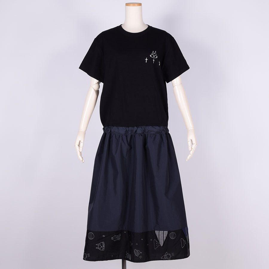 Tシャツ生地や布帛、プリント生地など様々な素材を組み合わせて仕立てたワンピースです。