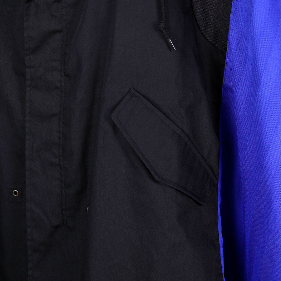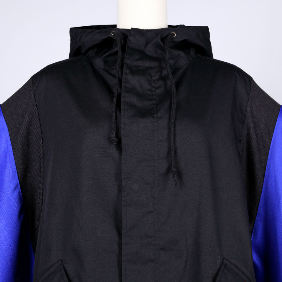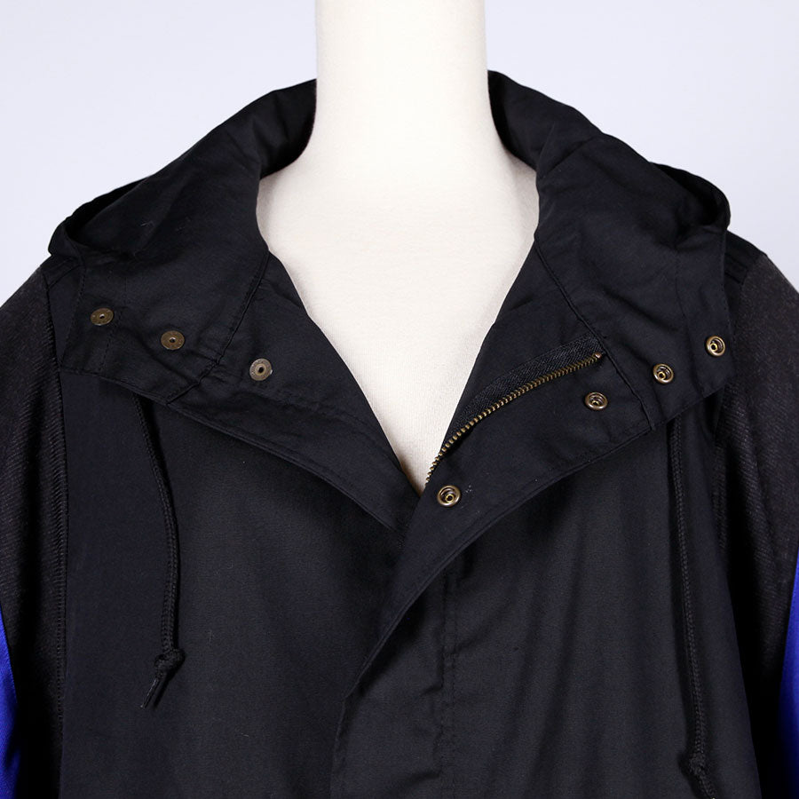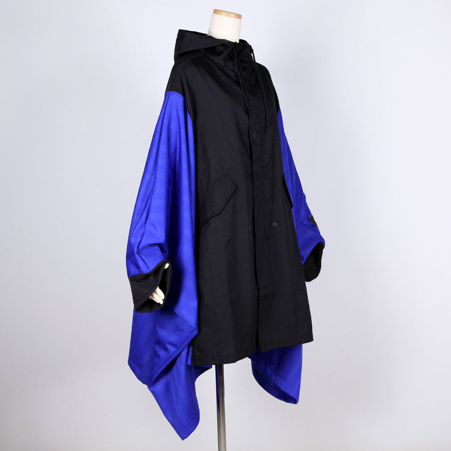 身頃に切替を入れ、異素材を組み合わせてワイドなシルエットに仕立てた変形モッズコート。