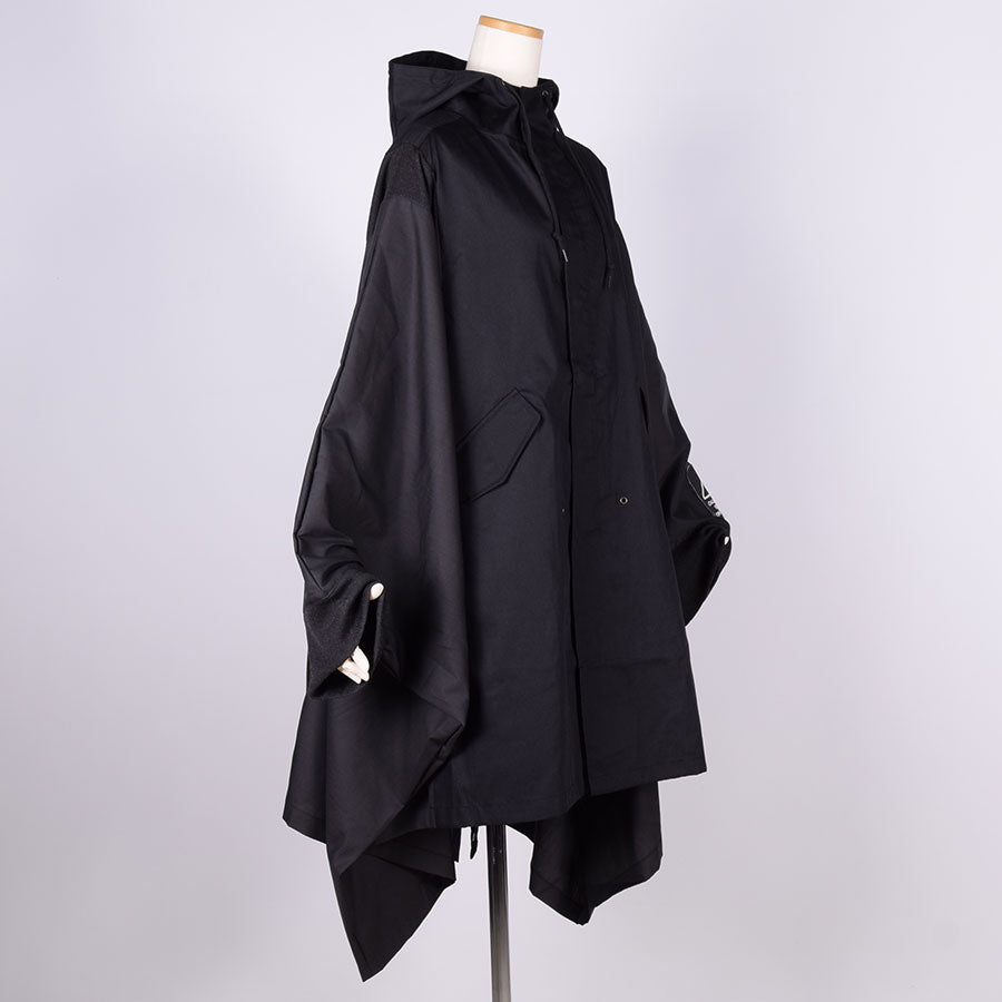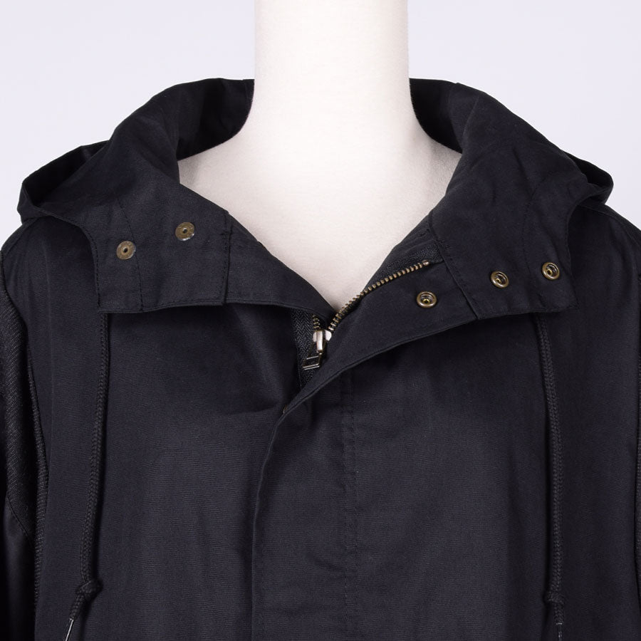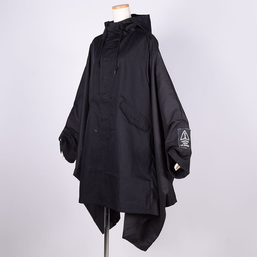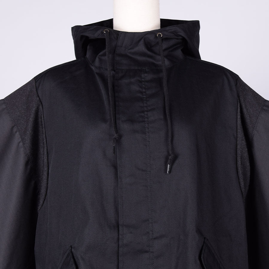 身頃に切替を入れ、異素材を組み合わせてワイドなシルエットに仕立てた変形モッズコート。