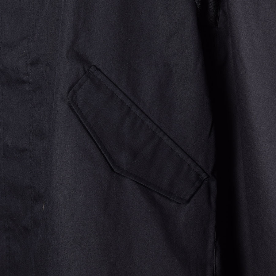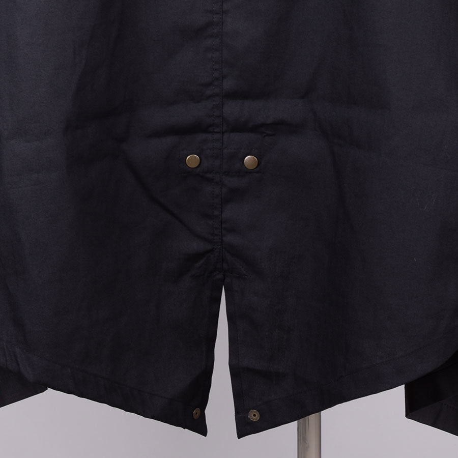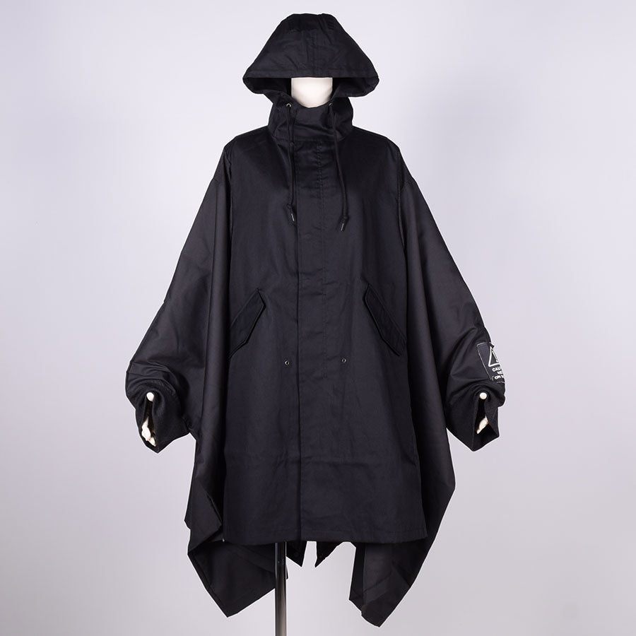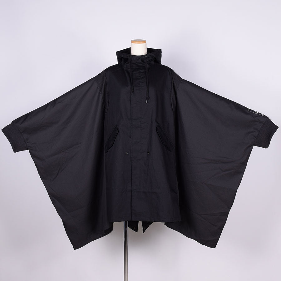身頃に切替を入れ、異素材を組み合わせてワイドなシルエットに仕立てた変形モッズコート。