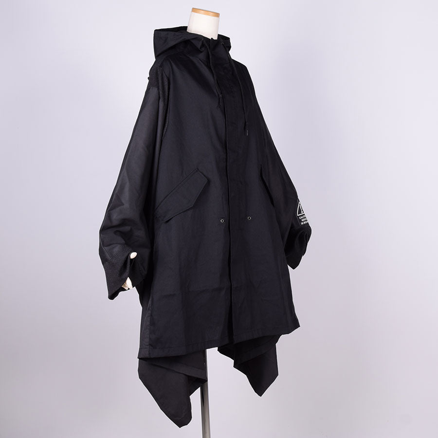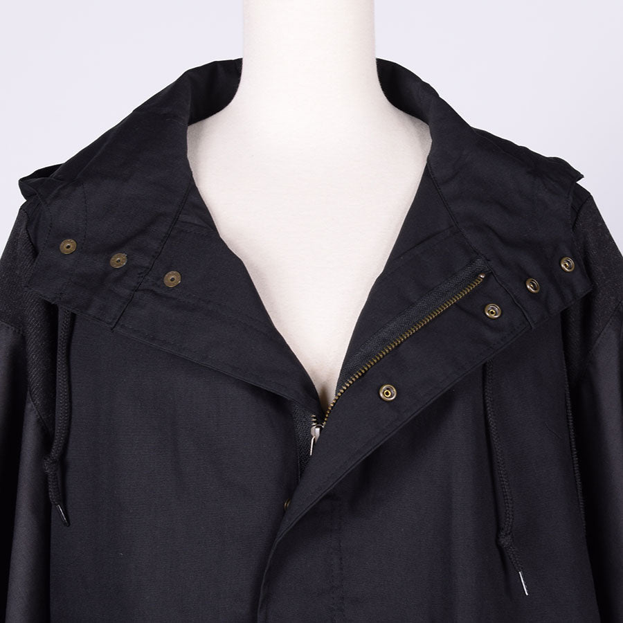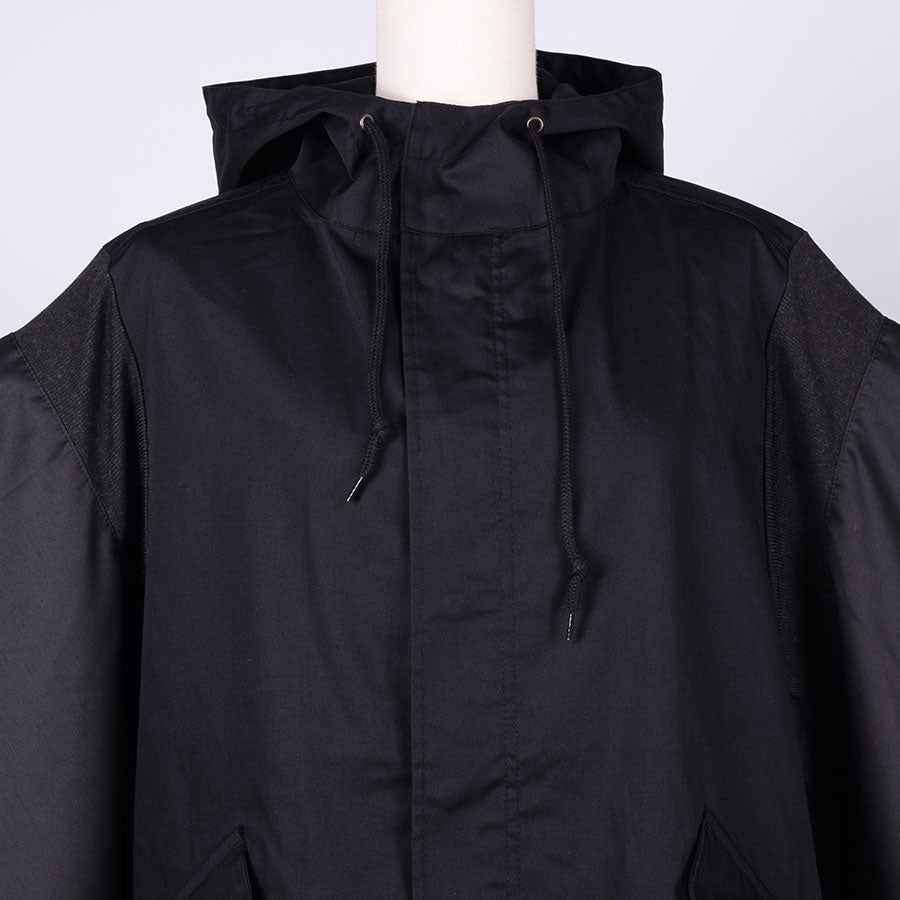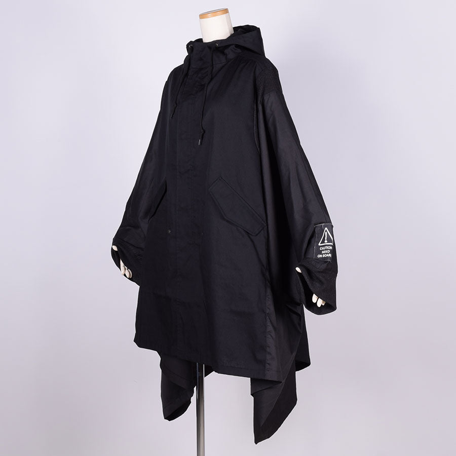 身頃に切替を入れ、異素材を組み合わせてワイドなシルエットに仕立てた変形モッズコート。