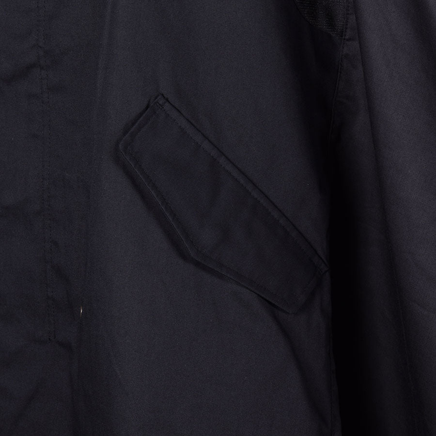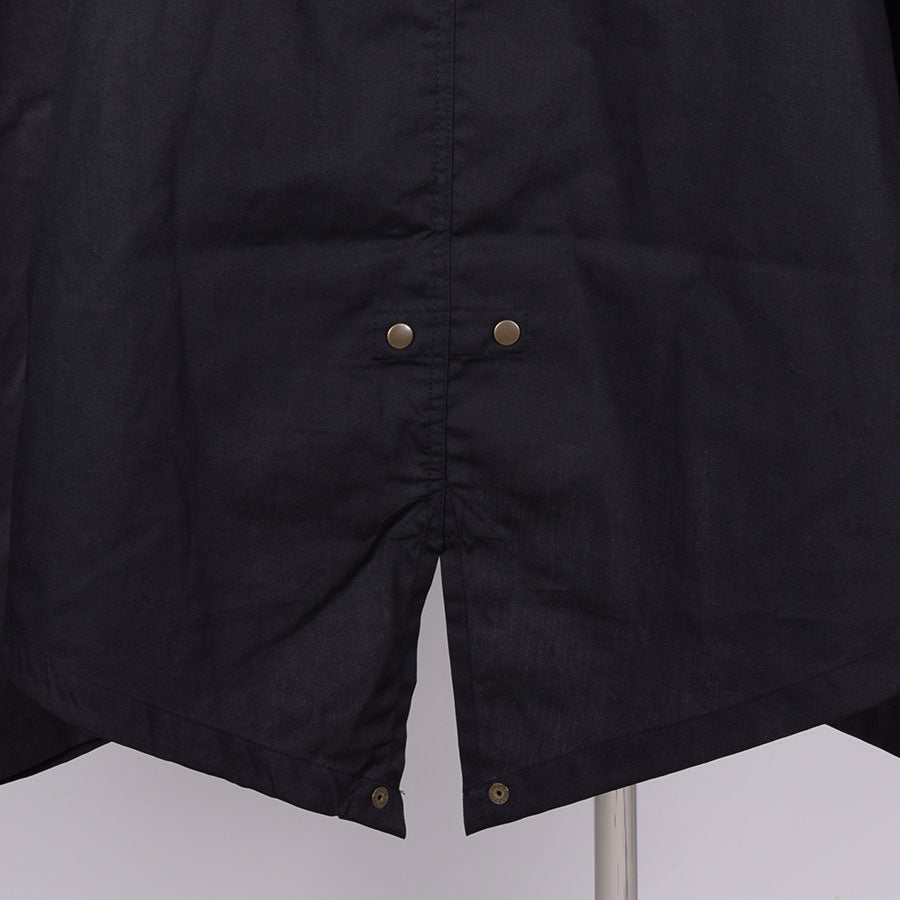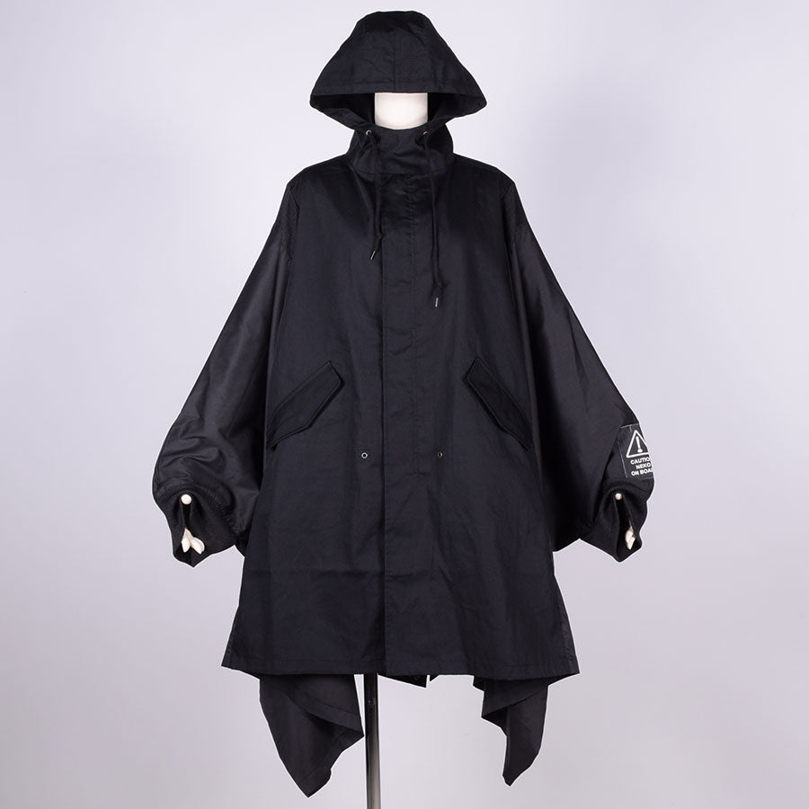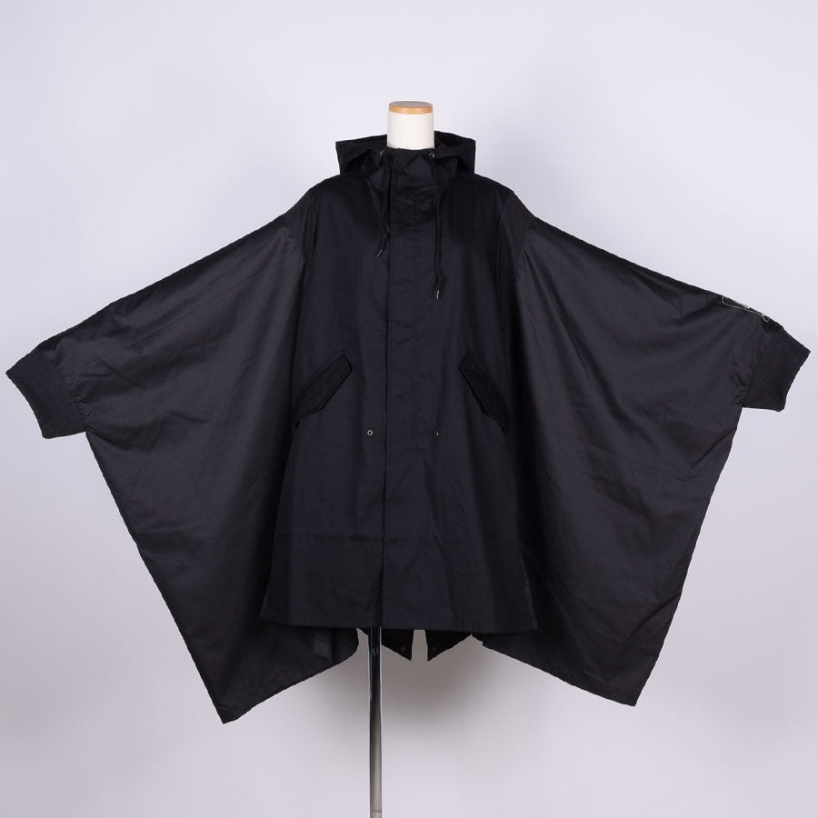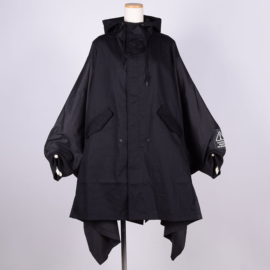身頃に切替を入れ、異素材を組み合わせてワイドなシルエットに仕立てた変形モッズコート。