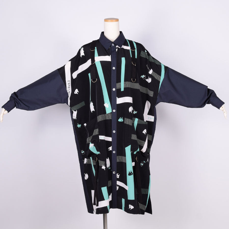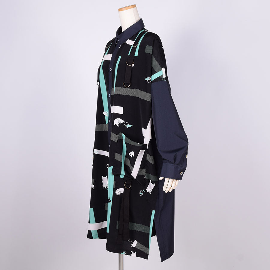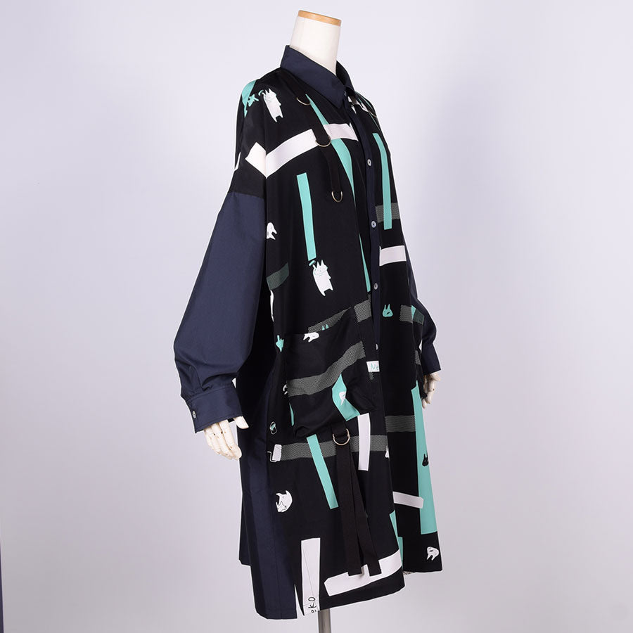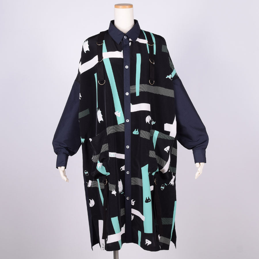 前身頃にオリジナルテキスタイルを使用したロング丈のシャツジャケット。