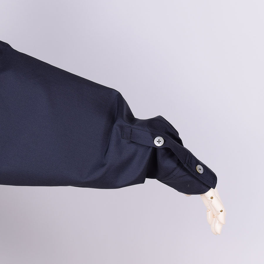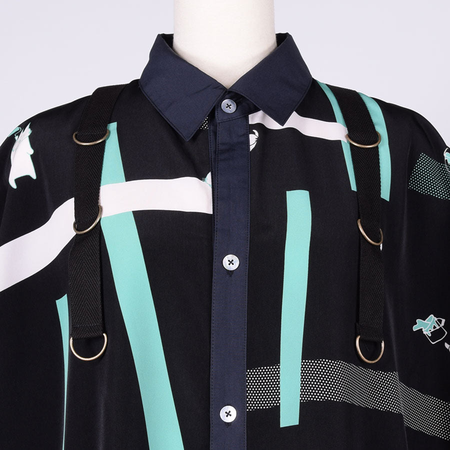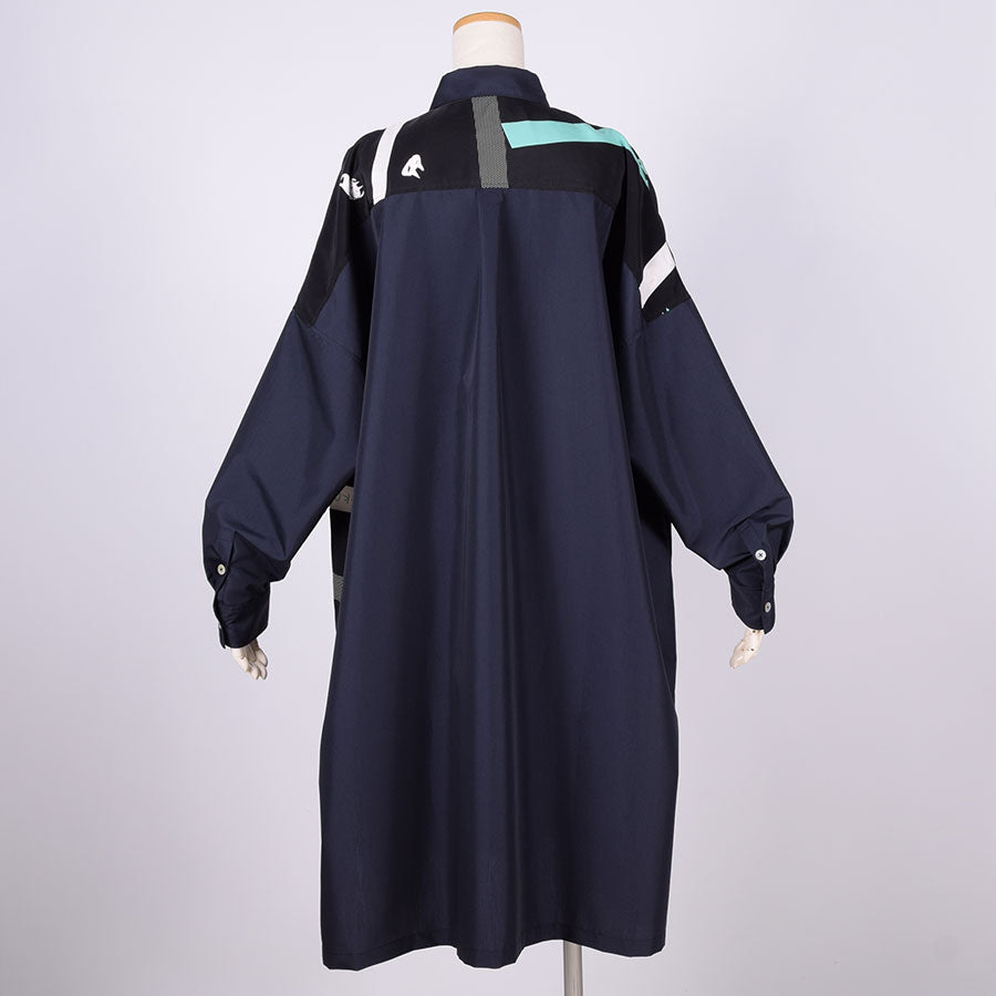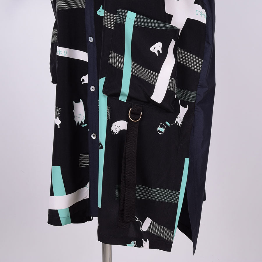 前身頃にオリジナルテキスタイルを使用したロング丈のシャツジャケット。