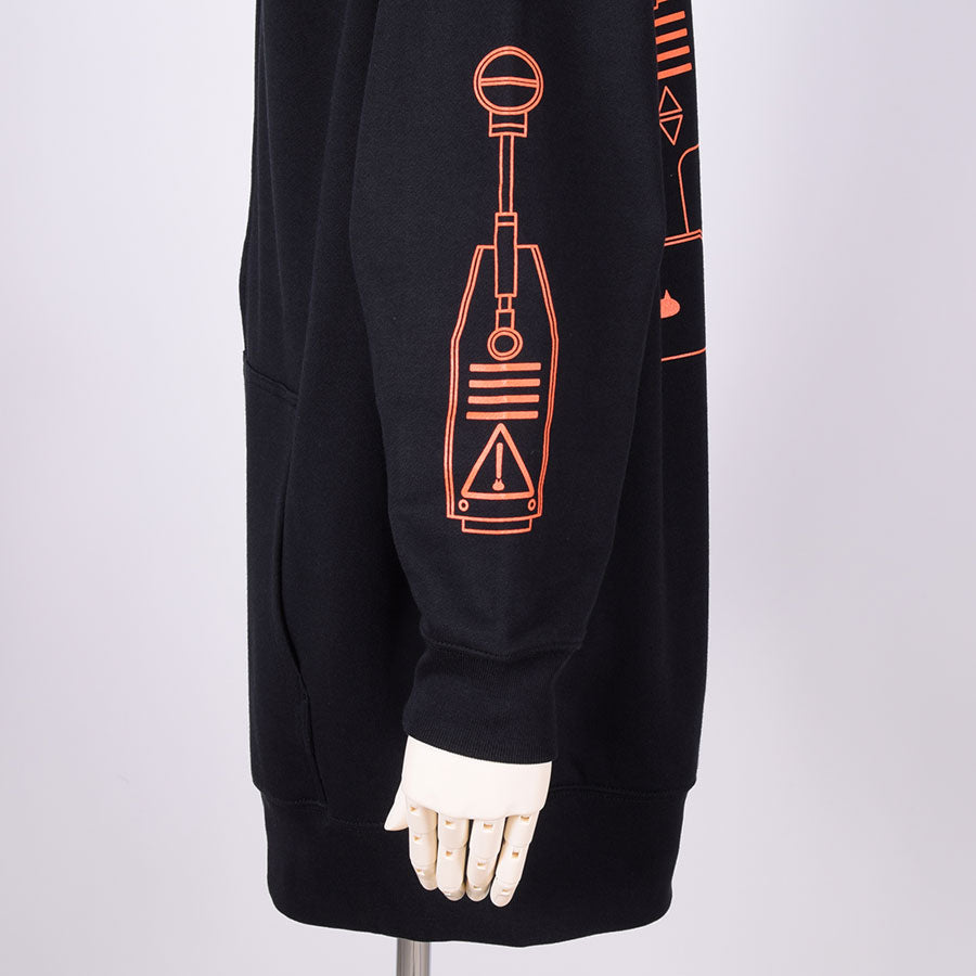 ロボットやプラモデルのパーツをイメージしたグラフィックをBIGシルエットのパーカーにプリントしています。