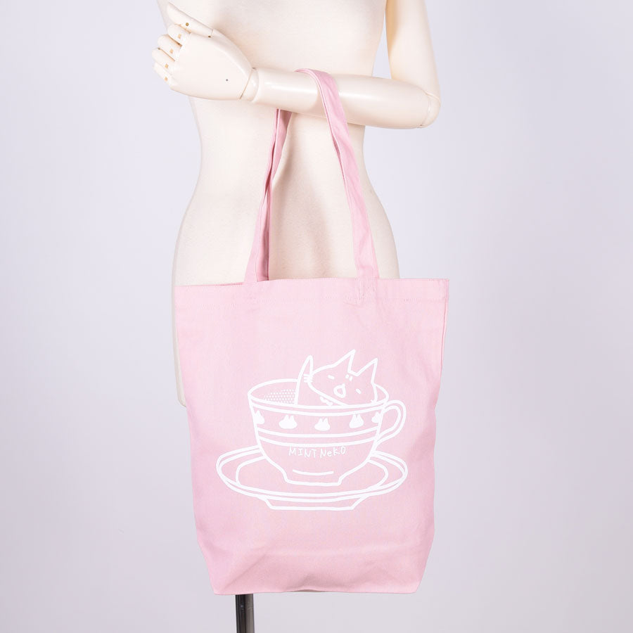 いちごミルク、ほうじ茶ラテ、ゴマ豆乳、ソーダをイメージしたトートバッグにティーカップに入った吾輩をプリントしました。