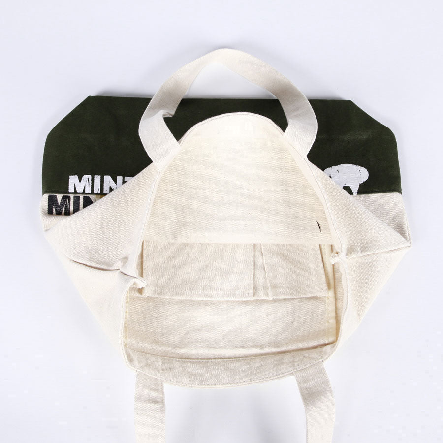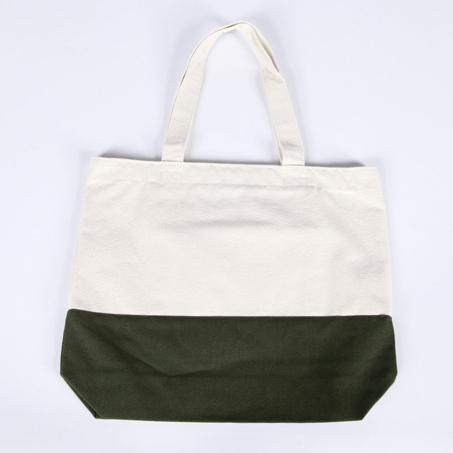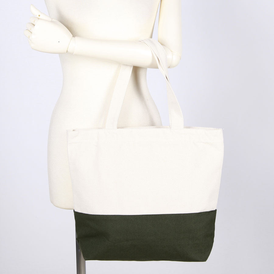 底部分と本体で色の異なるキャンバス生地を組み合わせたトートバッグ。