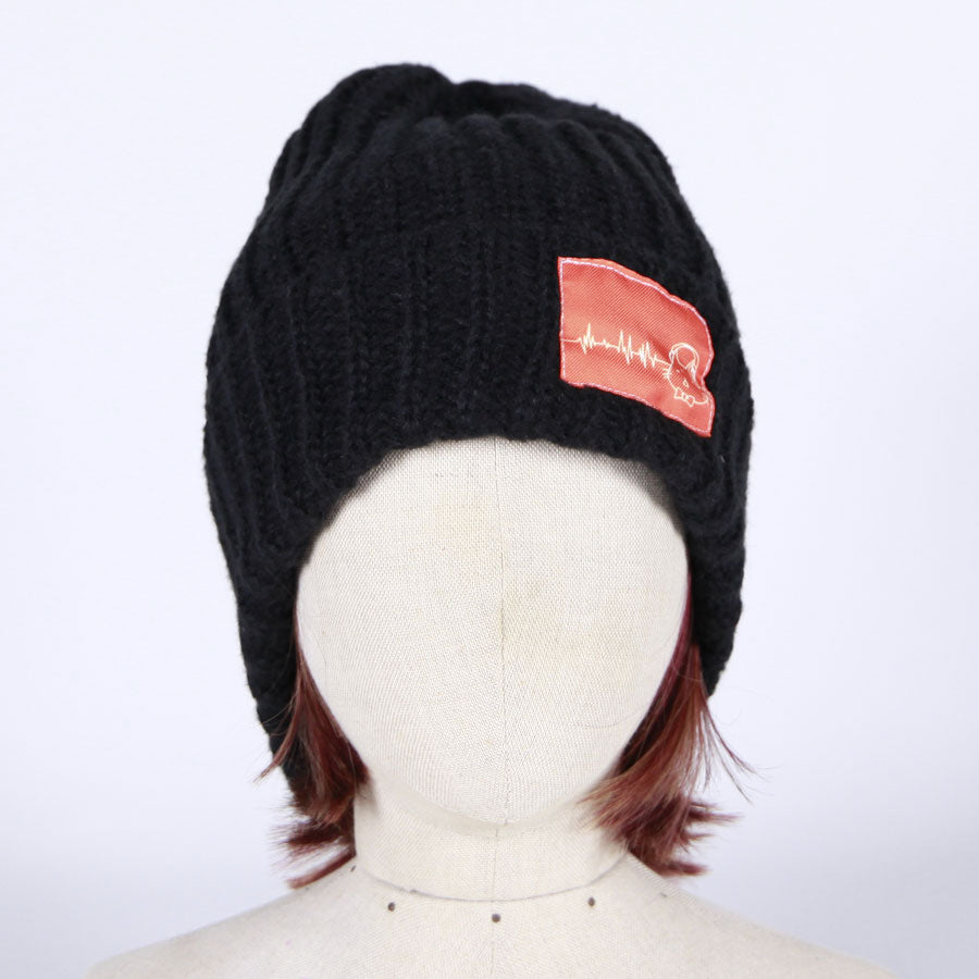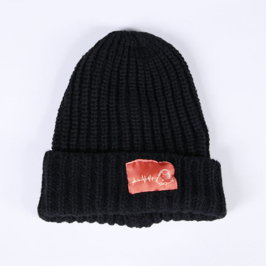 ヘッドホングラフィックのパッチを縫い付けたニットキャップ。
