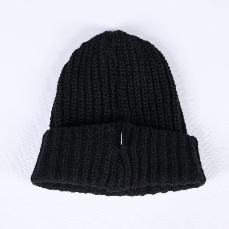 ヘッドホングラフィックのパッチを縫い付けたニットキャップ。