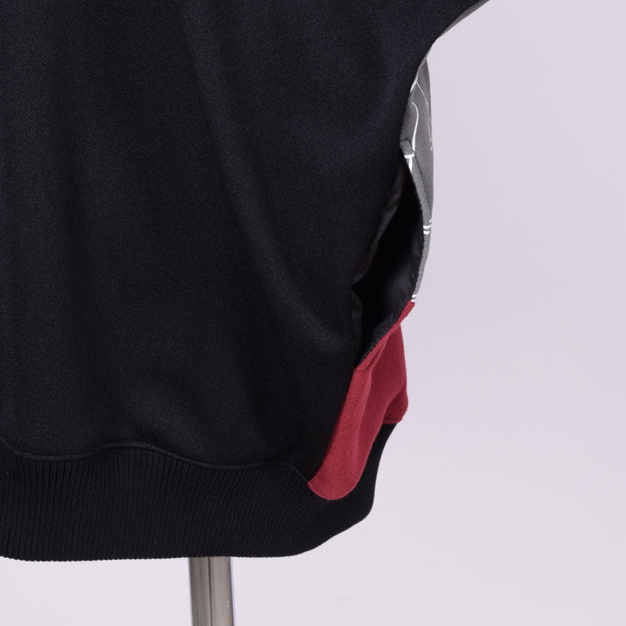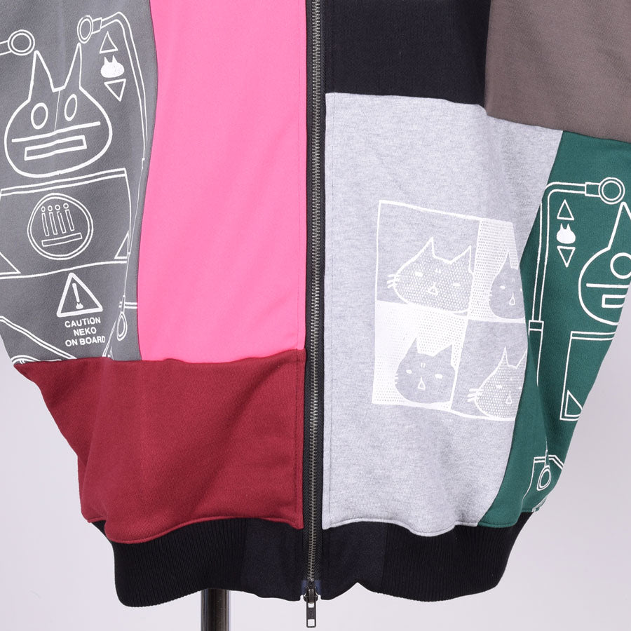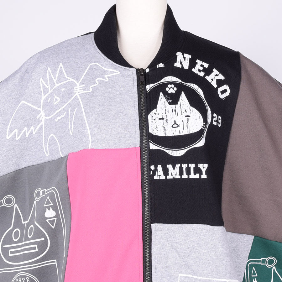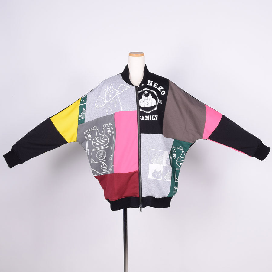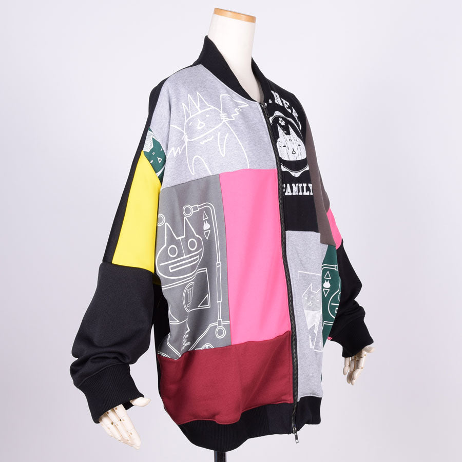 通常捨てられてしまうハギレにプリントを手作業で加え、さらにパッチワークをしてブルゾンの身頃に使用した非常に手の込んだアイテム。