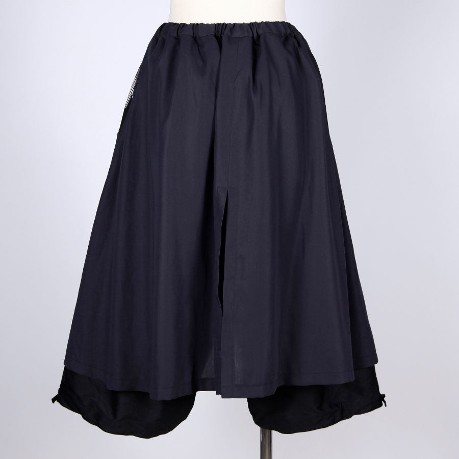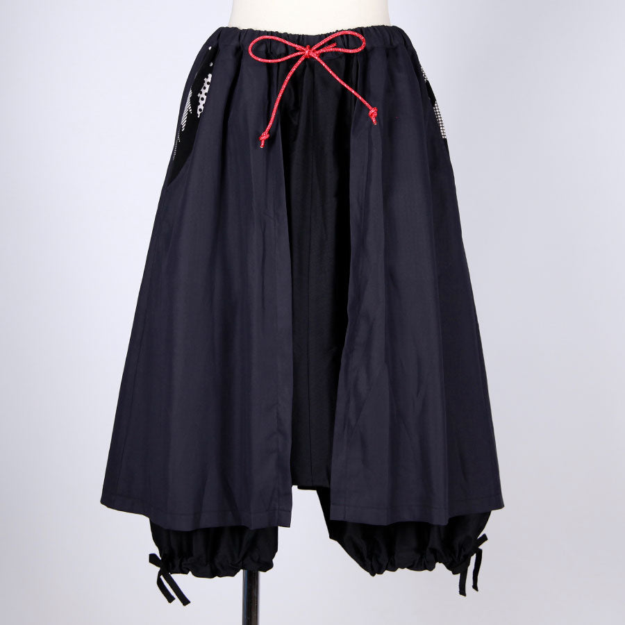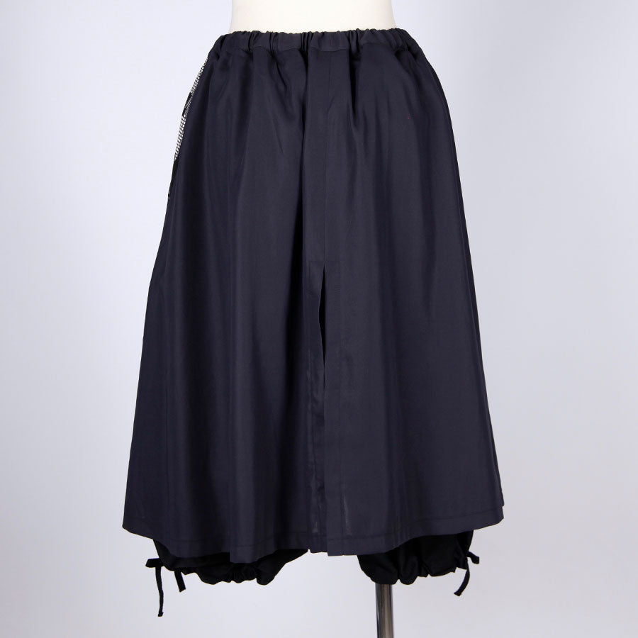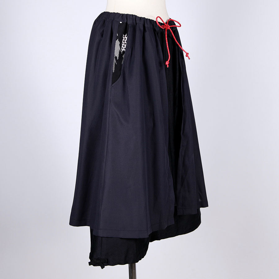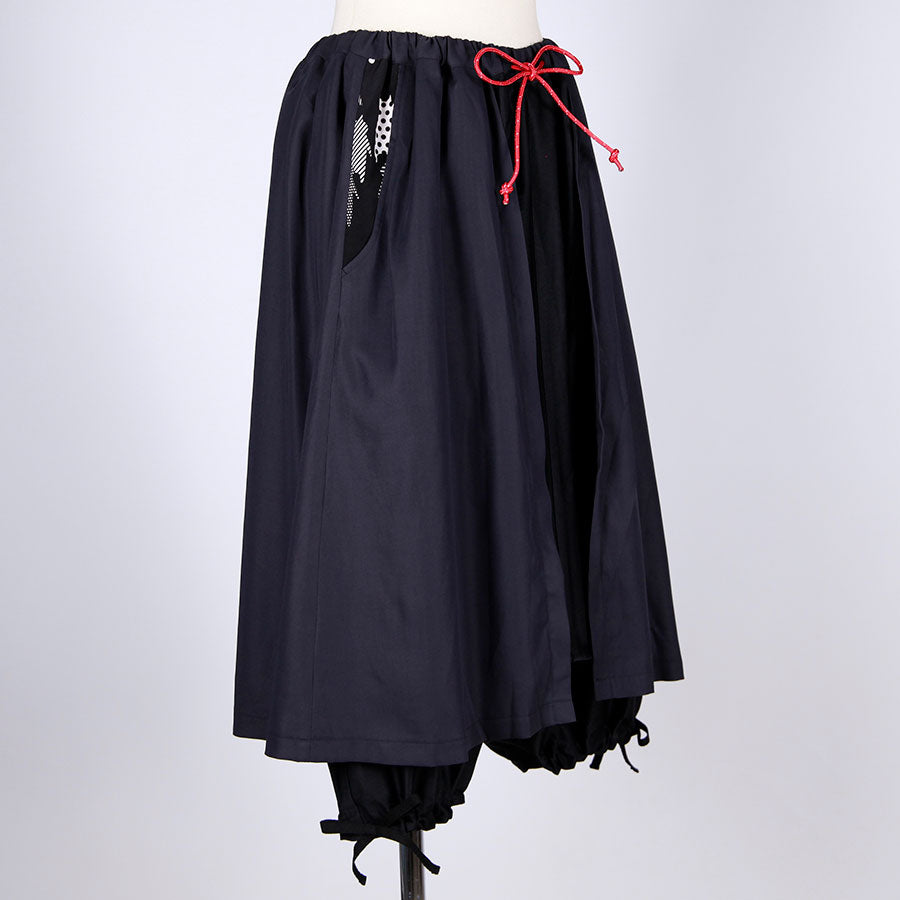 定番のバルーンワイドパンツをベースにオーバースカートをドッキングさせたインパクトのあるデザインのパンツ。