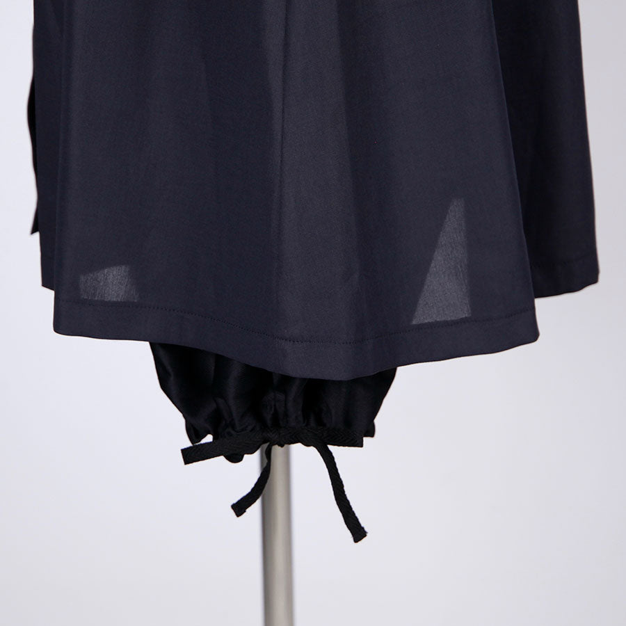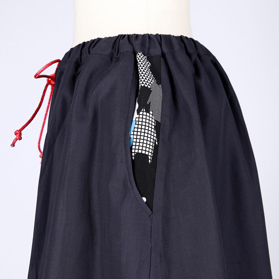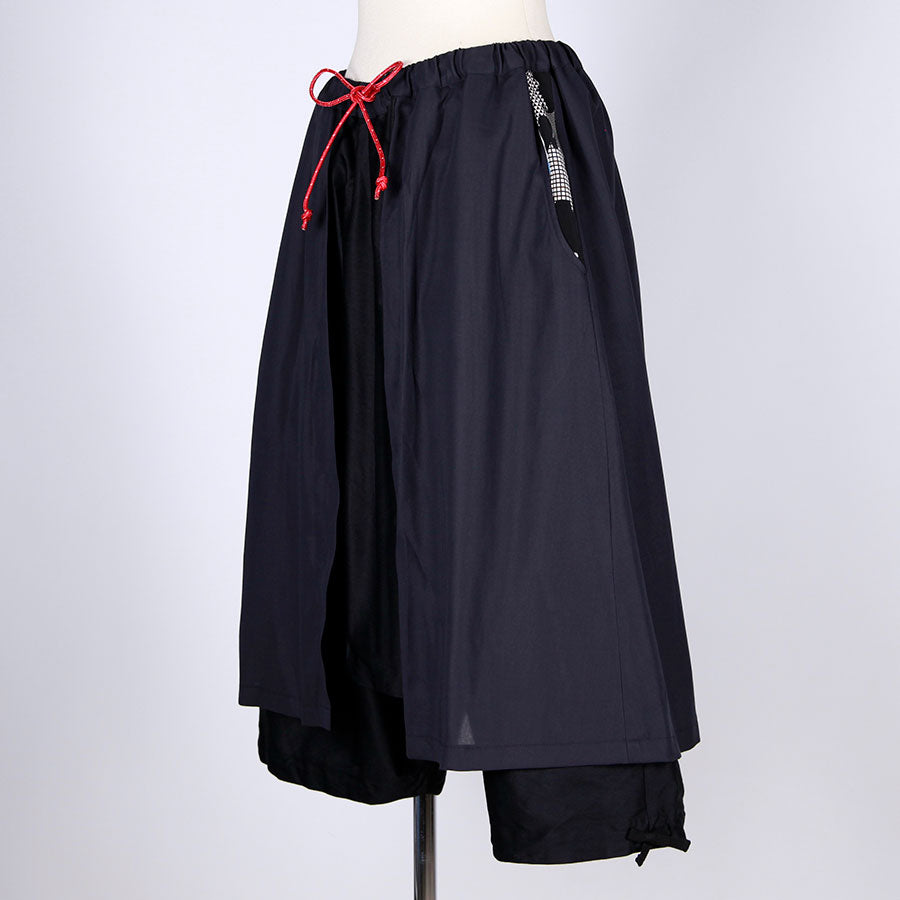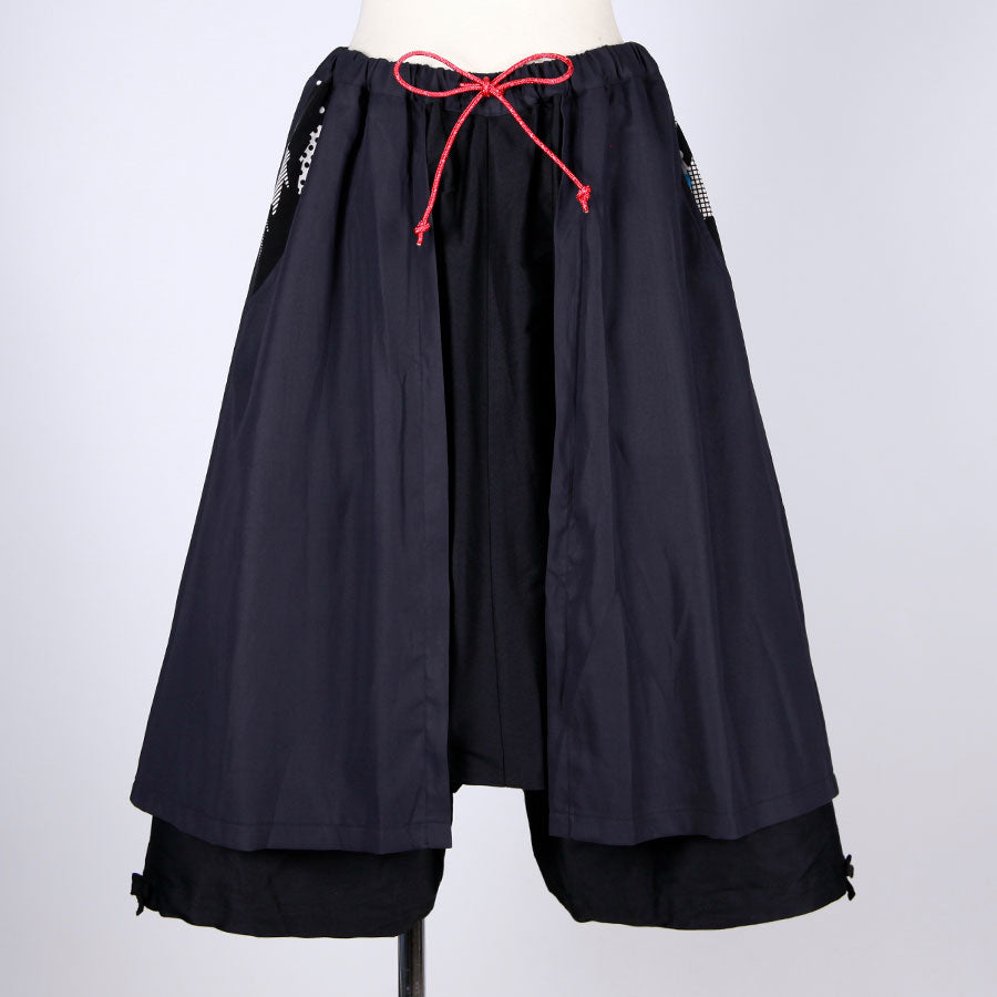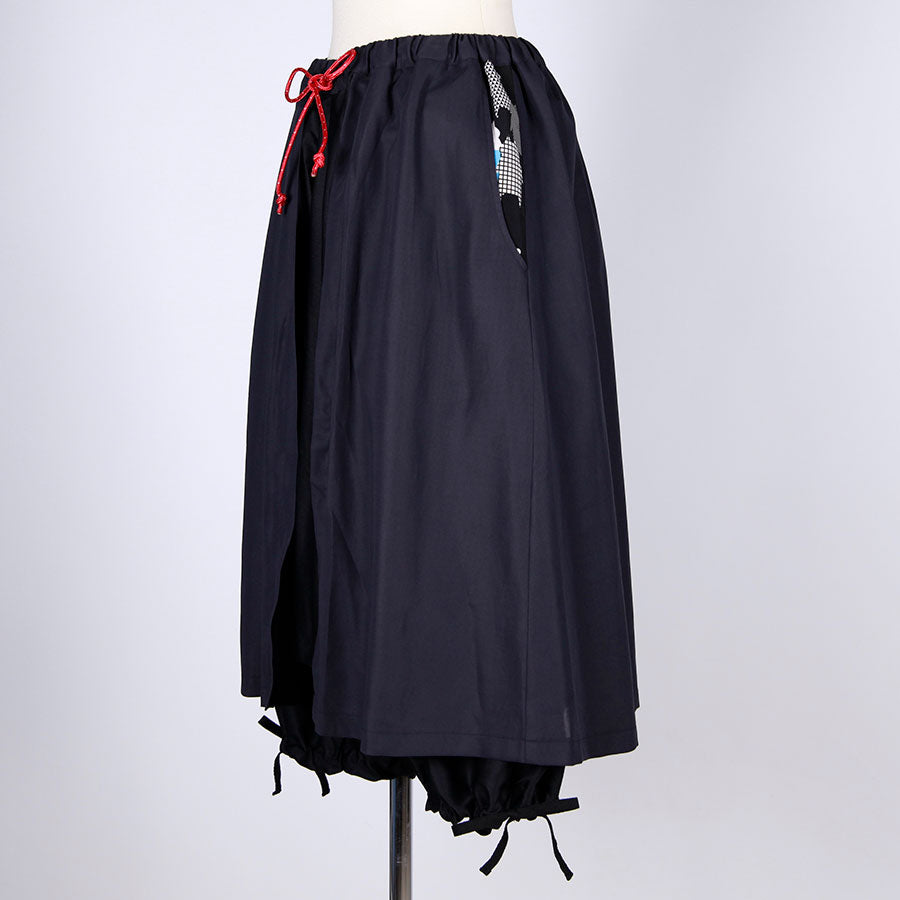 定番のバルーンワイドパンツをベースにオーバースカートをドッキングさせたインパクトのあるデザインのパンツ。
