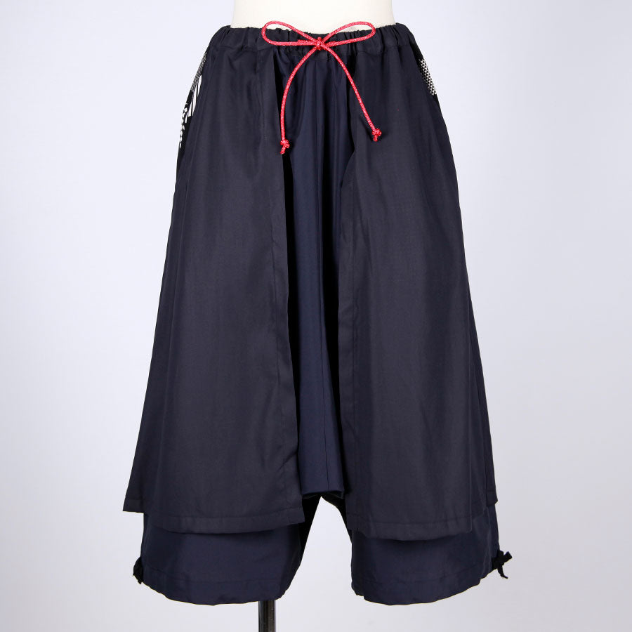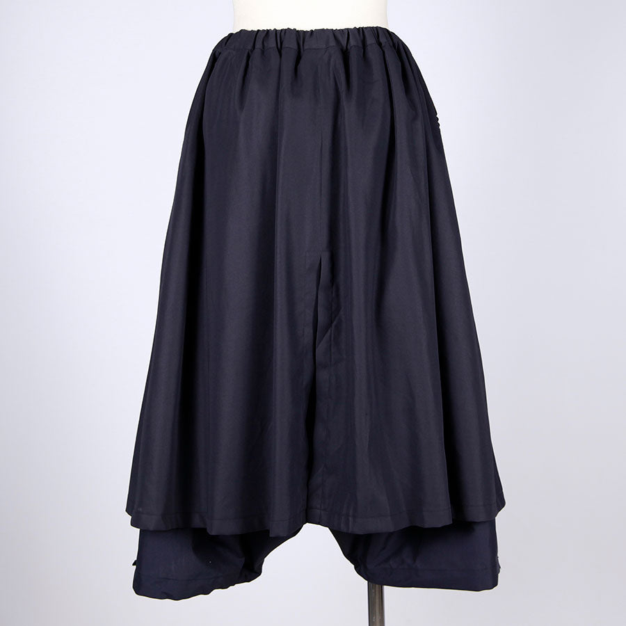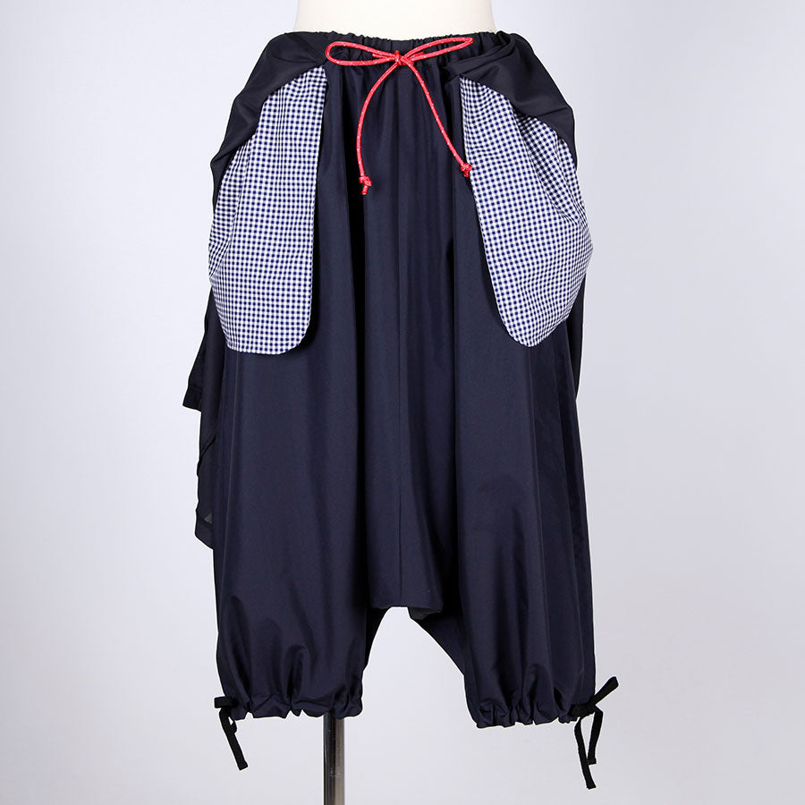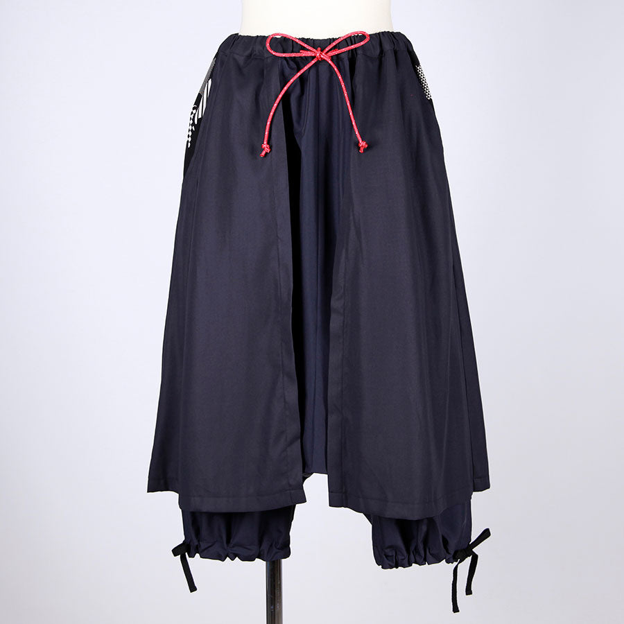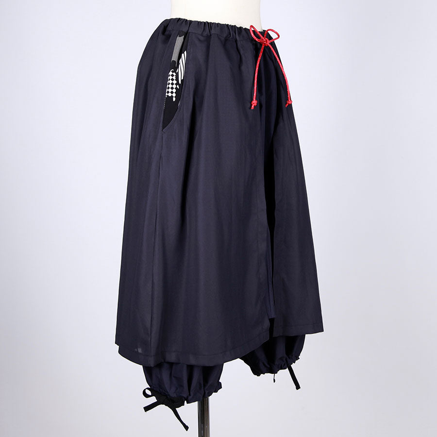 定番のバルーンワイドパンツをベースにオーバースカートをドッキングさせたインパクトのあるデザインのパンツ。