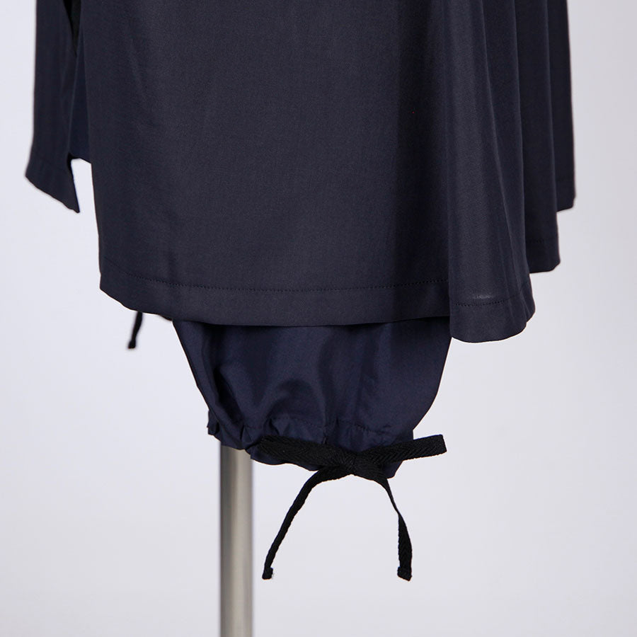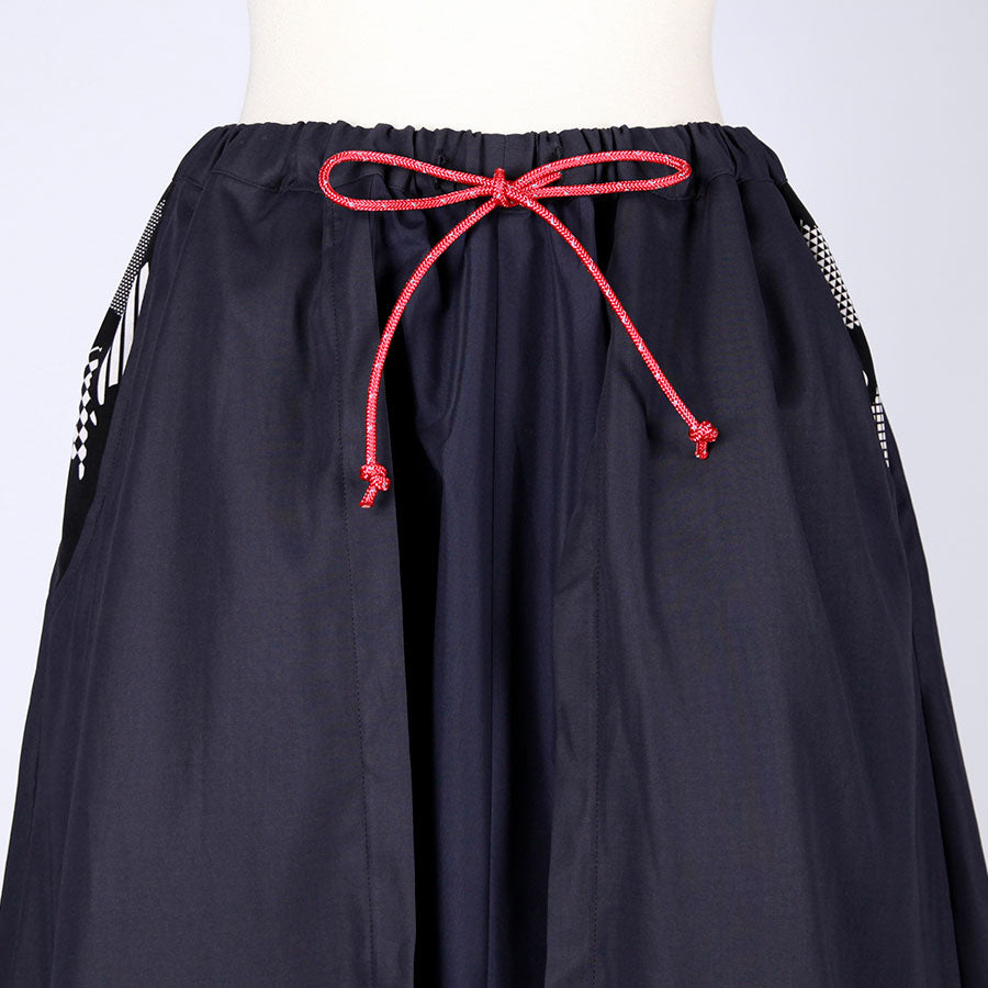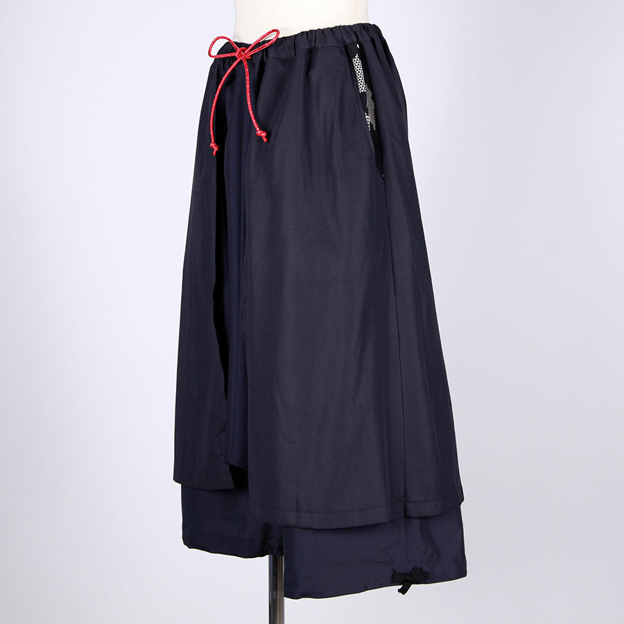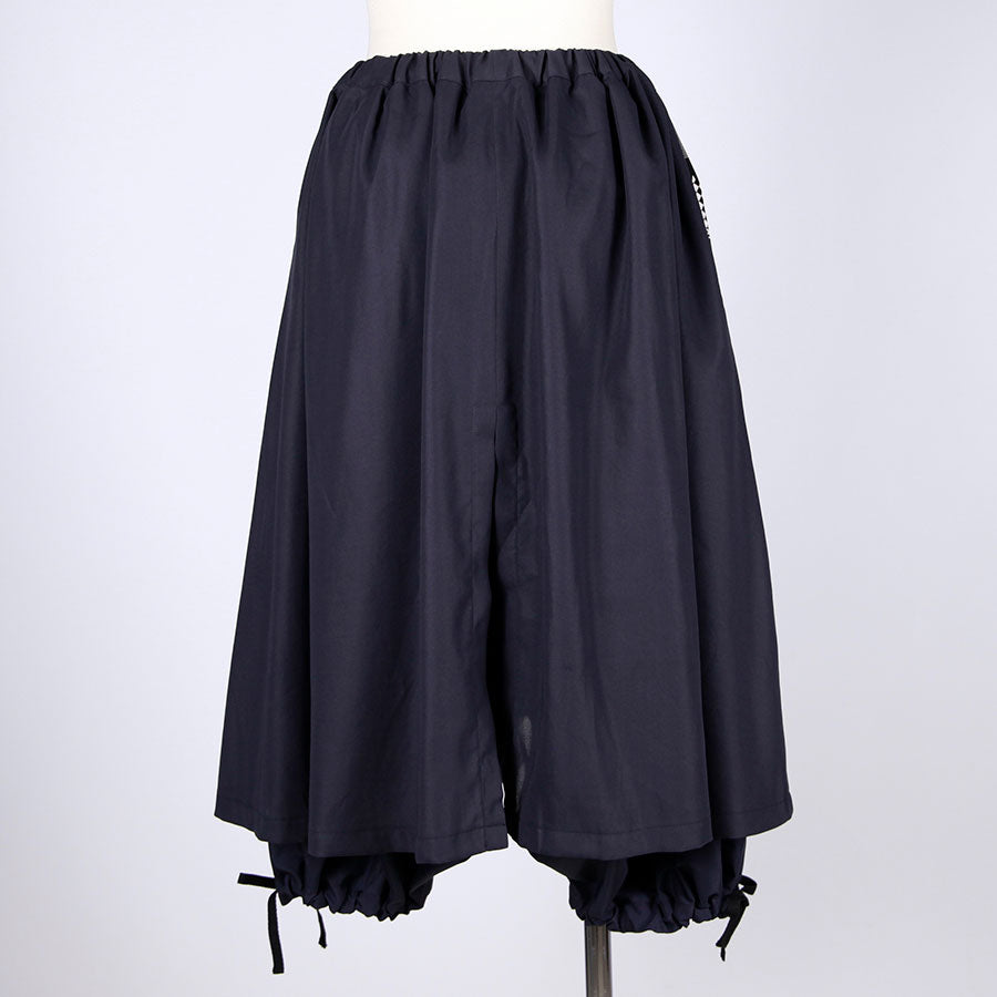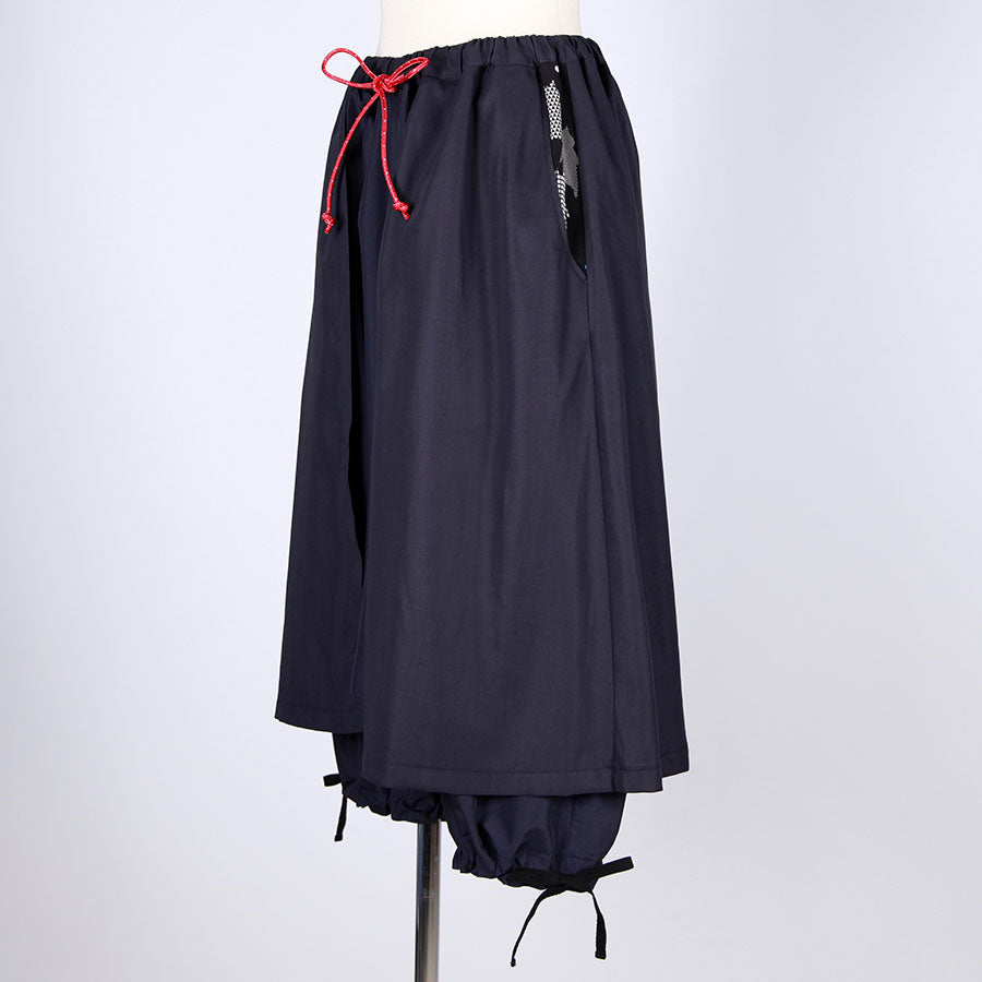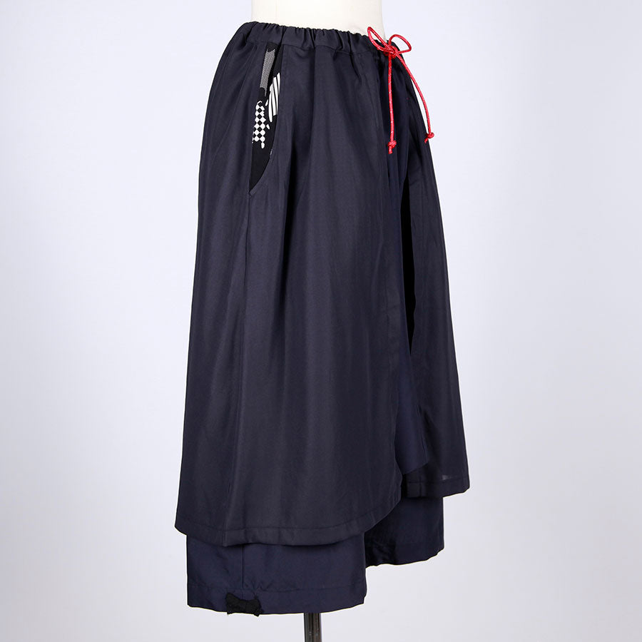定番のバルーンワイドパンツをベースにオーバースカートをドッキングさせたインパクトのあるデザインのパンツ。