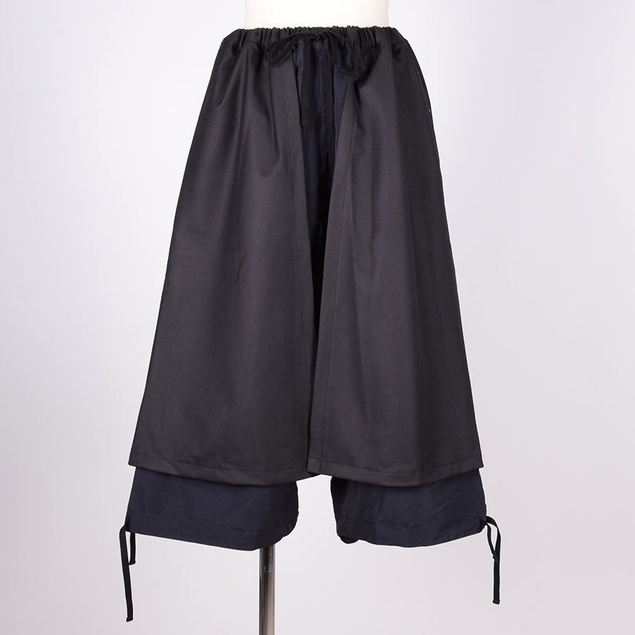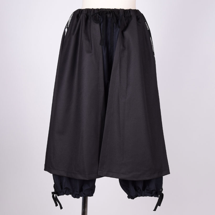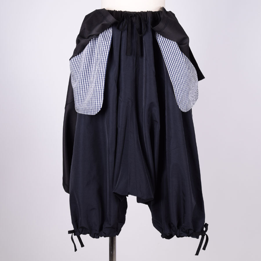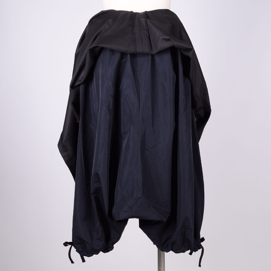 定番のバルーンワイドパンツをベースにオーバースカートをドッキングさせたインパクトのあるデザインのパンツ。