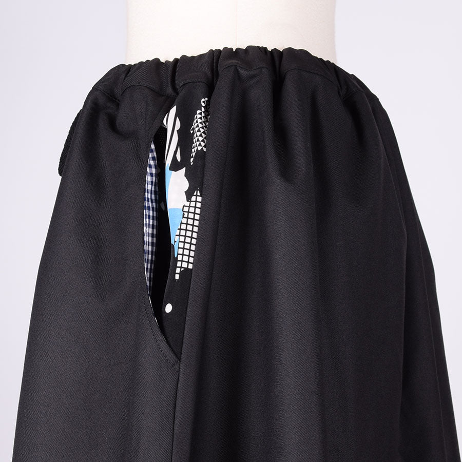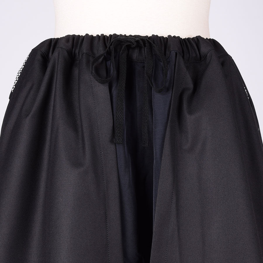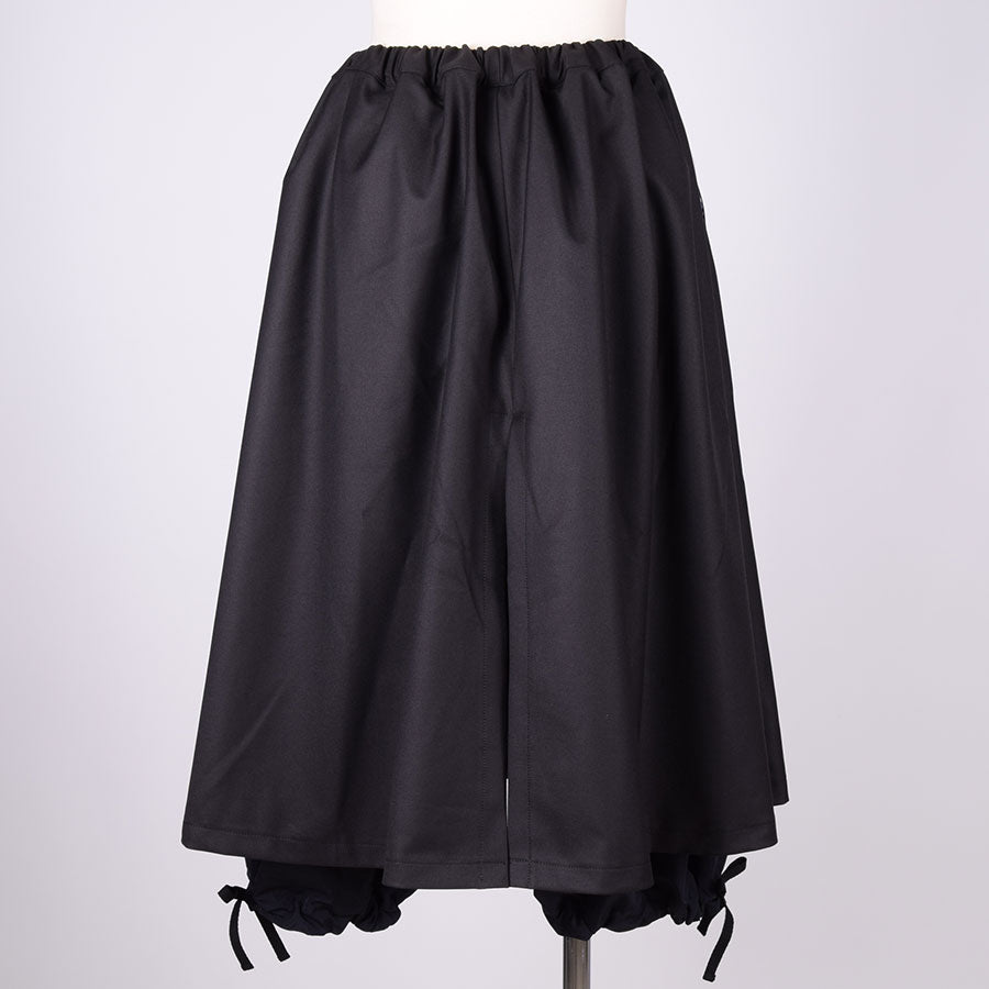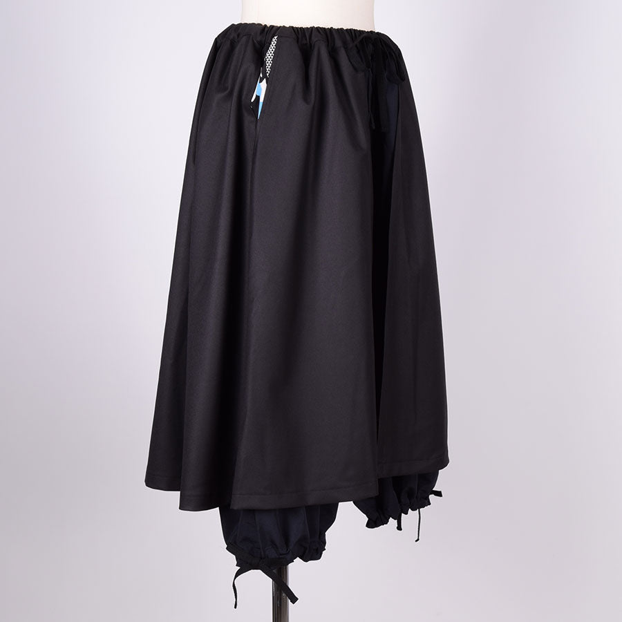 定番のバルーンワイドパンツをベースにオーバースカートをドッキングさせたインパクトのあるデザインのパンツ。
