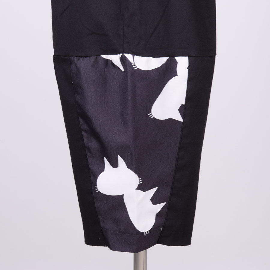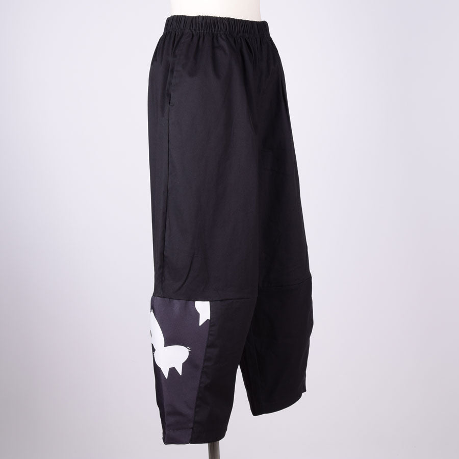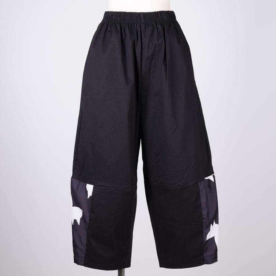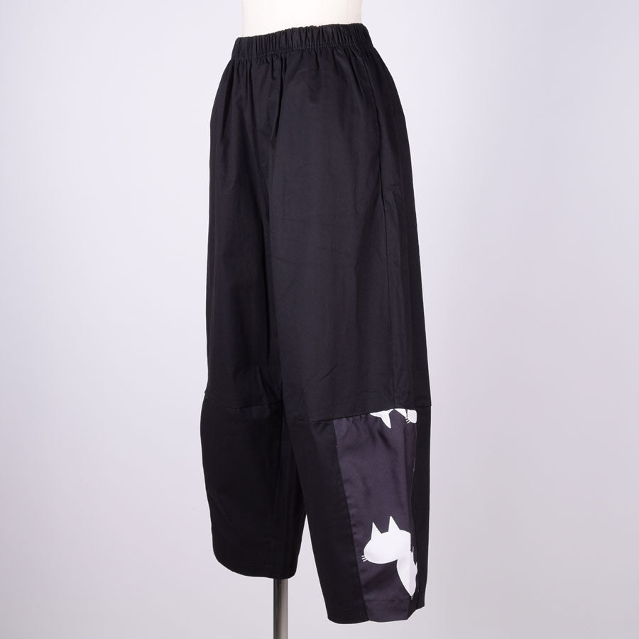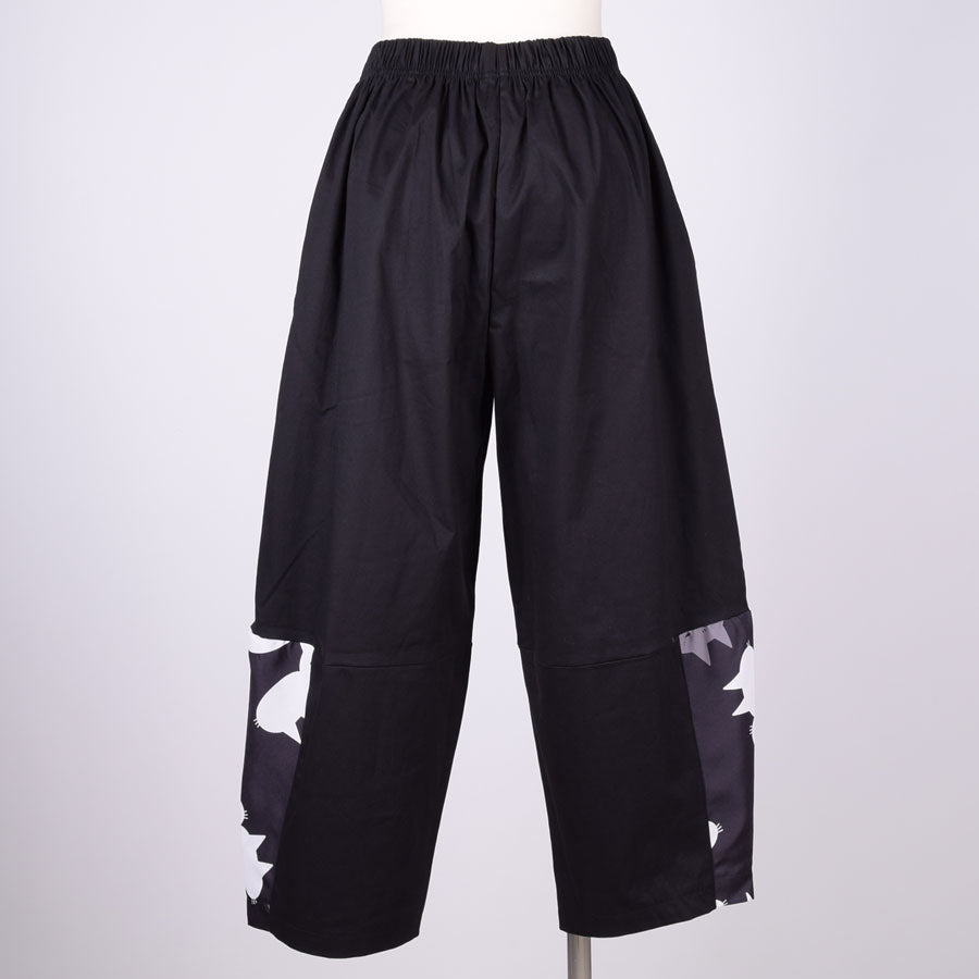 裾の一部分をオリジナルテキスタイルで切り替えたバレルシルエットのパンツ。