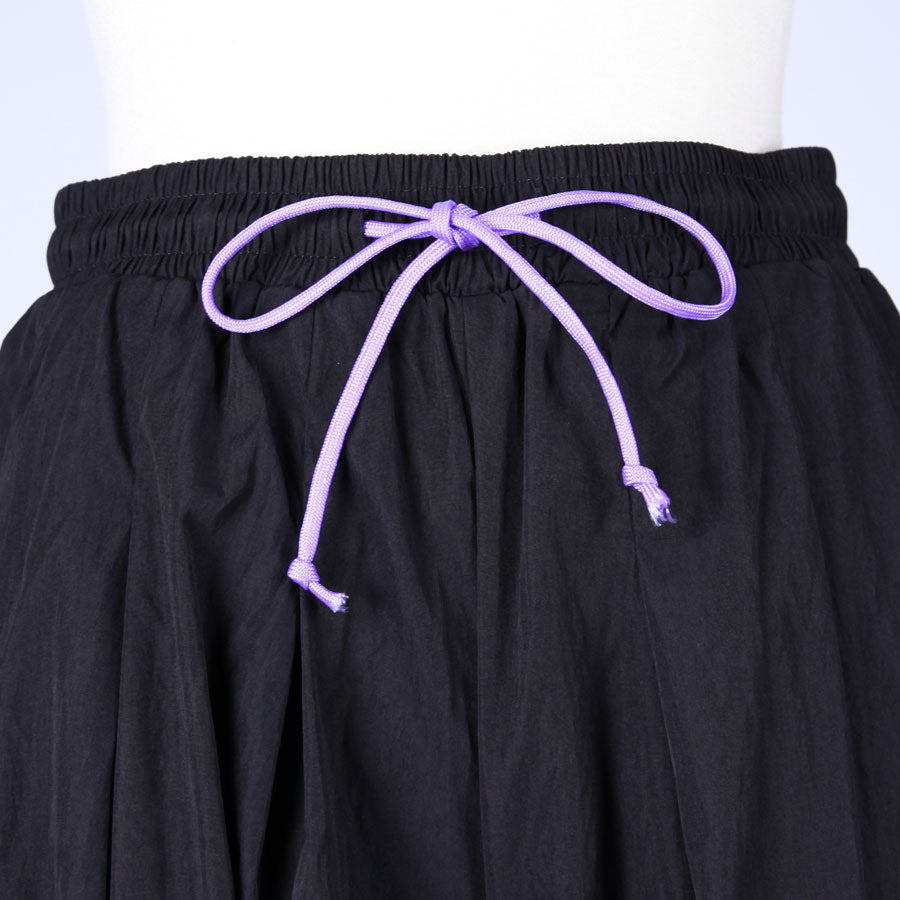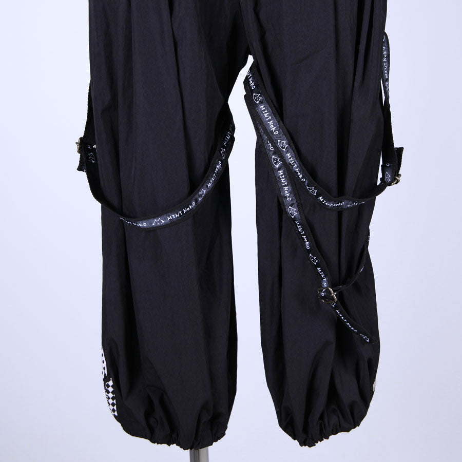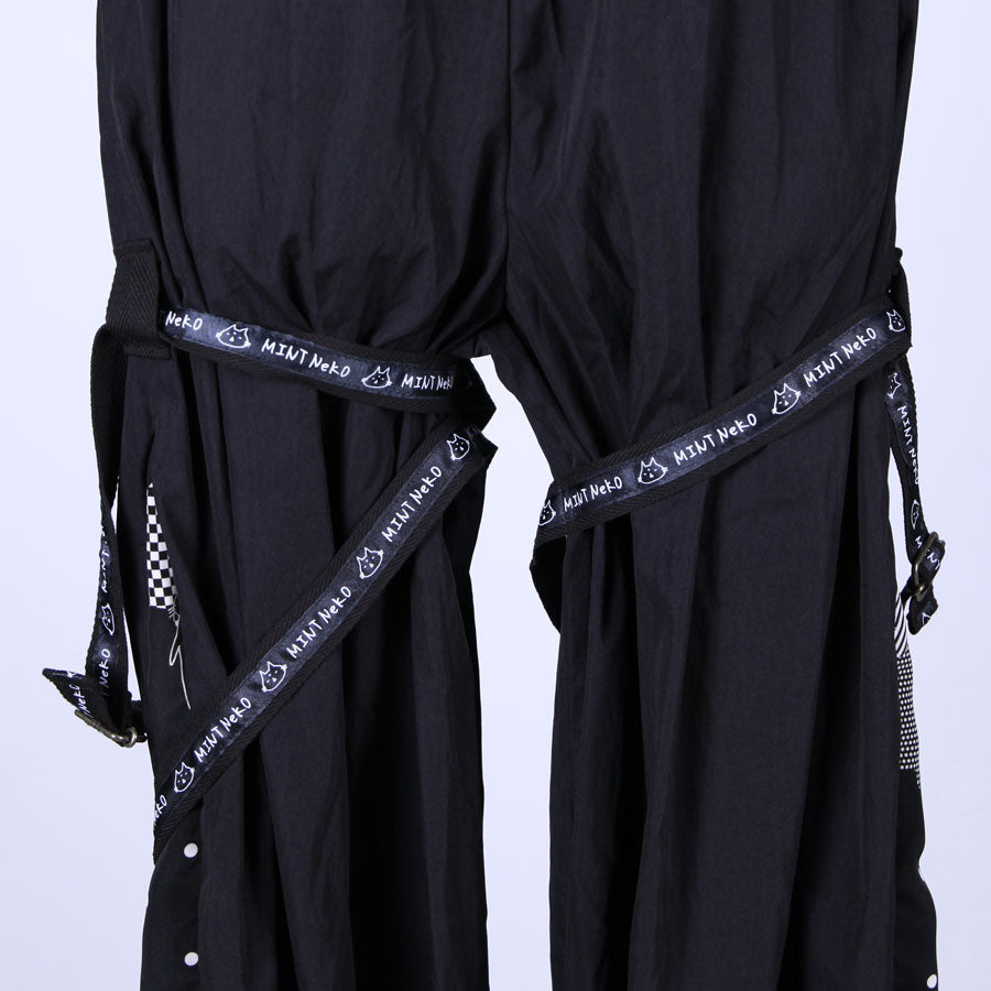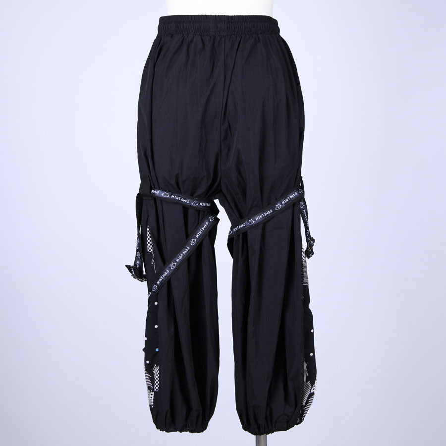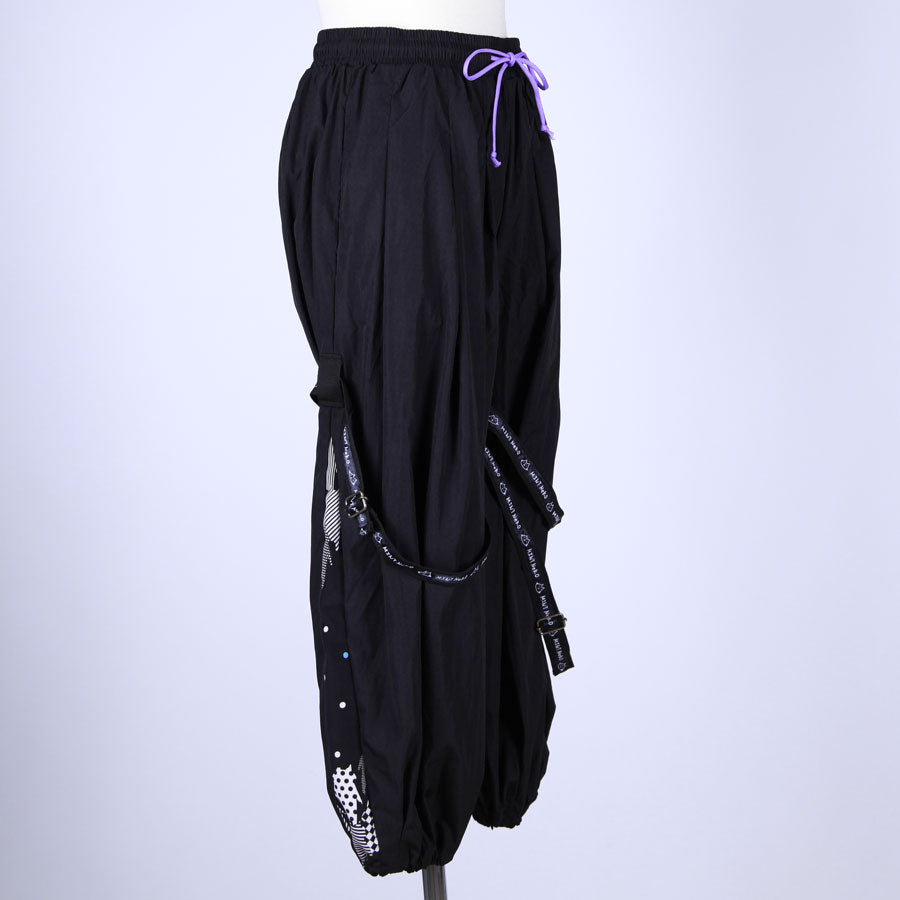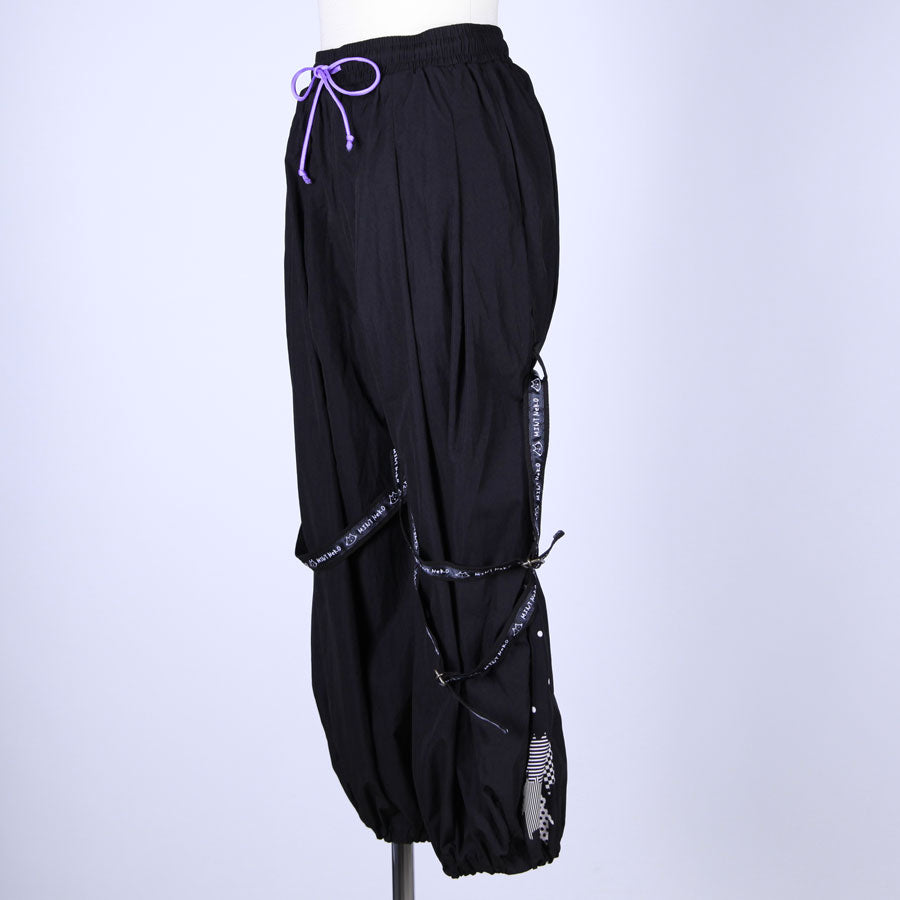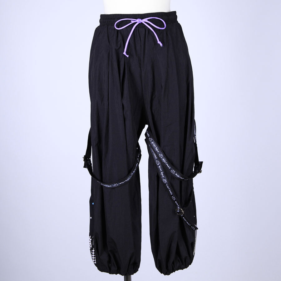 飾りベルトをアシンメトリーに垂れ下がらせた装飾性の高いワイドパンツ。
