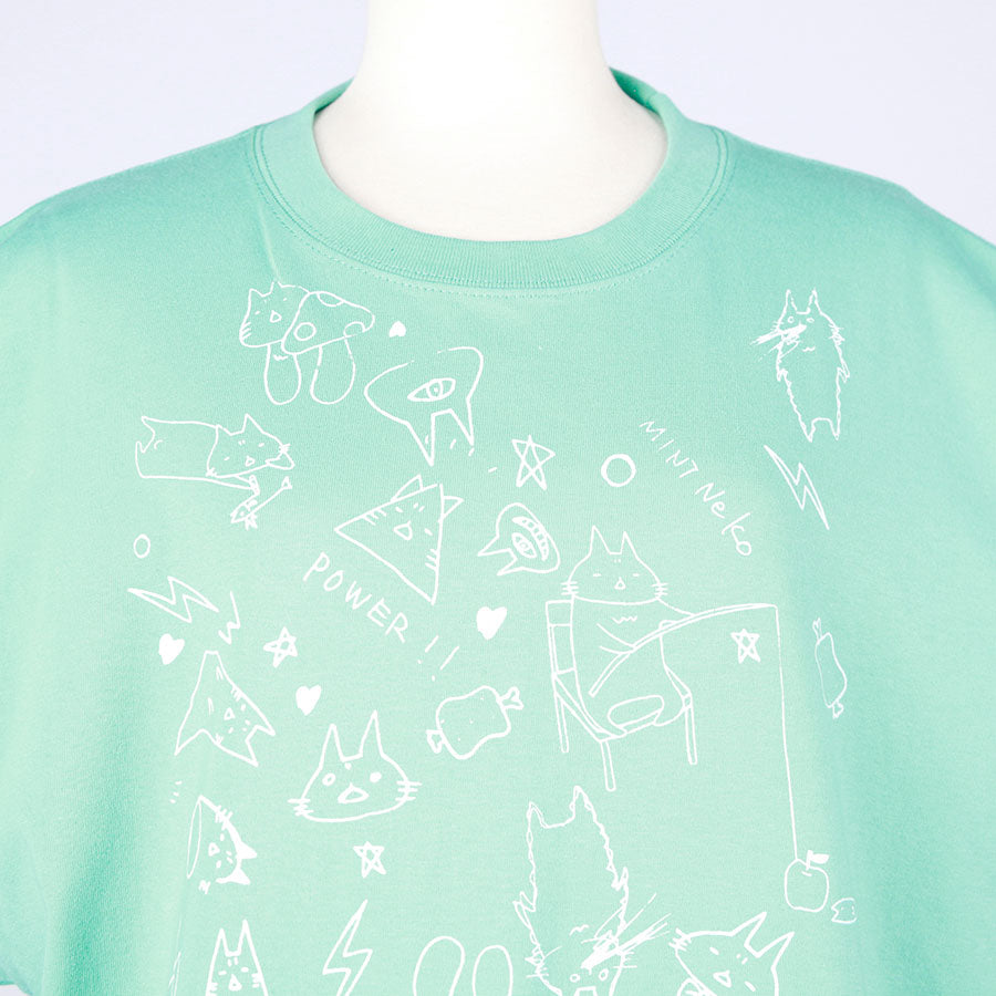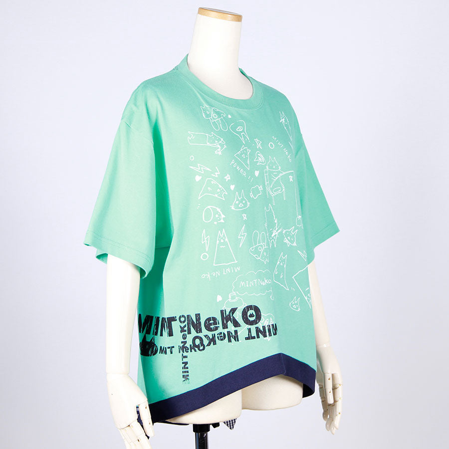 フロントにはラクガキ調のグラフィックとロゴがシルクスクリーンでハンドプリントされており1点ずつ違う表情に仕上げています。