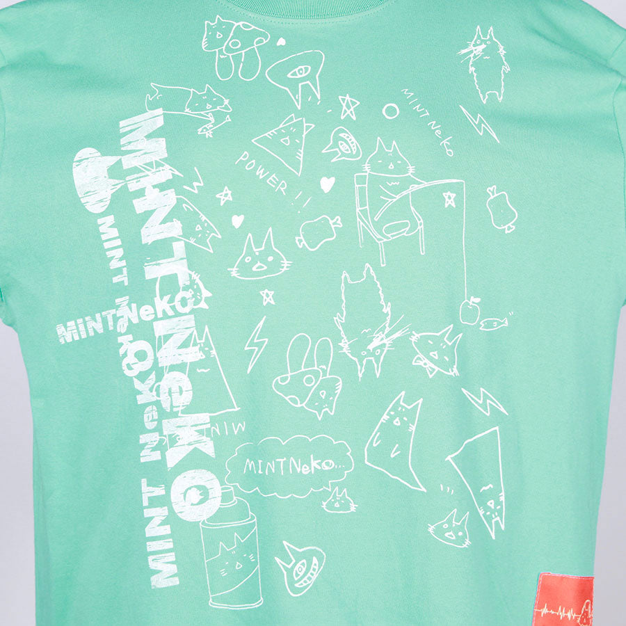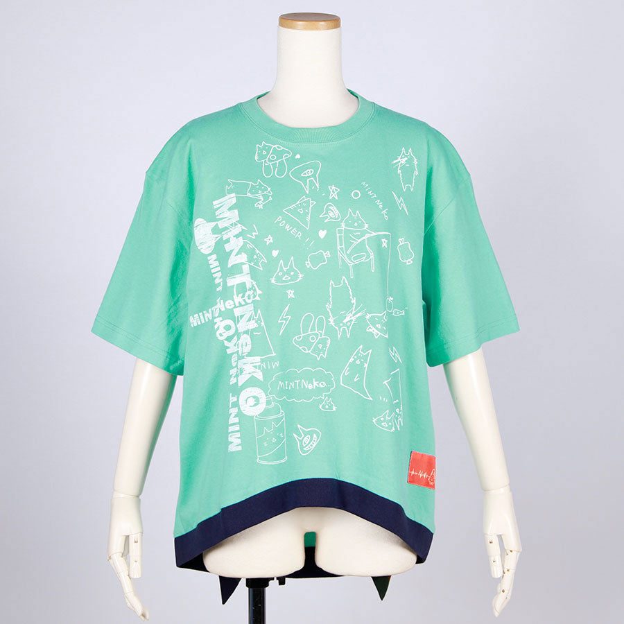 フロントにはラクガキ調のグラフィックとロゴがシルクスクリーンでハンドプリントされており1点ずつ違う表情に仕上げています。