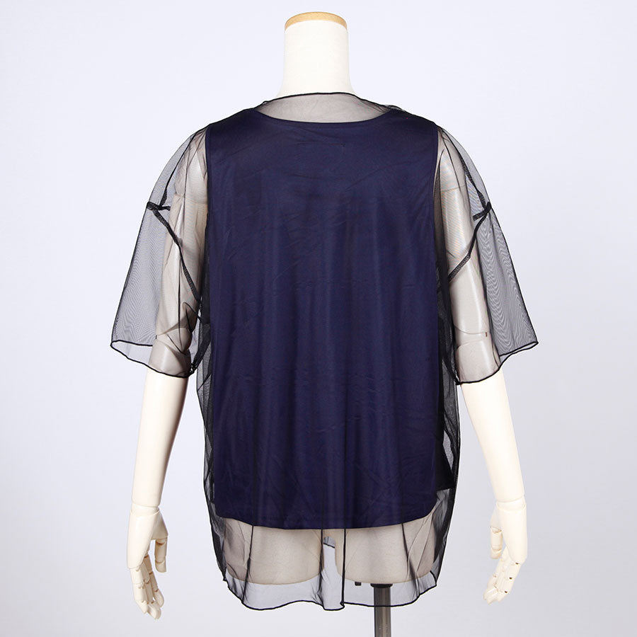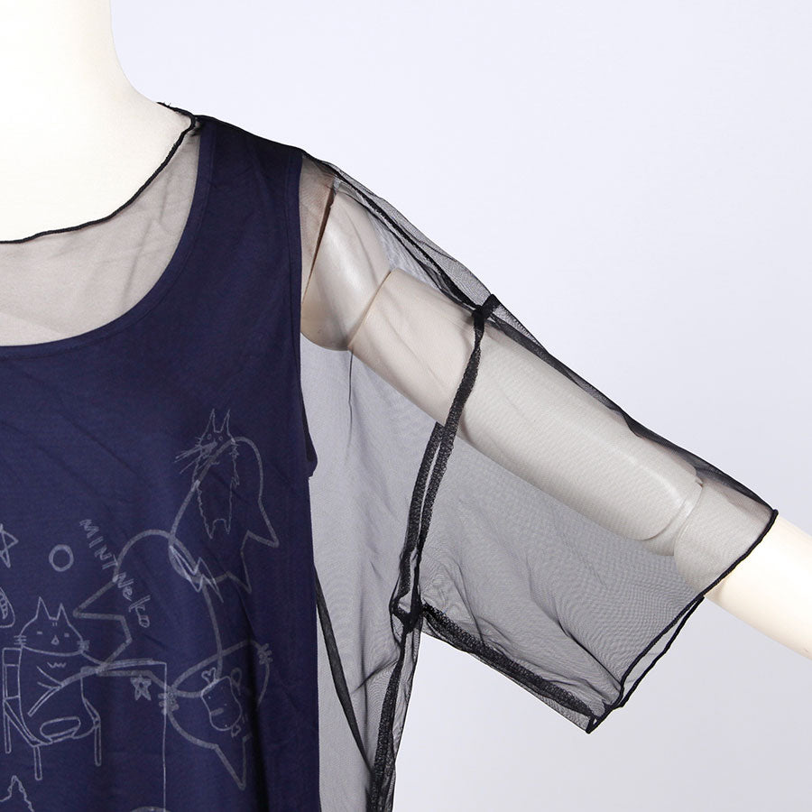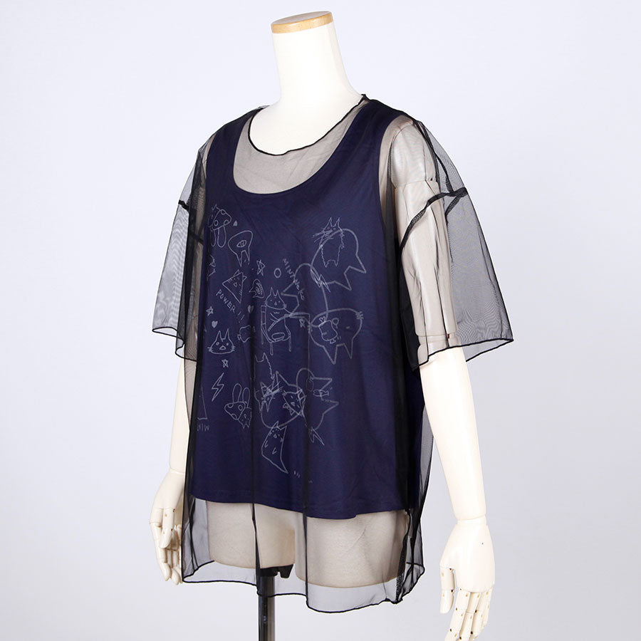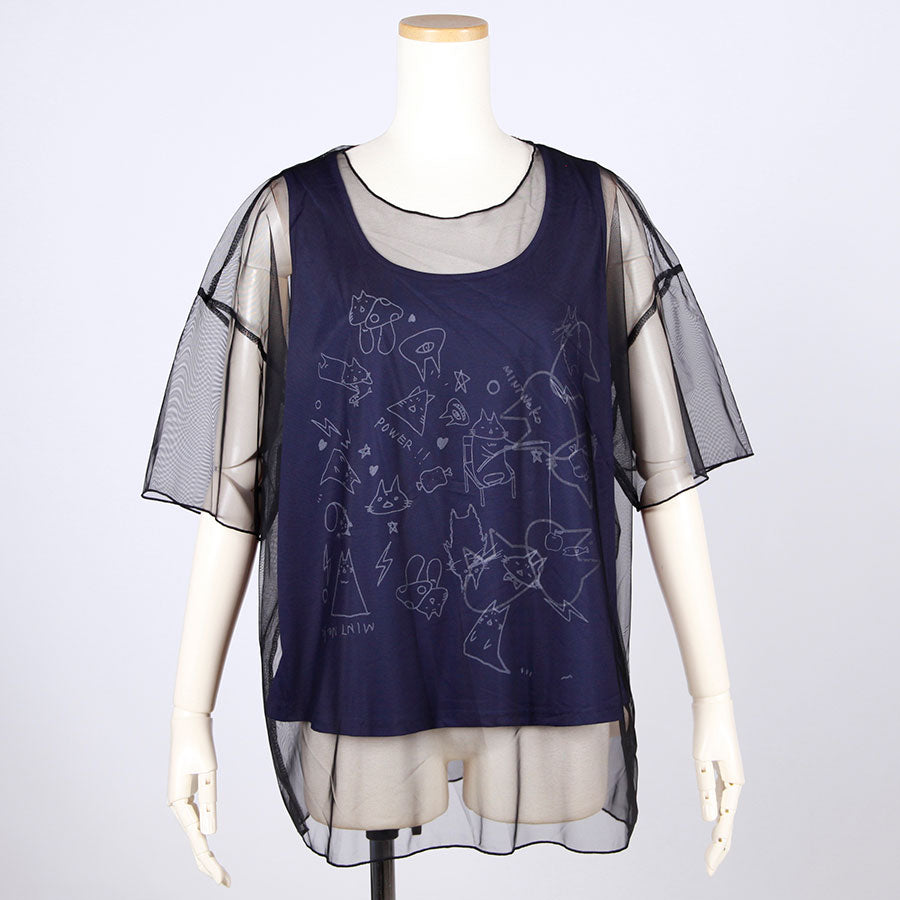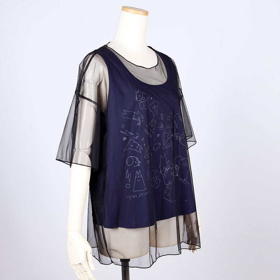 プリント入りのタンクトップに、シースルー素材のカットソーを重ねたトップス。