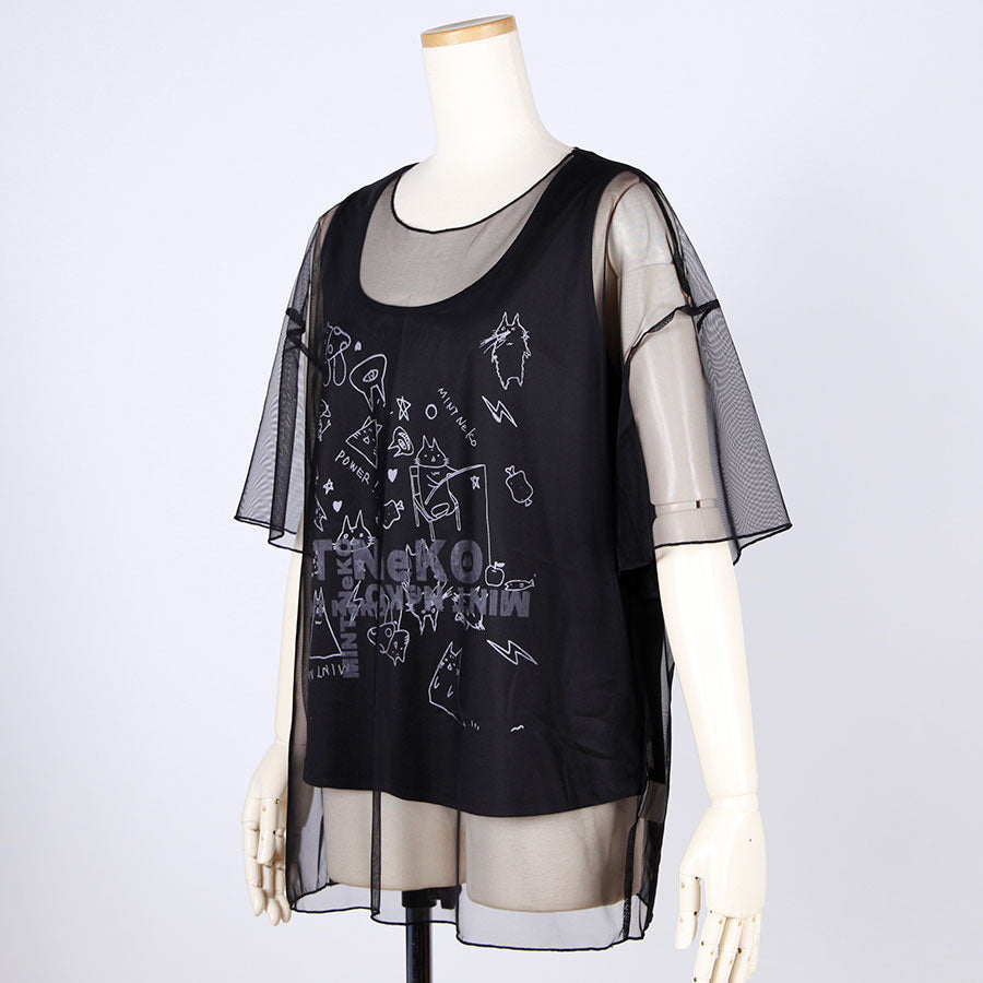 プリント入りのタンクトップに、シースルー素材のカットソーを重ねたトップス。