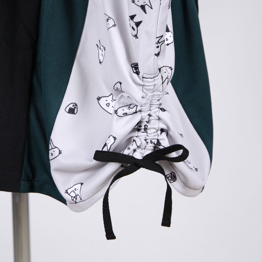 脇に通した紐を引くことでギャザーを寄せることができ、コーディネートに合わせて形を変えて楽しむこともできます。